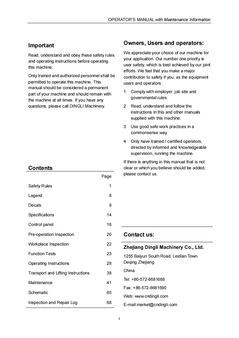IADVANCEDACCESS PLATFORMSSELF-PROPELLED SCISSOR LIFTSOPERATOR'S MANUALwith Maintenance Information(For JCPT1218DC/JCPT1418DC)DingiJCPT1418DCDGAmWARNINGTHE MANUFAC TURER SHALL NOT BE HELD LIABLEIN CASE OF FAULTSDO NOT OPERATE THIS MACHINE UNTIL YOU READ AND UNDERSTANDALL THE DANGERS,WAR NINGS AND CAUTIONS IN THIS MANUALPart Number:SM0116113 Rev1.4ceZhejiang Dingli Machinery Co.,LtdFirst Edition,February 2021 Printing