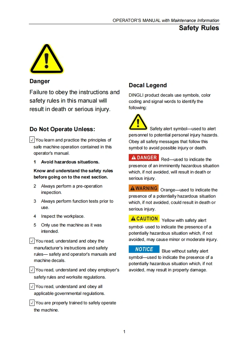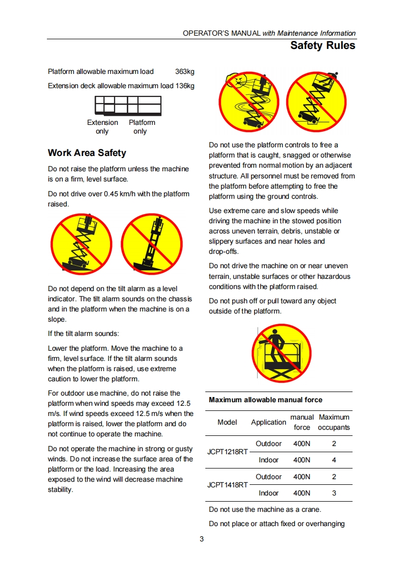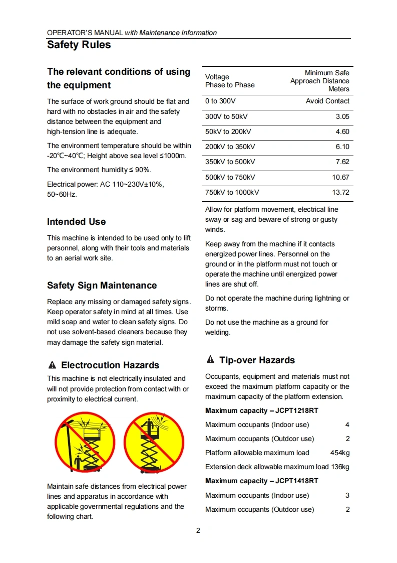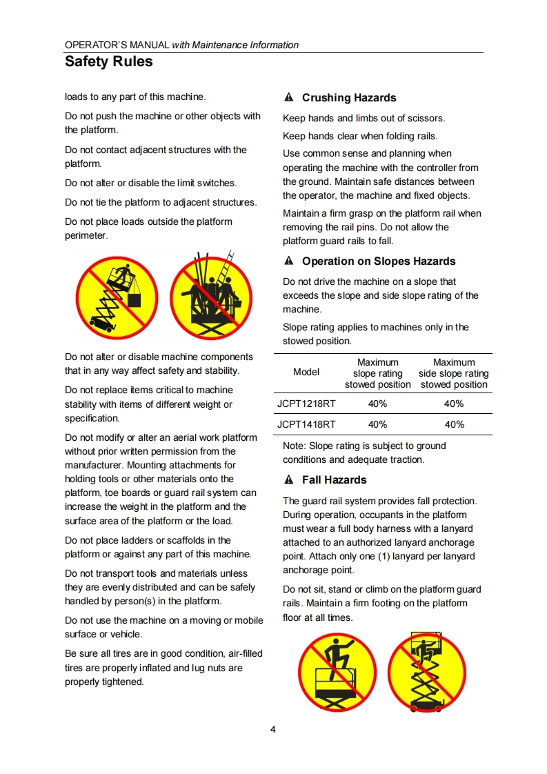 ADVANCEDACCESS PLATFORMSSELF-PROPELLED ROUGH-TERRAIN SCISSOR LIFTSOPERATOR'S MANUALwith Maintenance Information(For JCPT1218RT JCPT1418RT)DingJCPT1218RTDingeR2WcE IPAFamWARNINGTHE MANUFAC TURER SHALL NOT BE HELD LIABLE IN CASE OF FAULTSOR ACCIDENTS DUE TO NEGLIGENCE,INCAPACITY,INSTALLATION BYUNQUALIFIED TECHNICIANS AND IMPROPER USE OF THE MACHINEDO NOT OPERATE THIS MACHINE UNTIL YOU READ AND UNDERSTANDALL THE DAN GER S,WAR NINGS AND CAUTIONS IN THIS MANUALPart Number:SM0116111 Rev2.2CEZhejiang Dingli Machinery Co.,Ltd.Second Edition,February 2021 Printing
