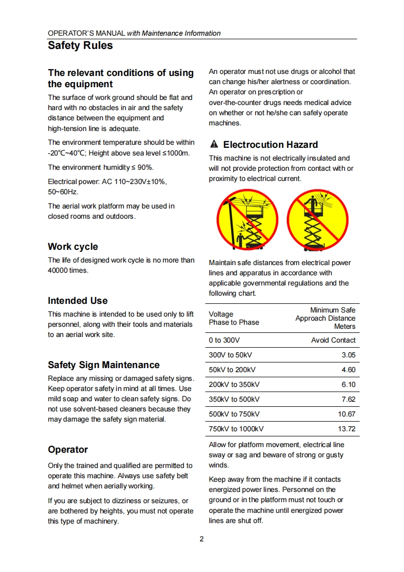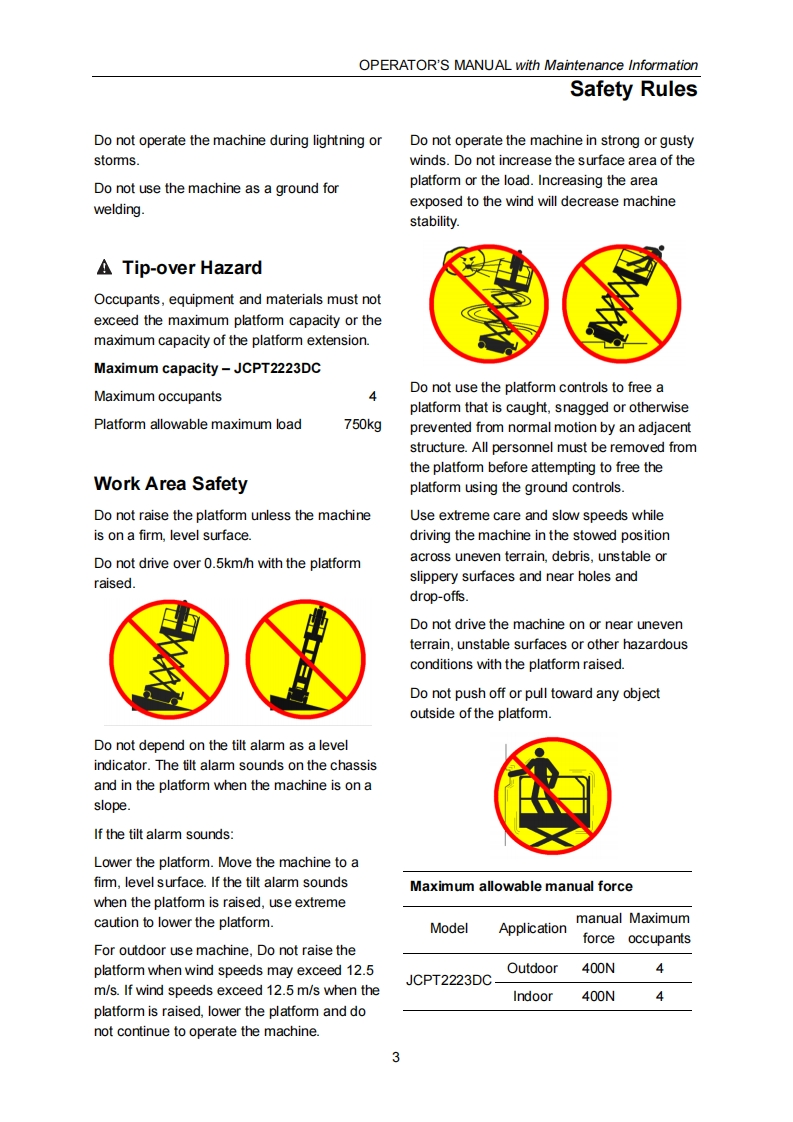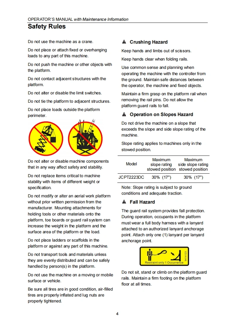 ADVANCEDACCESS PLATFORMSSELF-PROPELLED ROUGH-TERRAIN SCISSOR LIFTSOPERATOR'S MANUALwith Maintenance InformationFor JCPT2223DC)JCPT2223DC90eaTWARNINGTHE MANUFACTURER SHALL NOT BE HELD LIABLE IN CASE OF FAULTSOR ACCIDENTS DUE TO NEGLIGENCE,INCAPACITY,INSTALLATION BYUNQUALIFIED TECHNICIANS AND IMPROPER USE OF THE MACHINEDO NOT OPERATE THIS MACHINE UNTIL YOU READ AND UNDERSTANDALL THE DANGERS,WARNINGS AND CAUTIONS IN THIS MANUALPart Number:SM0120111 Rev1.2CEZhejiang Dingli Machinery Co.,Ltd.First Edition,April 2021 Printing