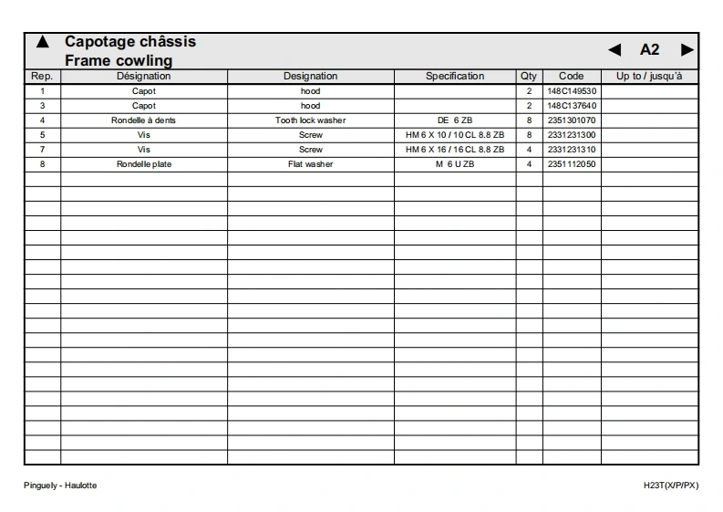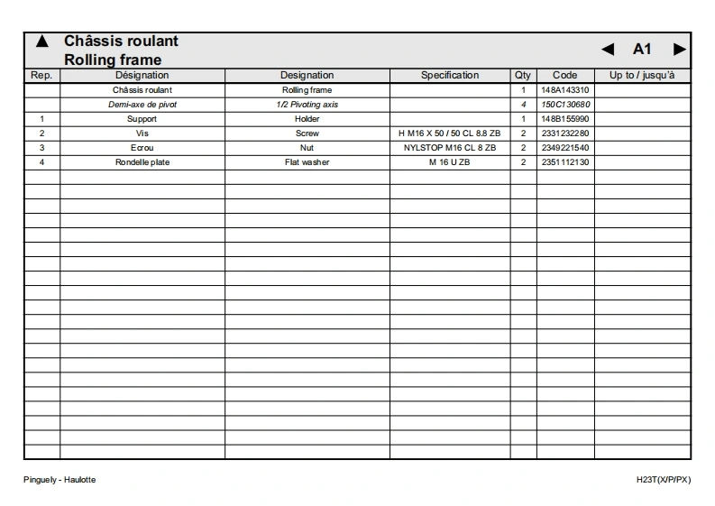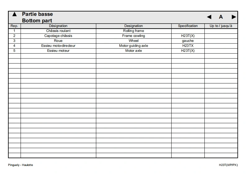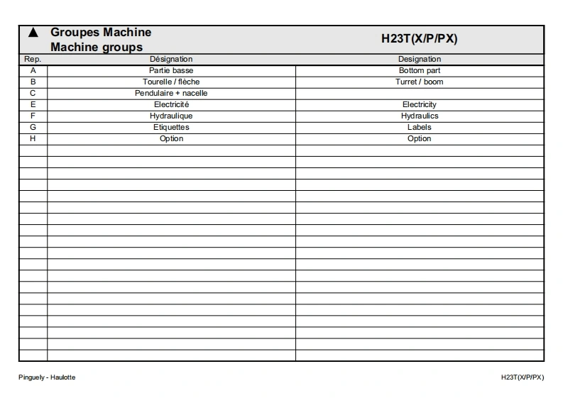 Pinguely HaulotteH23T(X/P/PX)FPieces de rechange2420315920GBSpare partsDErsatzteileNLOnderdelenE12.00DKReservedeleEPiezas de repuestoPezzi di ricambioPecas sobressalentesReservdelLa PeronniereTelephone:(33)0477292424BP9SFFax SAV:(33)0477312811Varaosa42152 L'HORMEIntemnet:http:/www.haulotte.comFRANCEE-Mail haulotte@haulotte.com(∈