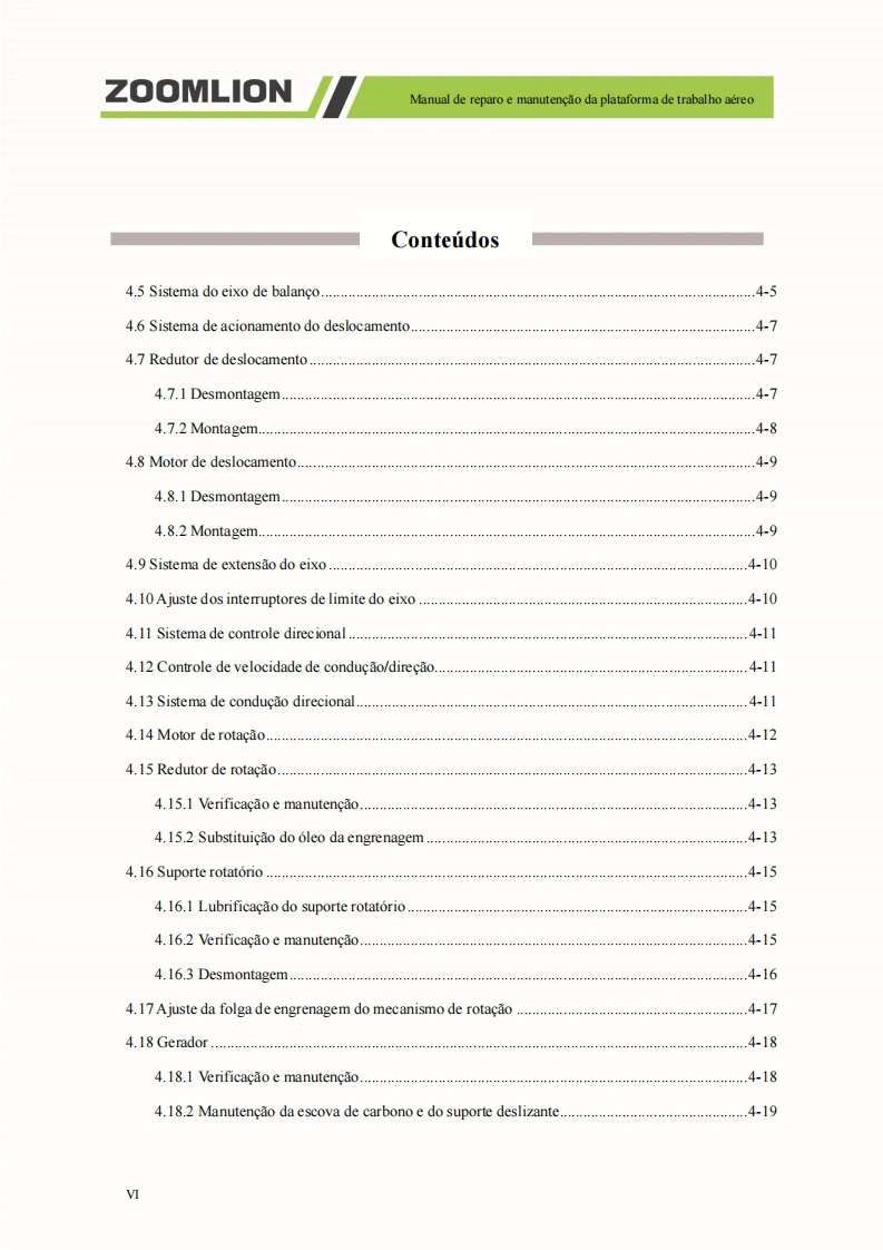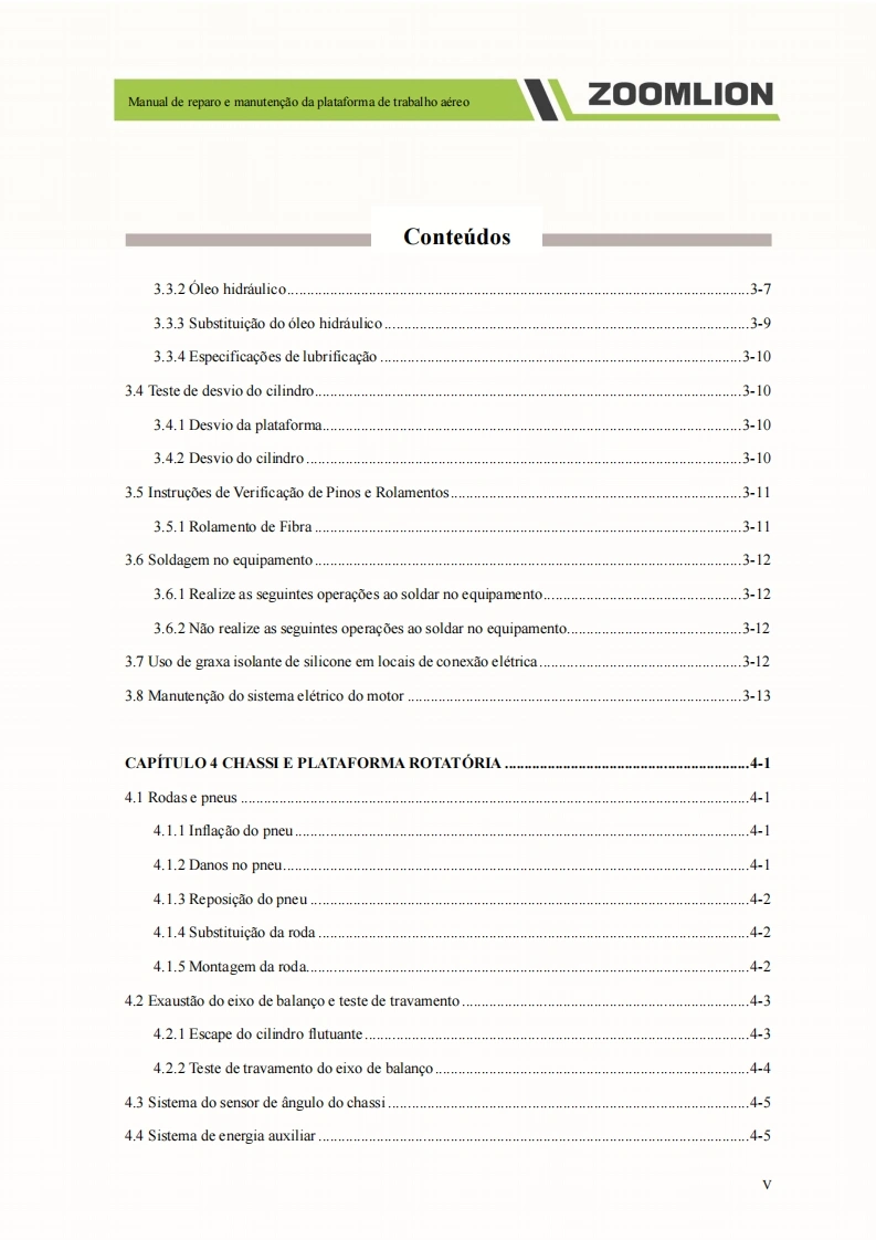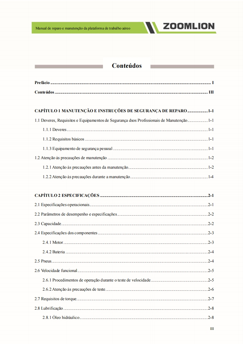 Manual de reparo e manutencao da plataforma de trabalho aereoZOOMLIONPrefacioO presente manual de reparacao e manutencao aplica-se a plataforma de trabalho aerea ZT42J(doravante denominada plataforma de trabalho aerea).O presente manual de reparo e manutencao descreve os metodos de verificacao e manutencao deplataformas de trabalho aereas adequadas.Os usuarios devem entender e aplicar completamente oconteudo descrito neste manual para maximizar o desempenho e garantir o uso seguro e eficiente alongo prazo desta plataforma de trabalho aereo.O presente manual nao cobre o uso e manutencao domotor.Consulte o manual de instrucoes do motor fornecido com o veiculo para detalhes sobre o mesmo.O presente manual inclui a estrutura e o diagrama esquematico dos componentes principais destaplataforma de trabalho aerea.O codigo do material das pecas de reposicao necessarias pode serencontrado no Manual de Pecas caso seja necessario reparar e substituir algum dos componentes.O presente manual bem como outros documentos tecnicos anexados ao veiculo deve ser consideradospartes permanentes da sua maquina e devem permanecer junto da mesma durante a vida util do produtocomo uma base necessaria para a sua manutencao e uso da plataforma de trabalho aerea.AATENCAOPor favor,nao repare as pecas do manual sinalizadas com manutencao profissional semautorizacao.Nossa empresa nao se responsabiliza pelas consequencias adversas decorrentes dereparos e manutencao discordantes do presente manualΛALERTAOs usuarios devem seguir o principal criterio que e:seguranca em primeiro lugar!Preste atencaoespecial ao dispositivo de controle de seguranca para verificacao regular da plataforma detrabalho aerea.Nao force a maquina quando o dispositivo de seguranca falhar ou funcionar deforma anormal.Nao modifique a estrutura nem adicione pecas adicionais para mais funcoes.Caso contrario,isso afetara a seguranca de toda a maquina e voce sera responsavel por qualquerferime nto pessoal,morte ou danos causados pela modificacao nao autorizada..O periodo de garantia da plataforma de trabalho aereo se dara conforme especificado no presenteManual de Reparo e Manutencao.Os profissionais de nossa empresa virao para o servico ou irao para oponto de reparo designado por nossa empresa para prestar reparos e manutencao quando a realizacaodos mesmos for necessaria.Nos reservamos ao direito de revisar continuamente o conteudo do presente manual commelhoramentos tecnicos.Esperamos a compreensao de todos os usuarios caso alteracoes sejamrealizadas sem aviso previo.Algumas das imagens do presente manual podem nao corresponder ao