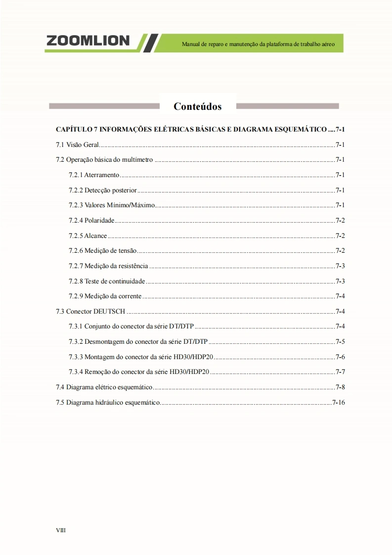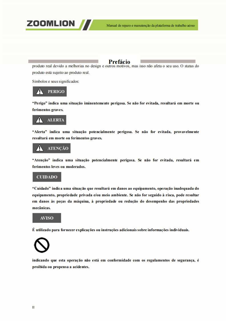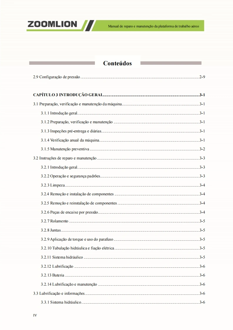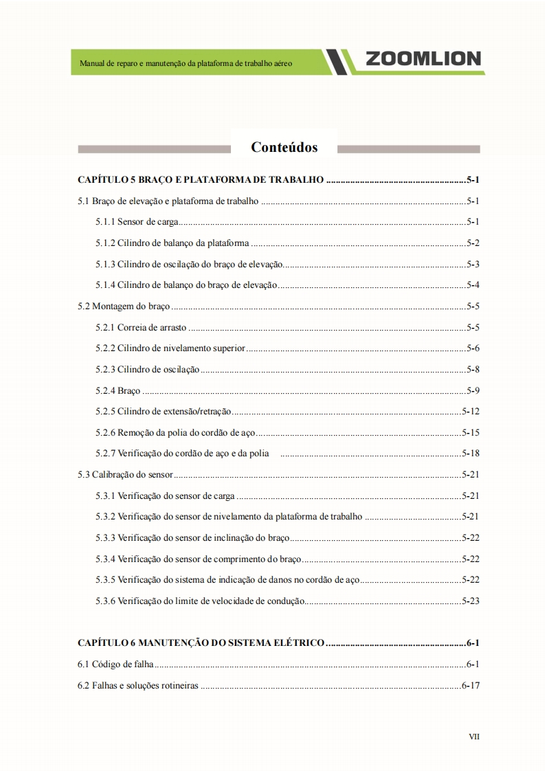 Manual de reparo e manutencao da plataforma de trabalho aereoZOOMLIONPrefacioO presente manual de reparacao e manutencao aplica-se a plataforma de trabalho aerea ZT42J(doravante denominada plataforma de trabalho aerea).O presente manual de reparo e manutencao descreve os metodos de verificacao e manutencao deplataformas de trabalho aereas adequadas.Os usuarios devem entender e aplicar completamente oconteudo descrito neste manual para maximizar o desempenho e garantir o uso seguro e eficiente alongo prazo desta plataforma de trabalho aereo.O presente manual nao cobre o uso e manutencao domotor.Consulte o manual de instrucoes do motor fornecido com o veiculo para detalhes sobre o mesmo.O presente manual inclui a estrutura e o diagrama esquematico dos componentes principais destaplataforma de trabalho aerea.O codigo do material das pecas de reposicao necessarias pode serencontrado no Manual de Pecas caso seja necessario reparar e substituir algum dos componentes.O presente manual bem como outros documentos tecnicos anexados ao veiculo deve ser consideradospartes permanentes da sua maquina e devem permanecer junto da mesma durante a vida util do produtocomo uma base necessaria para a sua manutencao e uso da plataforma de trabalho aerea.AATENCAOPor favor,nao repare as pecas do manual sinalizadas com manutencao profissional semautorizacao.Nossa empresa nao se responsabiliza pelas consequencias adversas decorrentes dereparos e manutencao discordantes do presente manualΛALERTAOs usuarios devem seguir o principal criterio que e:seguranca em primeiro lugar!Preste atencaoespecial ao dispositivo de controle de seguranca para verificacao regular da plataforma detrabalho aerea.Nao force a maquina quando o dispositivo de seguranca falhar ou funcionar deforma anormal.Nao modifique a estrutura nem adicione pecas adicionais para mais funcoes.Caso contrario,isso afetara a seguranca de toda a maquina e voce sera responsavel por qualquerferime nto pessoal,morte ou danos causados pela modificacao nao autorizada..O periodo de garantia da plataforma de trabalho aereo se dara conforme especificado no presenteManual de Reparo e Manutencao.Os profissionais de nossa empresa virao para o servico ou irao para oponto de reparo designado por nossa empresa para prestar reparos e manutencao quando a realizacaodos mesmos for necessaria.Nos reservamos ao direito de revisar continuamente o conteudo do presente manual commelhoramentos tecnicos.Esperamos a compreensao de todos os usuarios caso alteracoes sejamrealizadas sem aviso previo.Algumas das imagens do presente manual podem nao corresponder ao