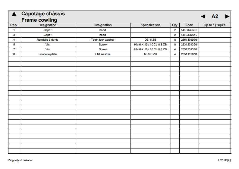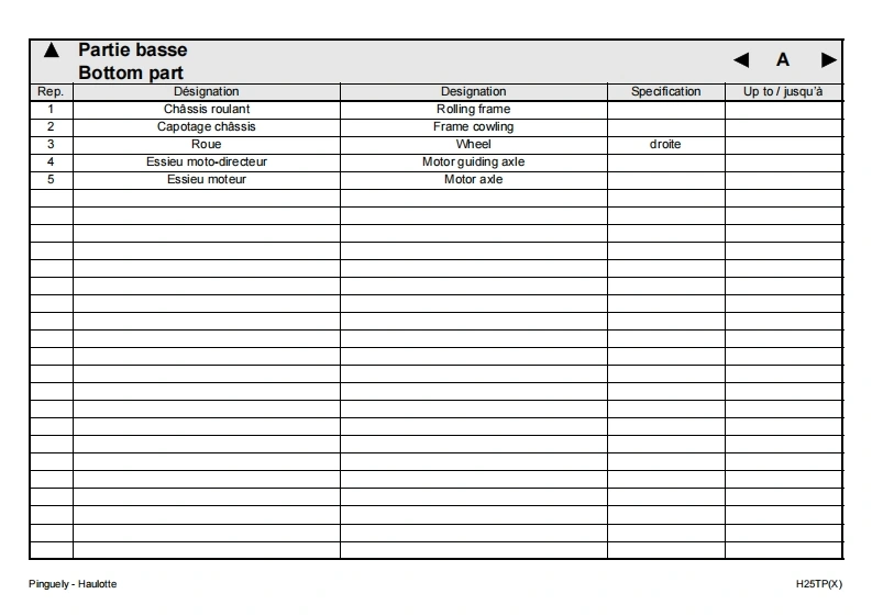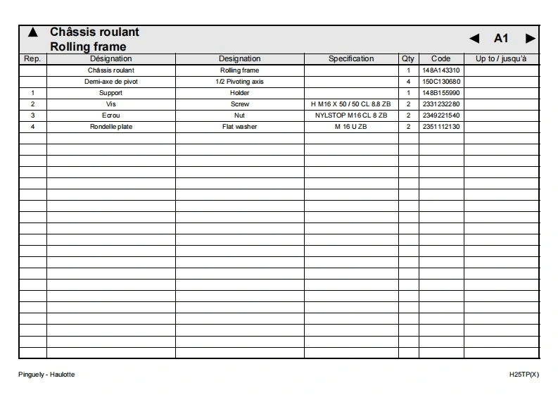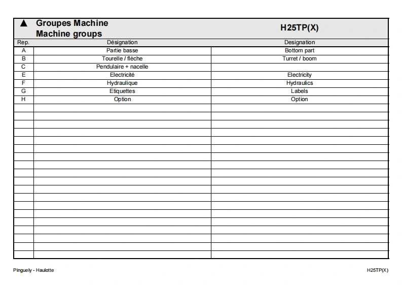 Pinguely HaulotteH25TP(X)FPieces de rechange2420315930GBSpare partsDErsatzteileNLOnderdelenDKReservedeleEPiezas de repuestoE.12.00Pezzi di ricambioPecas sobressalentesReservdelLa PeronniereTelephone:(33)0477292424BP9SFFax SAV:(330477312811Varaosa42152 L'HORMEIntemnet http:/www.haulotte.comFRANCEE-Mail haulotte@haulotte.com(∈
