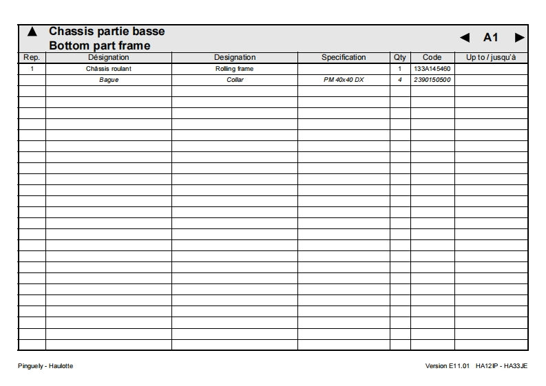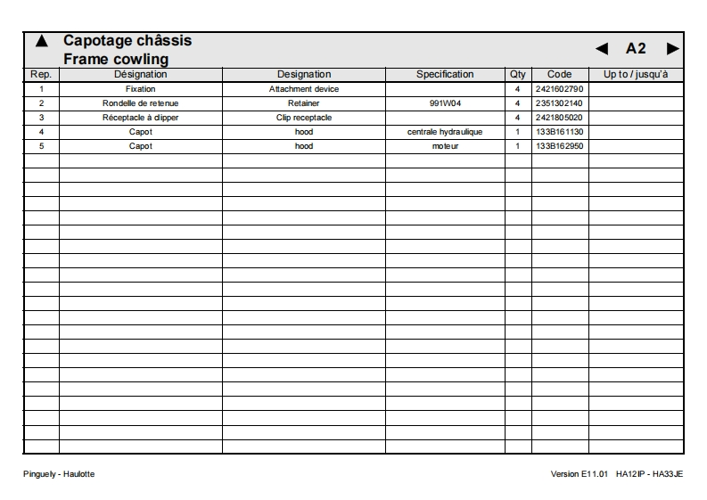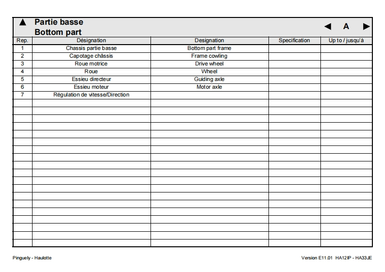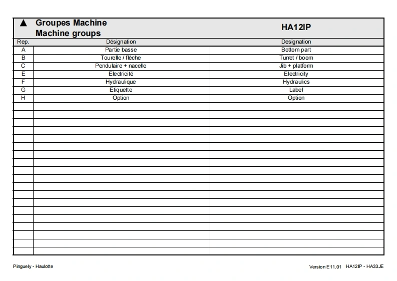 Pinguely HaulotteHA12IP-HA33JEFPieces de rechangeGBSpare parts2420317130DErsatzteileNLOnderdelenDKReservedeleEPiezas de repuestoPezzi di ricambioE11.01Pecas sobressalentesReservdelSFVaraosaLa PeronniereTelephone:(33)0477292424BP9Fax SAV:(33)047731281142152 L'HORMEIntemet http ://www.haulotte.comUSAParts manualFRANCEE-Mail haulotte@haulotte.com(∈
