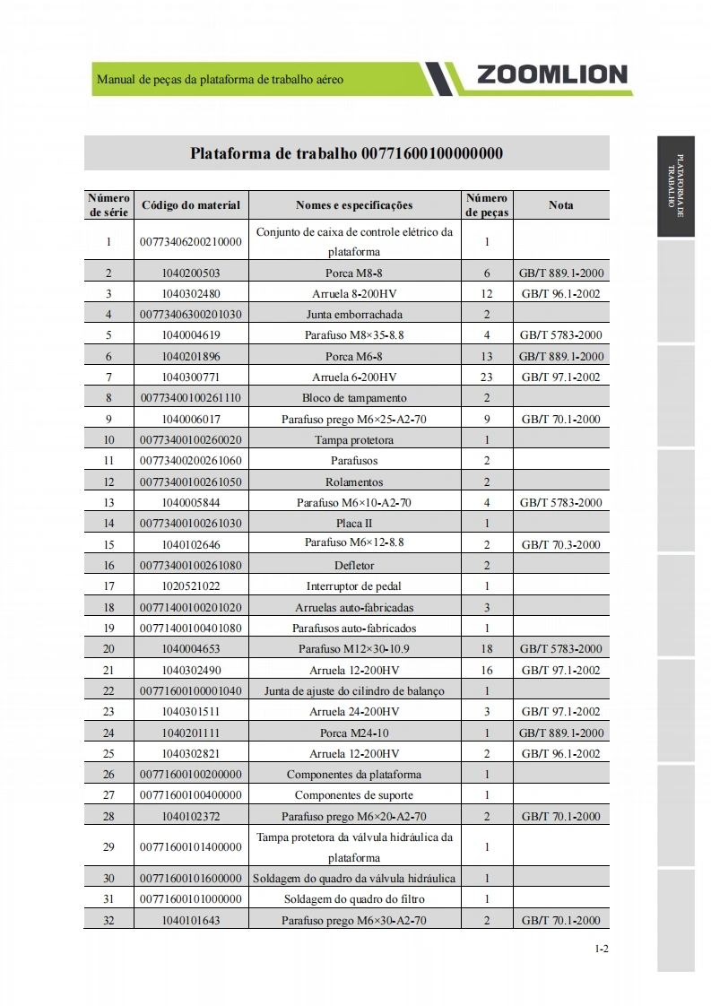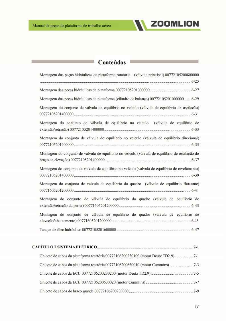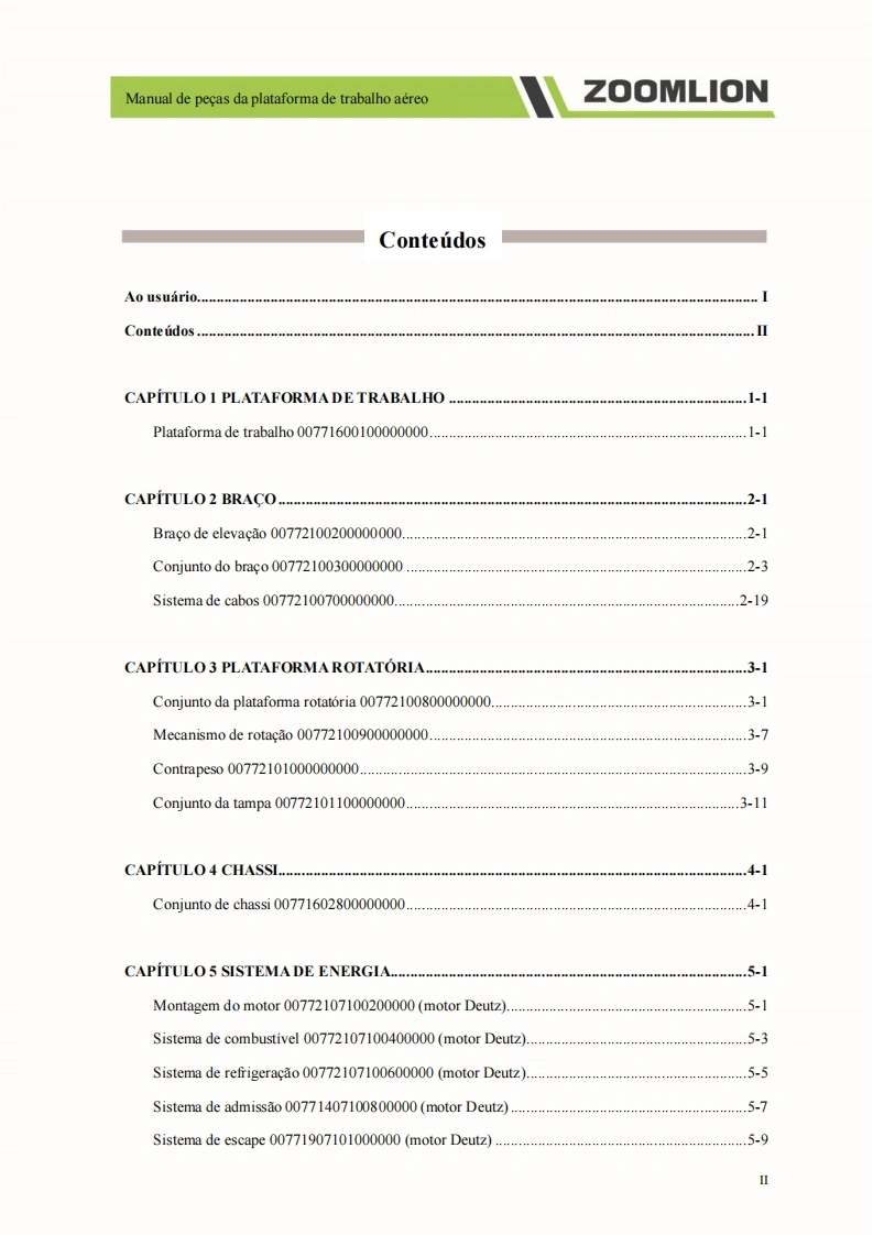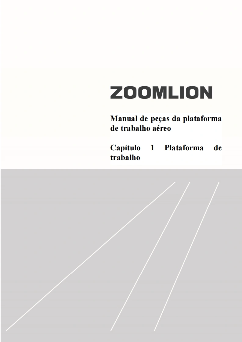 Manual de pecas da plataforma de trabalho aereoZOOMLION■A0 usuarioCaros usuarios,muito obrigado por escolher a plataforma de trabalho aereo de braco reto da"ZOOMLION".Antes de usar esta maquina,por favor leia e compreenda totalmente o conteudo destelivro e cumpra estritamente os regulamentos relevantes do livro.O presente manual apresenta em detalhes os componentes,parametros tecnicos importantes e outrosaspectos da plataforma de trabalho aereo de braco reto.Foi projetado para ajudar os usuarios a operarcom seguranca as plataformas aereas de trabalho de braco reto e melhorar a eficiencia durante aoperacao e manutencao.Guarde em local seguro o presente manual para que possa ser consultado aqualquer momento.Antes de ler e compreender o conteudo deste manual de cuidadosamente,nao tente realizar amanutencao ou reparar o produto.Caso possua alguma duvida ou pergunta,por favor,ligue para oengenheiro de servico local e forneceremos suporte tecnico eficaz e em tempo habil.Nossa empresa naose responsabiliza por quaisquer consequencias adversas decorrentes do uso que nao estejam emconformidade com o presente manual.O manual de pecas representa uma parte inseparavel e significativa do produto.Certifique de transferiro presente manual para o cessionario ao realizar a transferencia dessa maquina.O conteudo do presente manual de pecas e protegido por direitos de propriedade intelectual e nao podeser copiado ou usado para outros fins sem permissao.Devido a melhoria continua e atualizacao do design do produto e a diferenca nas especificacoes emodelos do produto,os detalhes de algumas imagens e textos contidos no presente manual podem serdiferentes do produto que voce possui.Caso possua alguma duvida,por favor,ligue para o engenheirode servico local.Nos reservamos ao direito de revisar o conteudo do presente manual de pecas com melhoramentostecnicos.Esperamos a compreensao de todos os usuarios caso alteracoes sejam realizadas sem avisoprevio.Muito obrigado pela sua confianca e apoio aos produtos da "ZOOMLION",desejamos-lhe sucessoHunan Zoomlion Intelligent Aerial Work Machinery Co.,Ltd.1