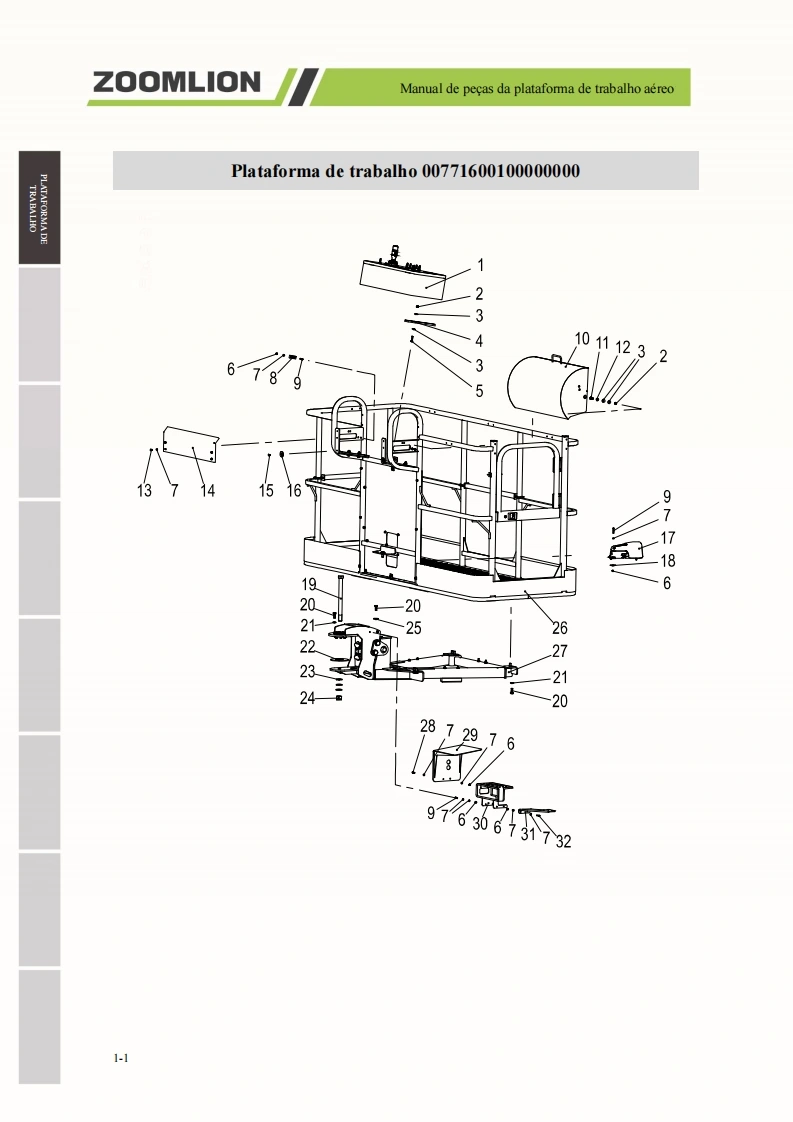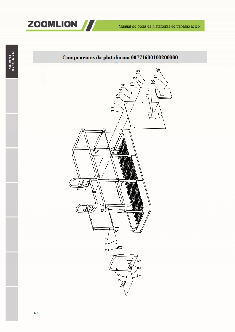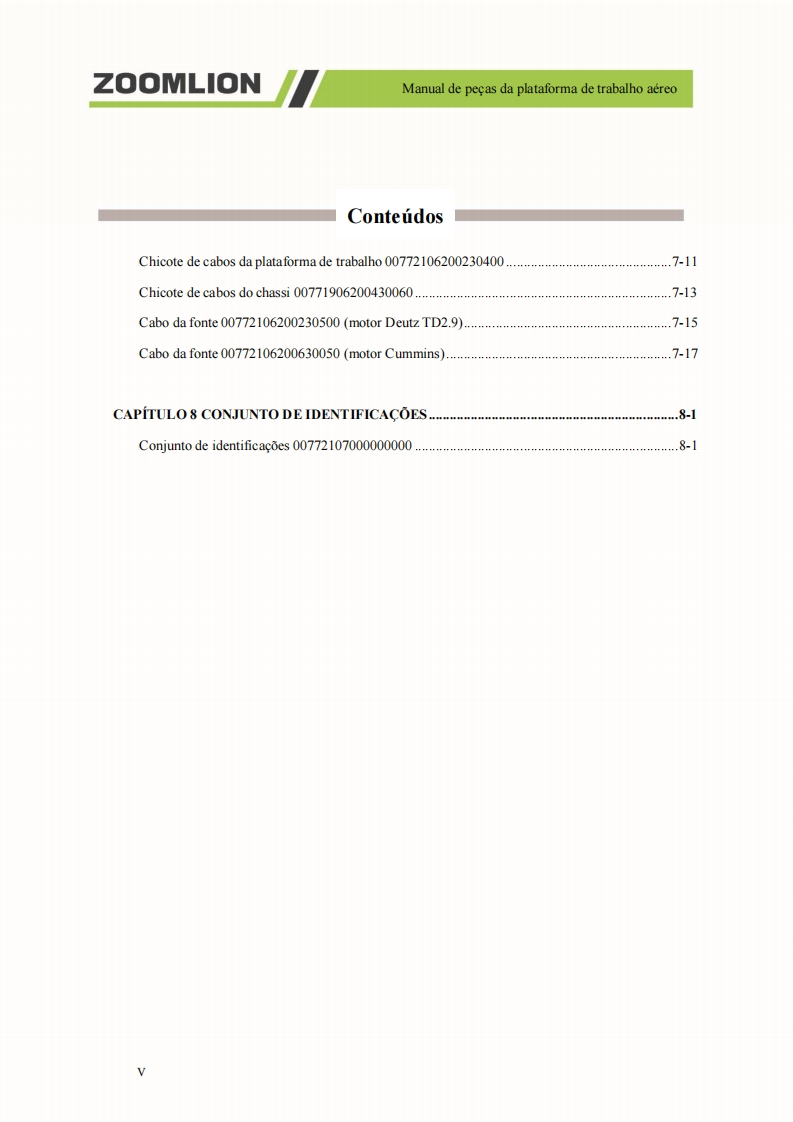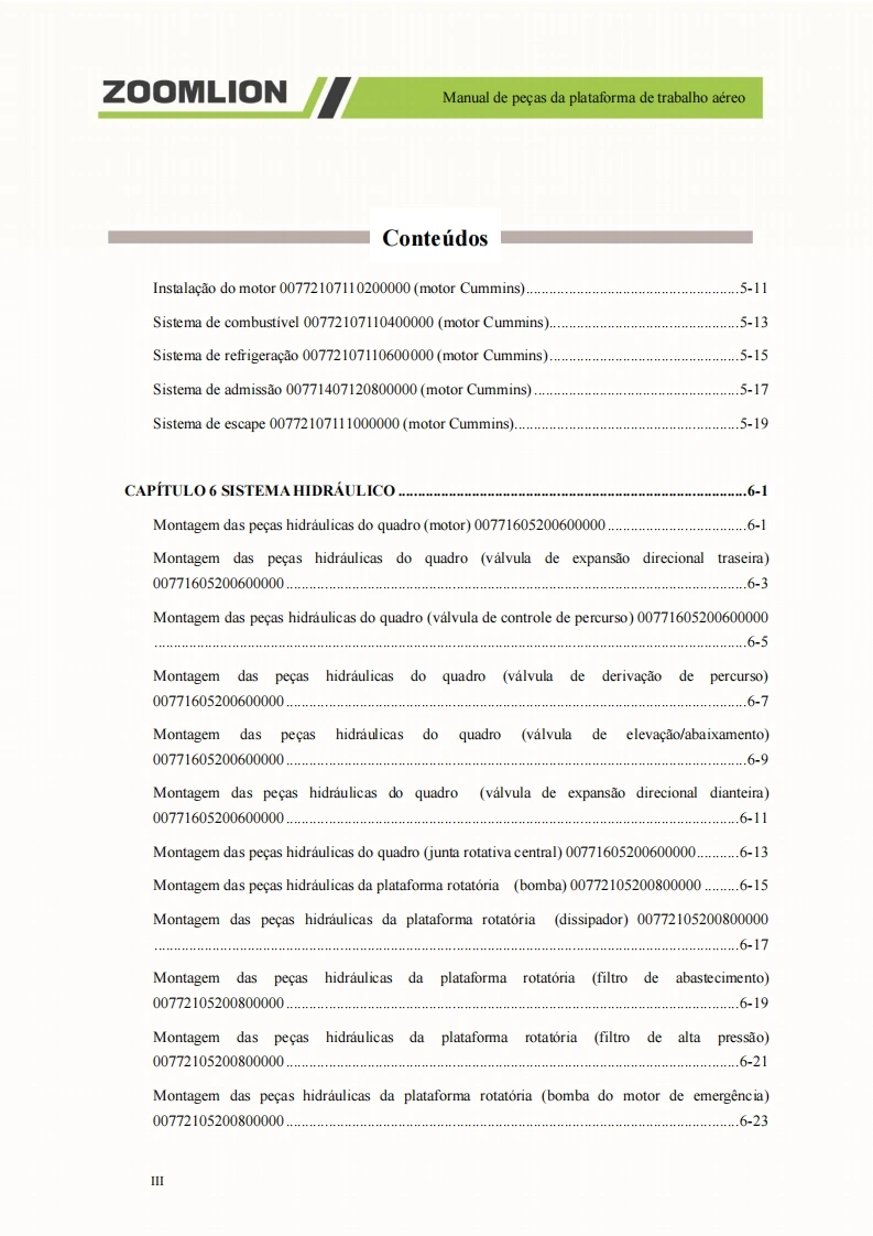 Manual de pecas da plataforma de trabalho aereoZOOMLION■A0 usuarioCaros usuarios,muito obrigado por escolher a plataforma de trabalho aereo de braco reto da"ZOOMLION".Antes de usar esta maquina,por favor leia e compreenda totalmente o conteudo destelivro e cumpra estritamente os regulamentos relevantes do livro.O presente manual apresenta em detalhes os componentes,parametros tecnicos importantes e outrosaspectos da plataforma de trabalho aereo de braco reto.Foi projetado para ajudar os usuarios a operarcom seguranca as plataformas aereas de trabalho de braco reto e melhorar a eficiencia durante aoperacao e manutencao.Guarde em local seguro o presente manual para que possa ser consultado aqualquer momento.Antes de ler e compreender o conteudo deste manual de cuidadosamente,nao tente realizar amanutencao ou reparar o produto.Caso possua alguma duvida ou pergunta,por favor,ligue para oengenheiro de servico local e forneceremos suporte tecnico eficaz e em tempo habil.Nossa empresa naose responsabiliza por quaisquer consequencias adversas decorrentes do uso que nao estejam emconformidade com o presente manual.O manual de pecas representa uma parte inseparavel e significativa do produto.Certifique de transferiro presente manual para o cessionario ao realizar a transferencia dessa maquina.O conteudo do presente manual de pecas e protegido por direitos de propriedade intelectual e nao podeser copiado ou usado para outros fins sem permissao.Devido a melhoria continua e atualizacao do design do produto e a diferenca nas especificacoes emodelos do produto,os detalhes de algumas imagens e textos contidos no presente manual podem serdiferentes do produto que voce possui.Caso possua alguma duvida,por favor,ligue para o engenheirode servico local.Nos reservamos ao direito de revisar o conteudo do presente manual de pecas com melhoramentostecnicos.Esperamos a compreensao de todos os usuarios caso alteracoes sejam realizadas sem avisoprevio.Muito obrigado pela sua confianca e apoio aos produtos da "ZOOMLION",desejamos-lhe sucessoHunan Zoomlion Intelligent Aerial Work Machinery Co.,Ltd.1