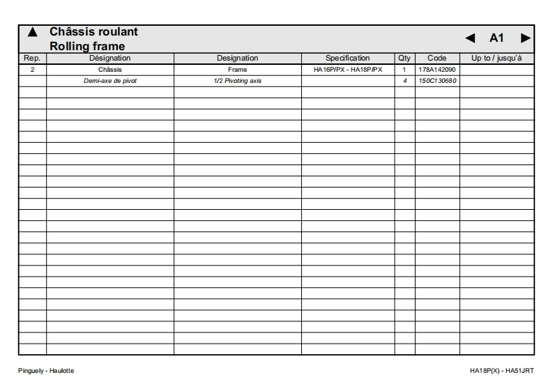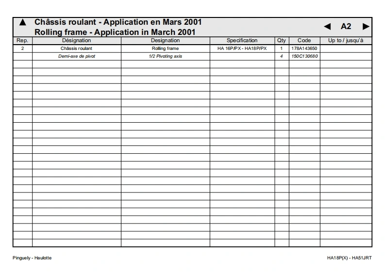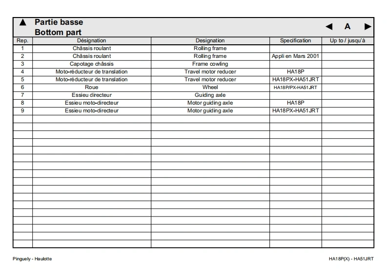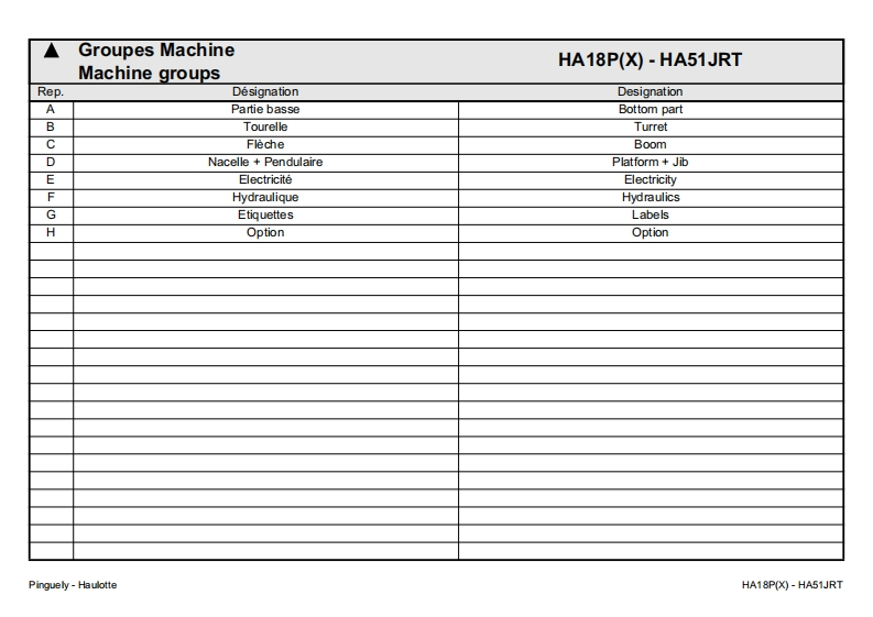 Pinguely -HaulotteHA18P(X)-HA51JRTFPieces de rechangeGBSpare partsDErsatzteile2420316600NLOnderdelenDKReservedeleEPiezas de repuestoPezzi di ricambioE10.01PPecas sobressalentesReservdelSFVaraosaLa PeronniereTele phone:(33)0477292424USAParts ManualBP9Fax SAV:(33)047731281142152 L'HORMEIntemet http:/www.haulotte.comFRANCE(∈E-Mail:haulotte@haulotte.com