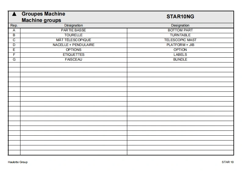 Haulotte>GR O U PSTAR 102420327100-E01.07AFPieces de rechangePezzi di ricambioGBSpare partsPecas sobressalentesDErsatzteileSReservdelNLOnderdelen卡SFVaraosaDKReservedeleEPiezas de repuesto8001WWW H A U L O T T E C O MHaulotteG ROU PPinguely-Haulotte-La Peronniere-BP 9 -42152 I'Horme-France Tel:+33 (0)4 77 29 24 24-Fax +33 (0)4 77 29 43 95-email haulotte@haulotte.com