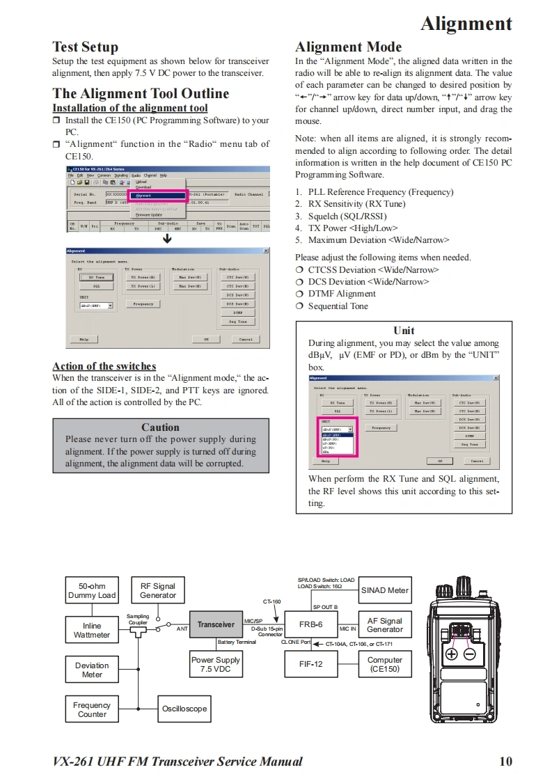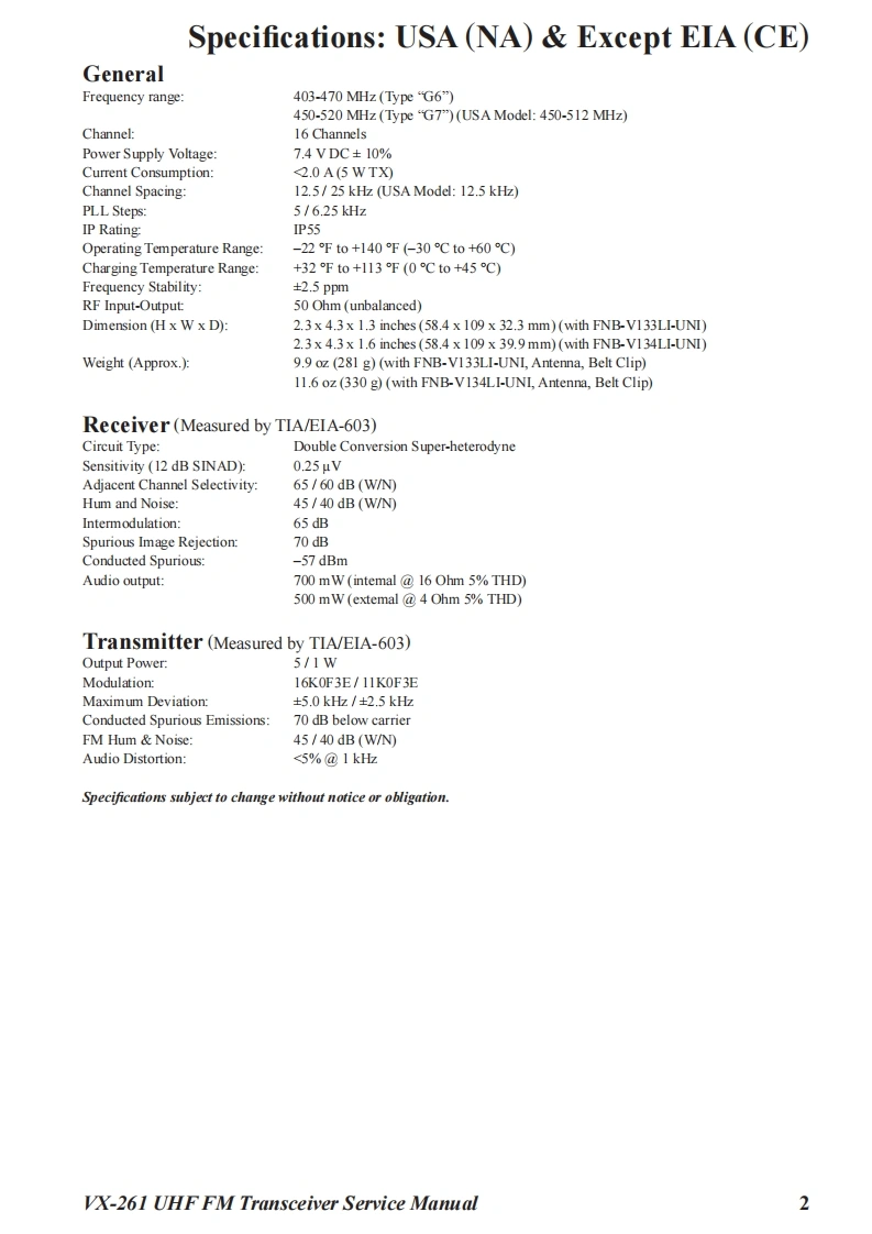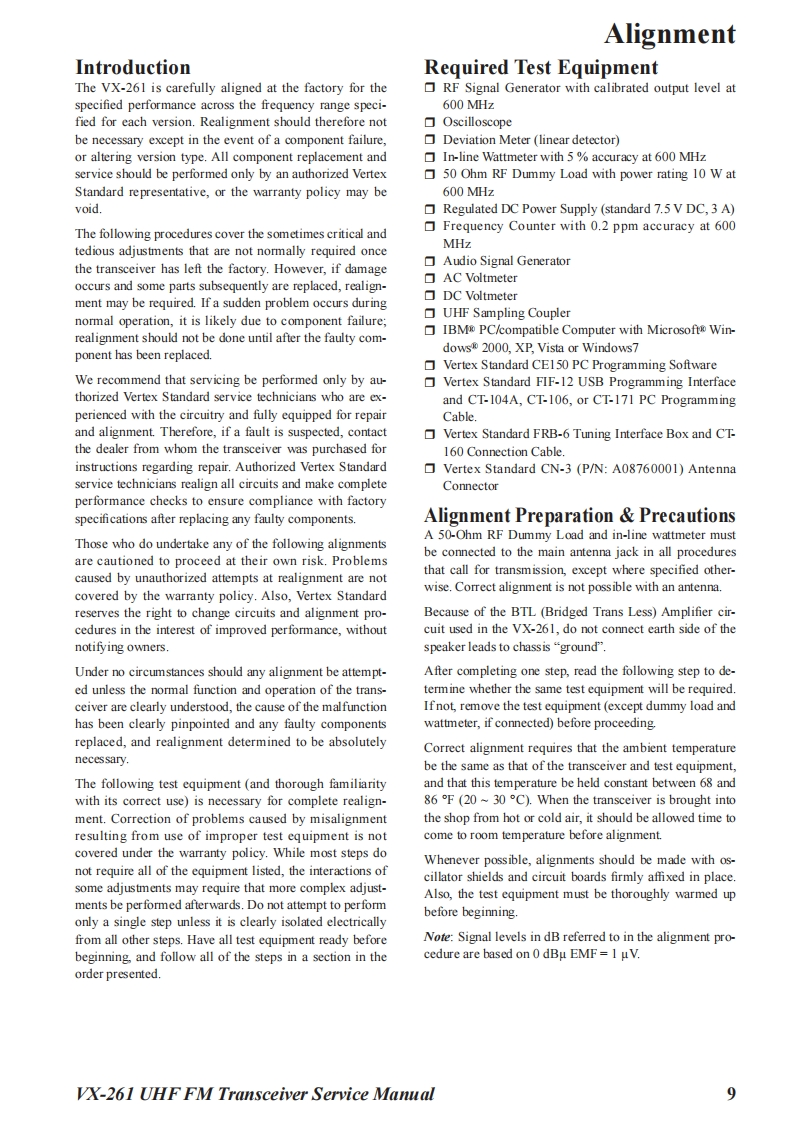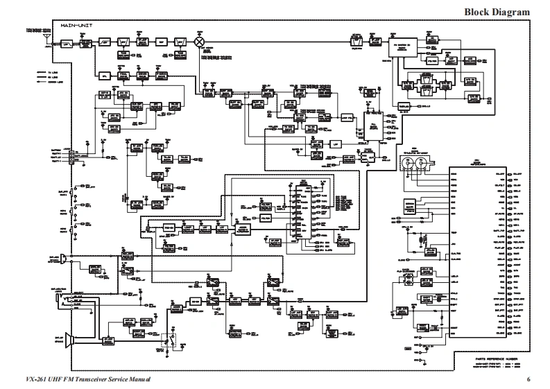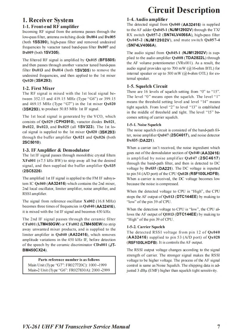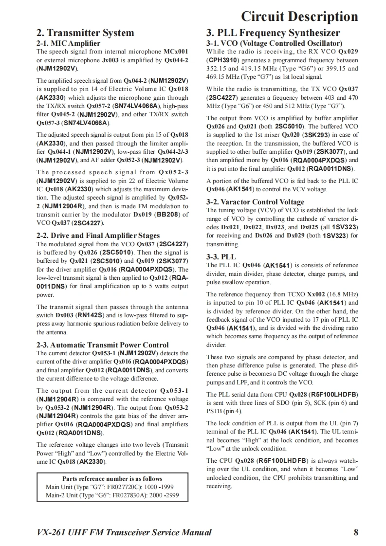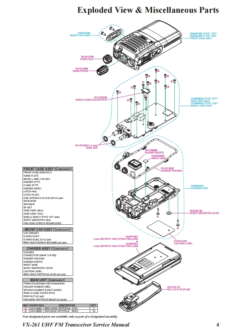 S Vertex StandardVertex Standard LMR,Inc.UHF FM Transceiver2015 Vertex Standard LMR,IncVX-261EC128U90CService ManualIntroductionThis manual provides the technical information necessary for servicing the VX-261 UHF FMTransceiver.Servicing this equipment requires expertise in handing surface-mount chip components.At-tempts by non-qualified persons to service this equipment may result in permanent damage notcovered by the warranty,and may be illegal in some countries.Two PCB layout diagrams are provided for each double-sided board in this transceiver.Each sideof the board is referred to by the type of the majority of components installed on that side("SideA"or"Side B").In most cases one side has only chip components (surface-mount devices),andthe other has either a mixture of both chip and leaded components(trimmers,coils,electrolyticcapacitors,ICs,etc.),or leaded components only.As described in the pages to follow,the advanced microprocessor design of the VX-261 Trans-yx261ceiver allows a complete alignment of this transceiver to be performed without opening the caseofthe radio,all adjustments can be performed from the front panel,using the"Alignment Mode"menu.While we believe the information in this manual to be correct,Vertex Standard assumes no li-ability for damage that may occur as a result of typographical or other errors that may be present.Your cooperation in pointing out any inconsistencies in the technical information would be ap-preciated.Important NoteThis transceiver is assembled using Pb(lead)free solder,based on the RoHS specification.Only lead-free solder(Alloy Composition:Sn-3.0Ag-0.5Cu)should be used for repairs performed on this apparatusThe solder stated above utilizes the alloy composition required for compliance with the lead-free specification,andany solder with the above alloy composition may be used.Contents2Exploded View Miscellaneous Parts...4Parts List..5Block Diagrammm6Circuit Description.....7Alignment.Cloning...…16Main Unit Circuit Diagram (Type "G7":FR027720D)..m17Main-2 Unit Circuit Diagram (Type "G6":FR027830A).18