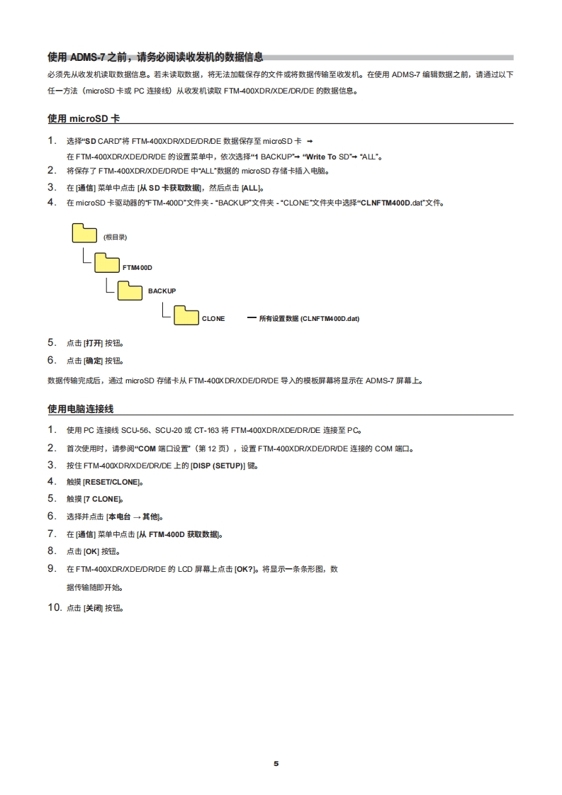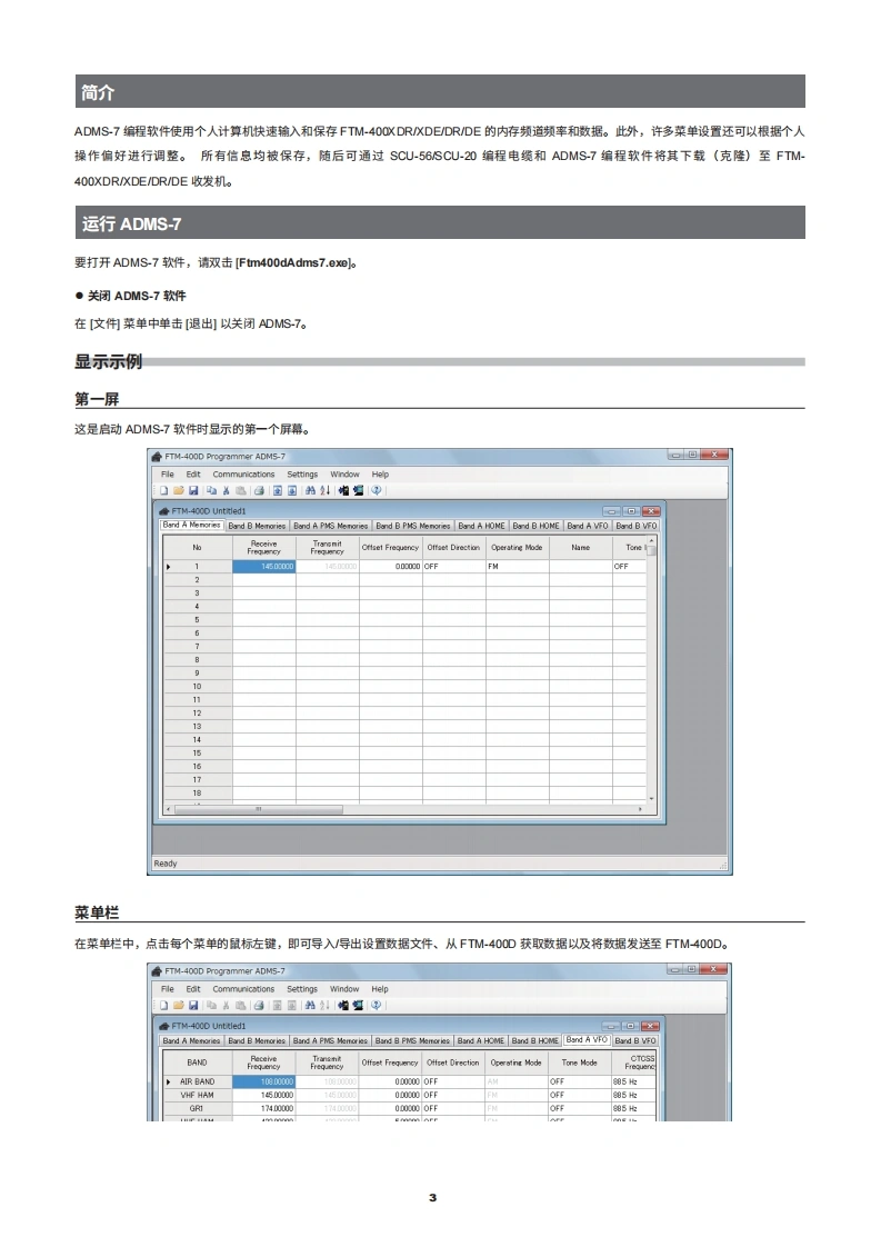 YAESU厂>7。ADMS-7(1.1版或更高版本)兼容DGD和DP-D功能操作手册ADMS-7软件可通过个人计算机方便地编辑FTM400XDR/XDE/DR/DE的内存频道频率、频道信息和字母标签。此外,还可以通过计算机键盘轻松编超和配置收发信机的参数及设置菜单项。注意!ADMS-7软件(1.1版或更高版本)仅可与FTM400XDR/XDE MAIN固件版本"4.00'或吏高版本以及FTM400DR/DEMAIN固件版本3.00'或更高版本配合使用。YAESU MUSEN CO.,LTD.