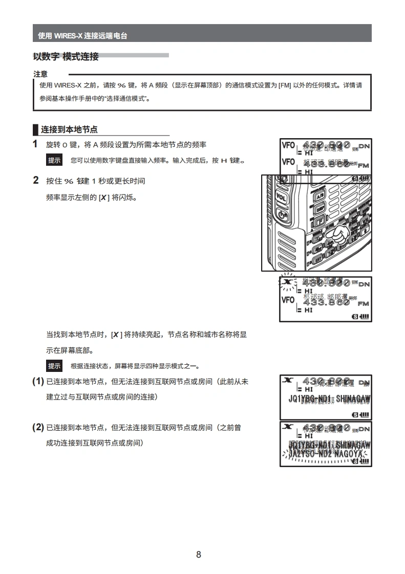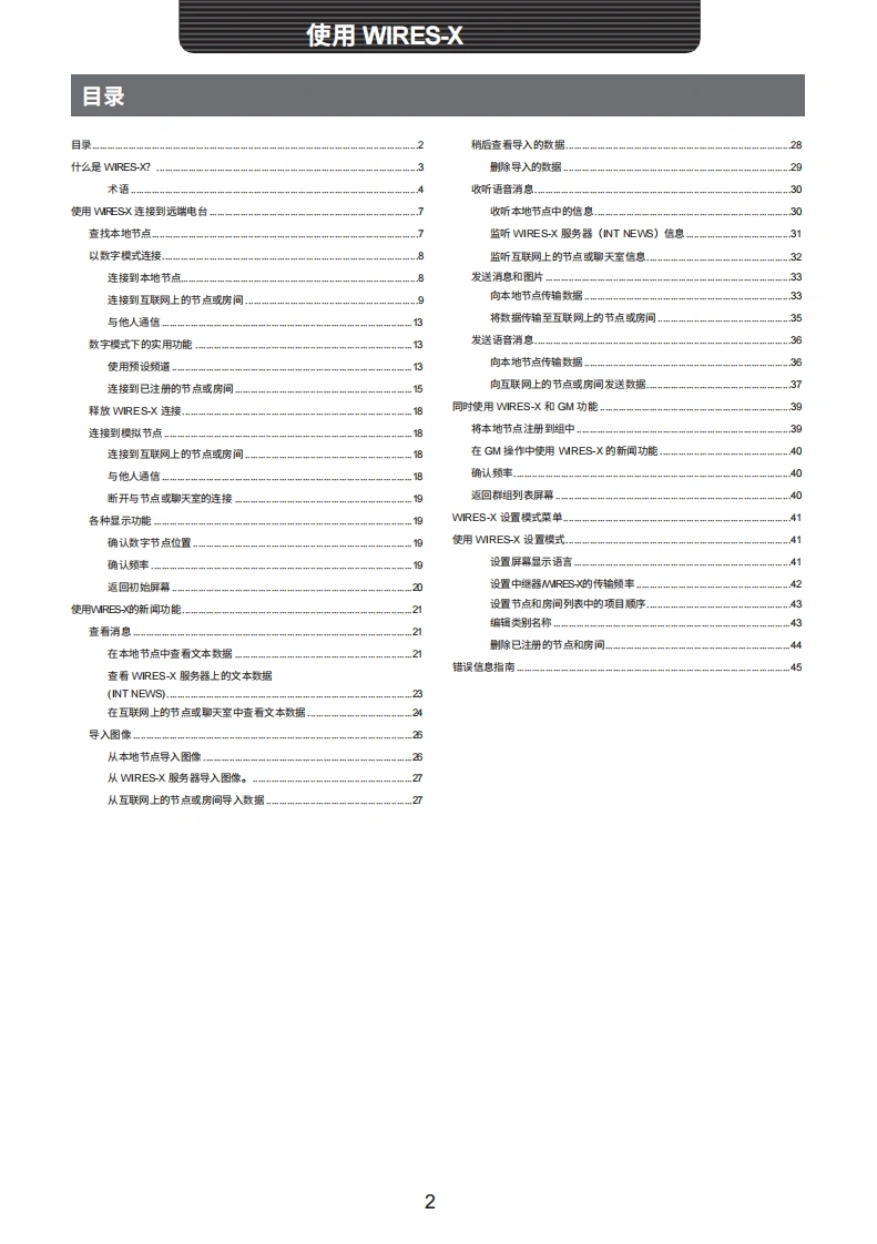FT-1DE_R_Wires-X_user操作说明书手册-中文找手册网12天前发布关注私信4.45MB49页029FT-1DE_R_Wires-X_user操作说明书手册-中文此内容为付费资源,请付费后查看¥19¥21黄金会员免费钻石会员免费登录购买付费资源 第1页 / 共49页 第2页 / 共49页 第3页 / 共49页 第4页 / 共49页 第5页 / 共49页 第6页 / 共49页 第7页 / 共49页 第8页 / 共49页 第9页 / 共49页 第10页 / 共49页 试读已结束,还剩39页,您可下载完整版后进行离线阅读 THE END八重洲 文本预览 YAESUThe radio144/430MHz数字/模拟收发器C4FM FDMAFT1DRFTDE使用说明书(VIRES-X版)感谢您购买我们的产品。本说明书介绍了与"NIRES-X功能"相关的信息。有关收发机的基本操作信息,请参阅产品包装内附带的操作手册。本手册中的公司名称和产品均为各公司的商标或注册商标。 查看更多 收起部分 喜欢就支持一下吧收藏