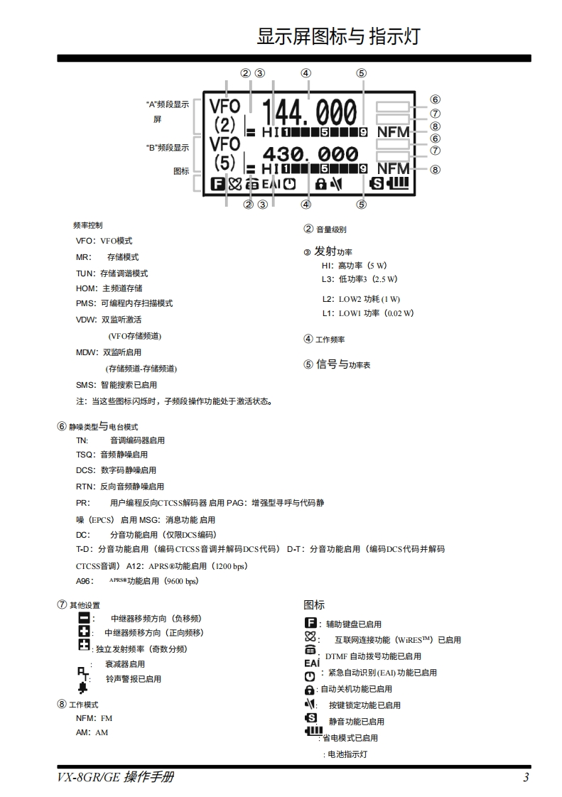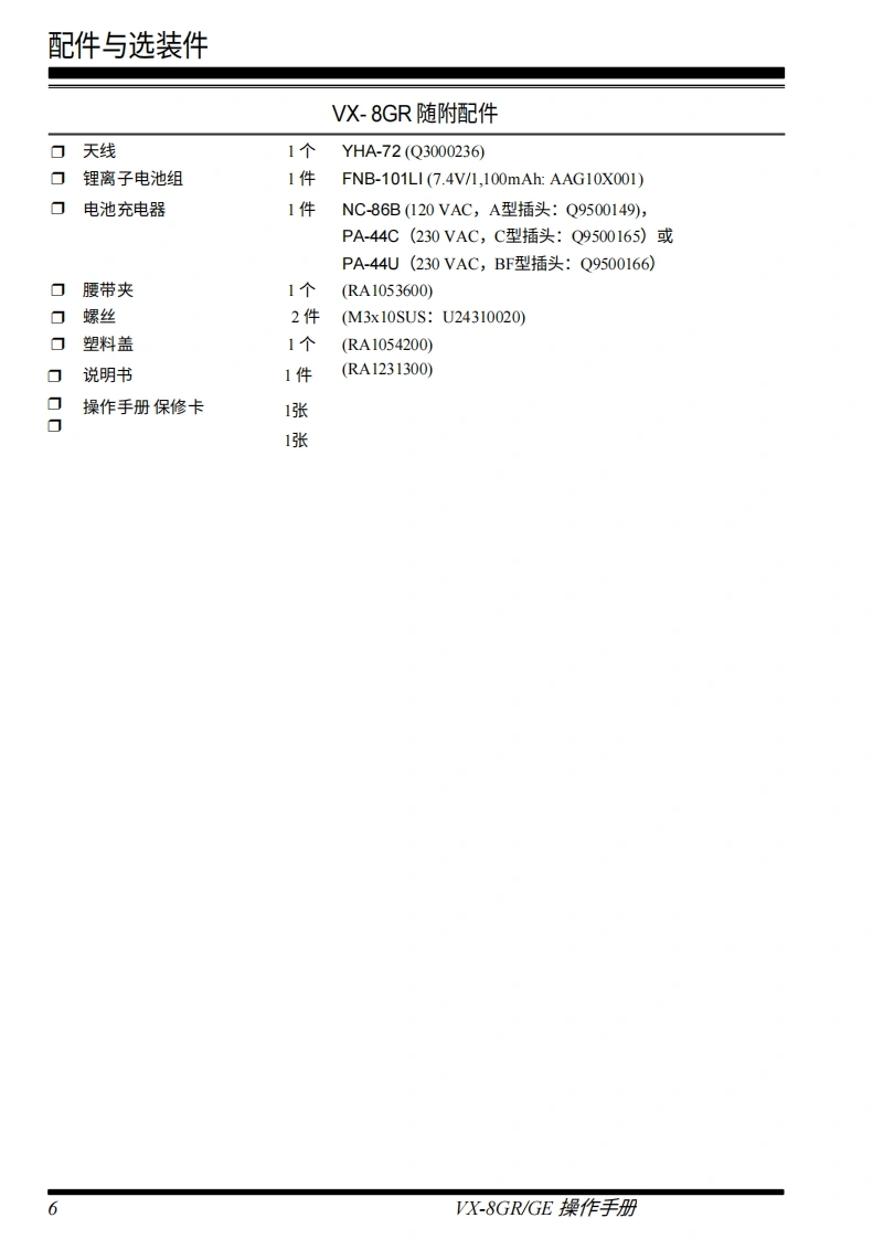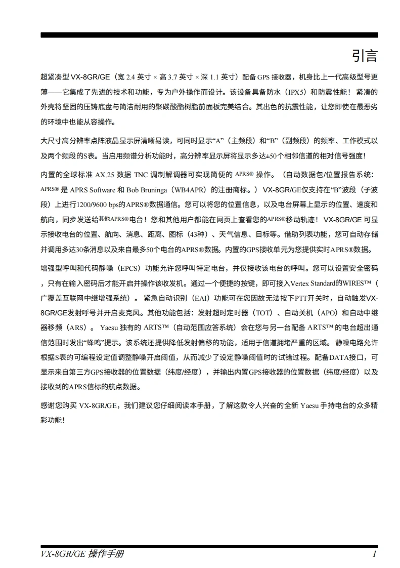 YAESU144/430MHZ带GPS的双频段FM收发机VX-8GR/GE操作手册YAESU6酒8kn/h12nVERTEX STANDARD CO..LTD.日本东京都目黑区中目黑4-8-8,邮编1538644VERTEX STANDARD U.SA.Inc.关国加利福尼亚州赛普里斯市菲利斯大道6125号,邮编90630YAESU UK LTDBY英国汉普郡温彻斯特温纳尔克洛斯太阳谷商业园2单元,邮编:S023 0LBEVERTEX STANDARD HK LTD12香港九龙观塘观塘道378号千禧城2座13楼13061308室9VERTEX STANDARD(AUSTRALIA PTY..LTD维多利亚州东伯伍德韦斯利苑10号塔利霍商业园,邮编3151