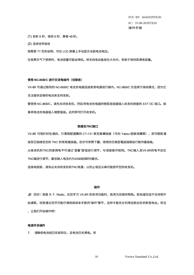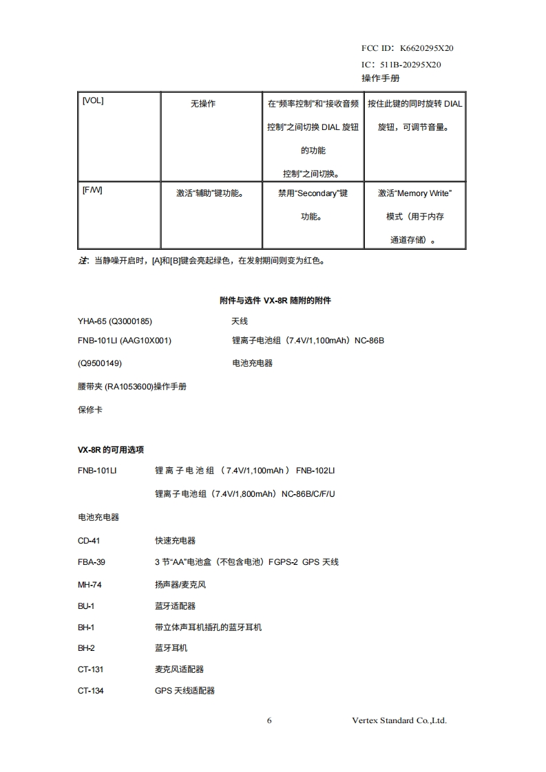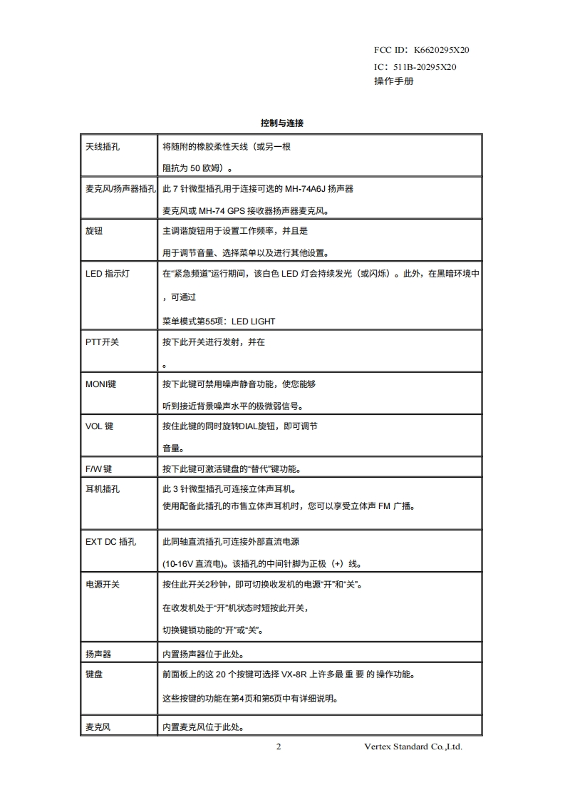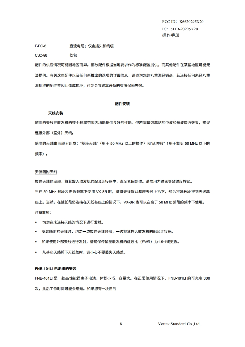 FC℃ID:K6620295X201C:511B-20295X20操作手册操作手册概述VX-8R是一款双接收四频段FM收发机,具有广泛的接收频率覆盖范围,为VHF和UHF业余双向通信提供了领先的功能,并具备无与伦比的监听能力。VX-8R体积小巧,您可以随身携带去任何地方一无论是远足、滑雪还是在城里散步,其操作灵活性为用户带来了多种操作乐趣。除了50、144、(225MH2)和430MHz的收发操作外,VX8R还提供AM(中波)和FM广播频段、高达30MH的HF短波频段、VHF和UHF电视频段、VHF AM飞机频段以及广泛的商业和公共安全频率的接收覆盖!此外,可选的气压传感器单元可在登山或徒步旅行时显示气压和海拔高度。在FM模式下,使用随附的FNB-101LI电池组,发射机可在50MHz、144MHz和430MHz频段提供5瓦的纯净输出功率,在145MHz和430MHz频段提供5瓦输出(225MHz频段为1.5瓦),。VX-8R内置了多种音频信号格式,此外还配备了Yaesu有的RTSM(自动范围应答系统),当您与另一台配备ARTSTME的电台超出通信范围时,该系统会向用户发出哔哔声提示。感谢您购买VX-8R,建议您仔细阅读本手册,以便了解您这款令人兴奋的全新Yesu手持电台的众多精彩功能!前面板控制与开关天线接口麦克旋钮LED指示风扬声器接口灯耳机插孔外PTT开关MONH部直流电源插孔键电源开关扬声器音量键频麦克风1率波段键键盘Vertex Standard Co.,Ltd.