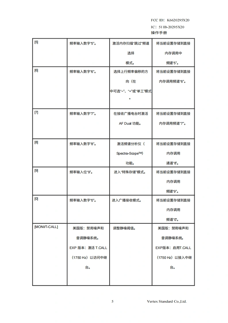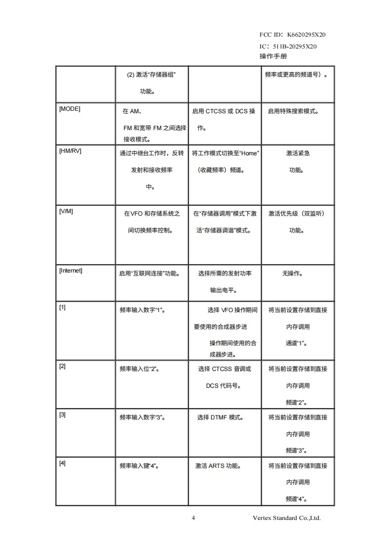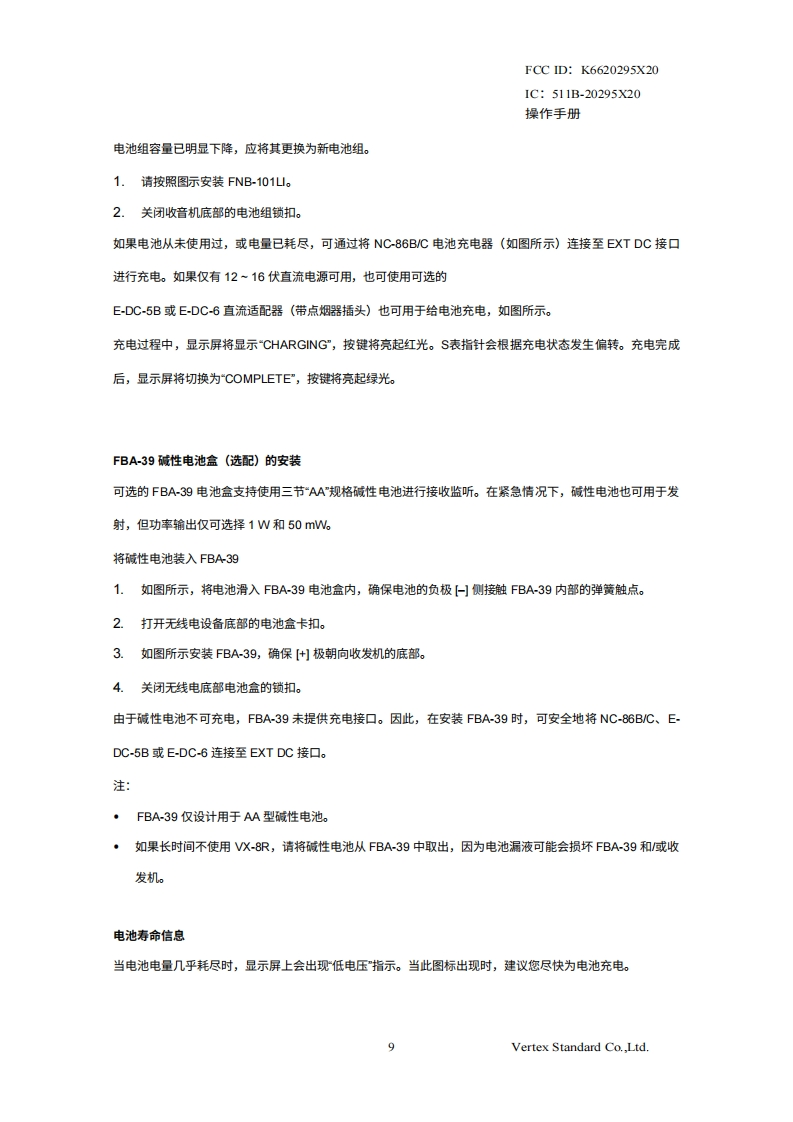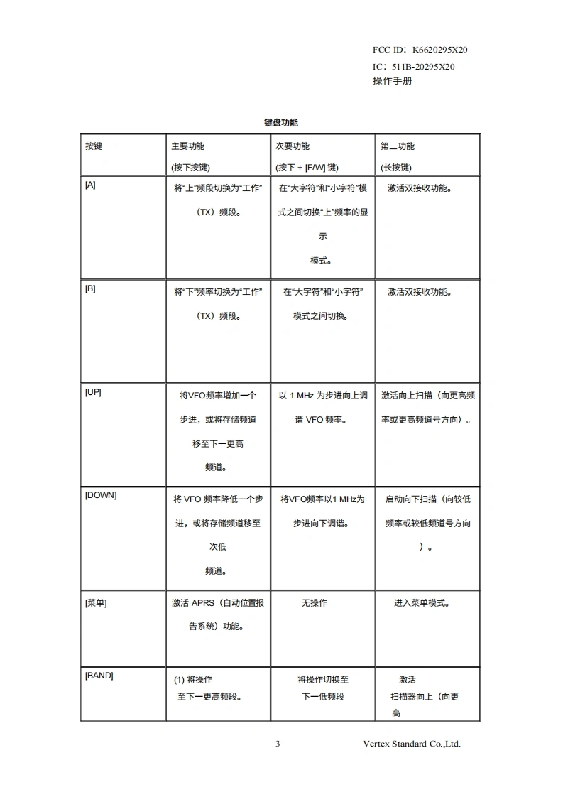 FC℃ID:K6620295X201C:511B-20295X20操作手册操作手册概述VX-8R是一款双接收四频段FM收发机,具有广泛的接收频率覆盖范围,为VHF和UHF业余双向通信提供了领先的功能,并具备无与伦比的监听能力。VX-8R体积小巧,您可以随身携带去任何地方一无论是远足、滑雪还是在城里散步,其操作灵活性为用户带来了多种操作乐趣。除了50、144、(225MH2)和430MHz的收发操作外,VX8R还提供AM(中波)和FM广播频段、高达30MH的HF短波频段、VHF和UHF电视频段、VHF AM飞机频段以及广泛的商业和公共安全频率的接收覆盖!此外,可选的气压传感器单元可在登山或徒步旅行时显示气压和海拔高度。在FM模式下,使用随附的FNB-101LI电池组,发射机可在50MHz、144MHz和430MHz频段提供5瓦的纯净输出功率,在145MHz和430MHz频段提供5瓦输出(225MHz频段为1.5瓦),。VX-8R内置了多种音频信号格式,此外还配备了Yaesu有的RTSM(自动范围应答系统),当您与另一台配备ARTSTME的电台超出通信范围时,该系统会向用户发出哔哔声提示。感谢您购买VX-8R,建议您仔细阅读本手册,以便了解您这款令人兴奋的全新Yesu手持电台的众多精彩功能!前面板控制与开关天线接口麦克旋钮LED指示风扬声器接口灯耳机插孔外PTT开关MONH部直流电源插孔键电源开关扬声器音量键频麦克风1率波段键键盘Vertex Standard Co.,Ltd.