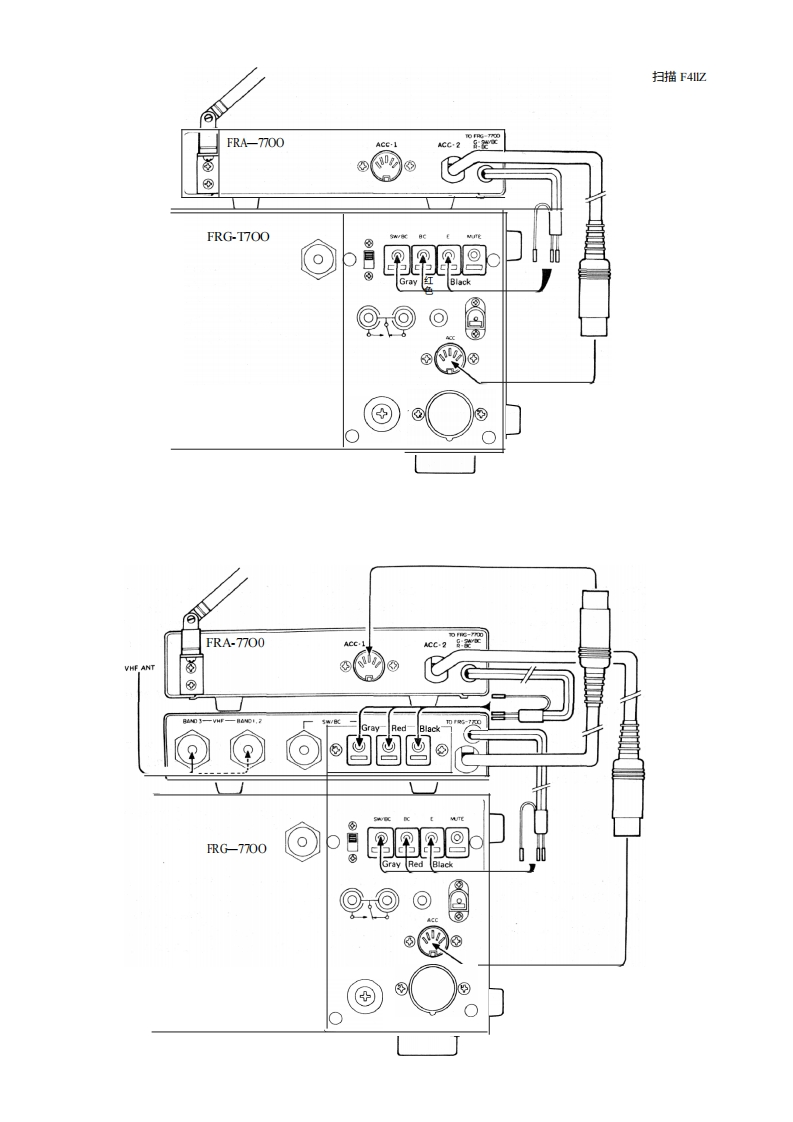 FRA一7700工作天线扫描F4☑该有源天线单元专为配合RG-7700全频段接收机使用而设计,仅需使用随附的1.2米伸缩天线,即可实现高质量的。该有源天线单元内置射频前置放大器,可在ERG-7700的整个150kHz至30MHz工作范围内发挥作用。其增益可通过前面板调节,可在各种接收环境下进行精确设置,以获得最佳性能。安装及操作1.将FRA-7700连接线的一端,带有灰色标签的导线连接至ERG-7700的SW/BC端子,带有红色标签的导线连接至B℃端子。同样,将带有黑色标签的导线连接至E端子ERG-7700。将ERA-7700上的DIN插头连接至ACC插孔。2.请按以下方式预设ERA-7700上的控制旋钮和开关:前置放大器ONO-SW/BC位置增益顺时针旋至最大BAND---------按需设置完全展开I el e sc op in gan I enn a on的FRA-7700。4.将ERG-7700调至所需频率(如步骤2所示)。0调节ERA-7700上的TUNING旋钮,使接收器上的信号达到峰值。如果该峰值出现在TUNING旋钮完全顺时针或逆时针旋转的位置,请将BAND开关设置为相邻位置,然后再次调谐以获得峰值。6.调整伸缩天线的角度和位置,以获得最大信号。7.如果附近频率上的强信号干扰了您想要接收的信号,请调低GAIN旋钮的设置,以尽量减少干扰。8.当您尝试接收2MHz以下频率的极微弱信号时,请将OUT开关设置为DXBC位置。注意:如果您将A-7700连接到接收机并将其关闭,例如在收听强本地信号或通过另一根天线收听时,您可能需要设置RA-7700上的BAND开关和TUNING控制,以使接收信号达到峰值(即使RA-7700已关闭)。