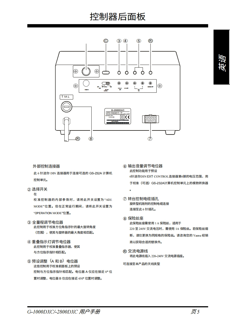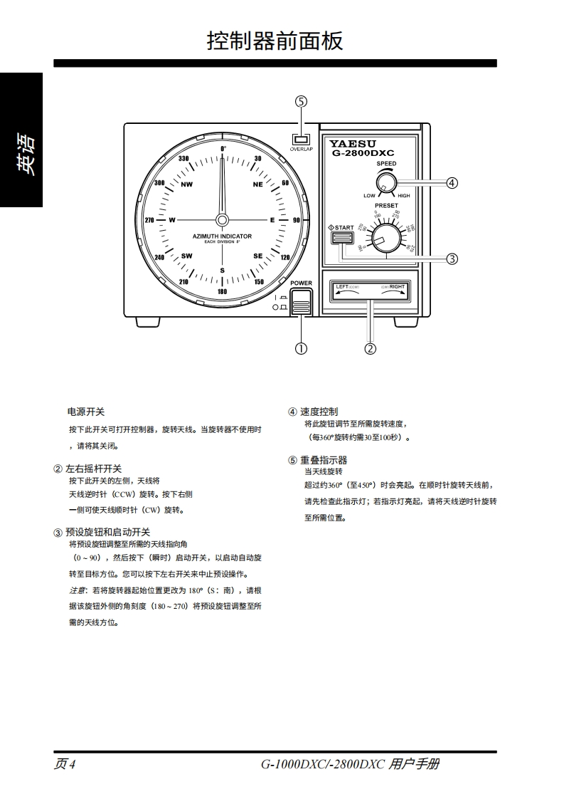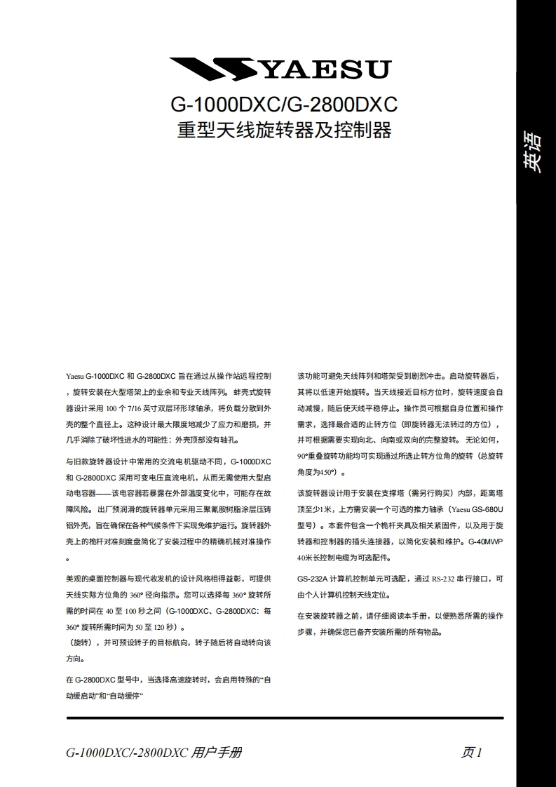 银YAESUG-1000DXCG-2800DXC天线旋转器及控制器用户手册罨VERTEX STANDARD CO.,LTD日本东京都目黑区中目黑4-8-8,邯编153-8644VERTEX STANDARD美国总部贺美国加利福尼亚州塞里托斯市爱德华兹路17210号,邮编90703由际事业部美国佛罗里达州迈阿密市西北52街8350号201室,编33166YAESU EUROPE B.V.P.O.Box 75525,1118 ZN Schiphol,The NetherlandsYAESU UK LTD英国汉普都裙彻斯特钠尔克洛斯太阳谷商业园12单元,却编:S023 0LBYAESU GERMANY GmbHAm Krorberger Hang 2,D-65824 Schwalbach,GermanyVERTEX STANDARD HK LTD香港九龙观塘海滨道138-141号海景中心20楼5室大城
