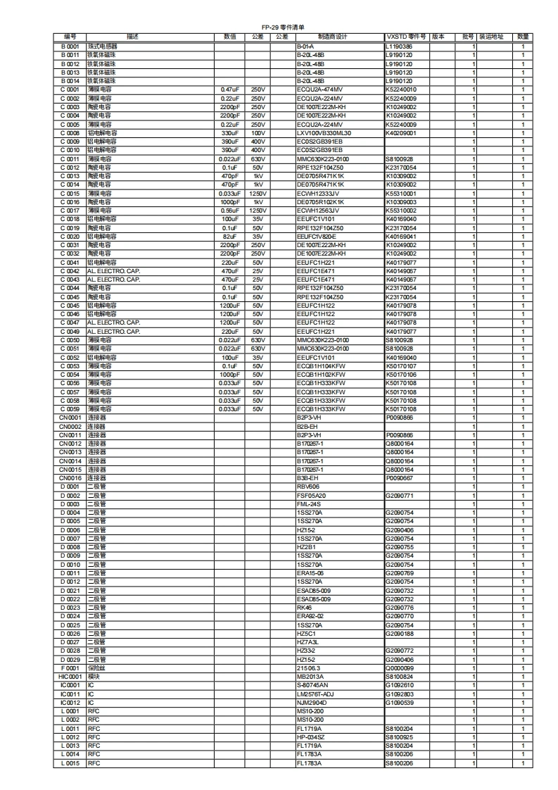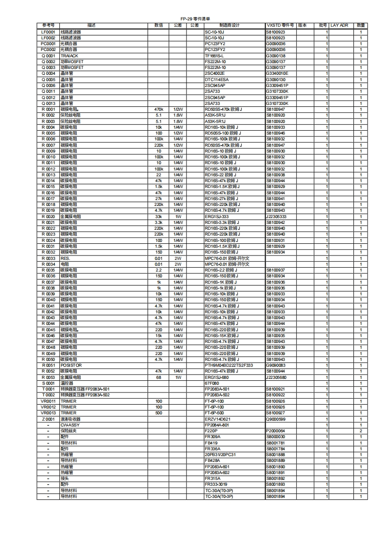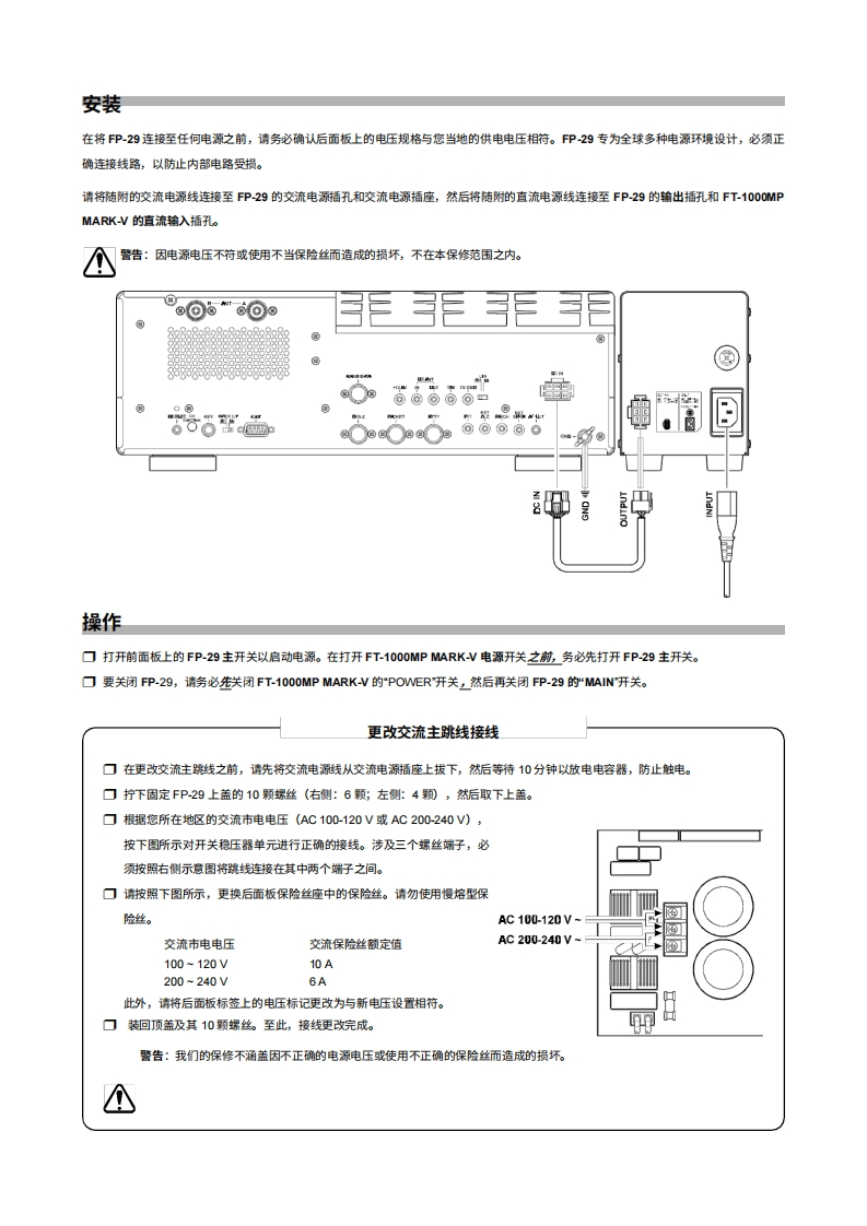 FOX TANGO INTERNATIONAL访间htpw.fo怕ngo.orgYAESU FP-29交流电源适用于FT-1000 MP MARK-V短波收发机FP-29是一款专为FT-1000 MP MARK-VHF收发机设计的外部交流电源,可长时间提供30伏直流电,最大电流达15安培。出色的稳压性能和稳健的设计确保用户能够享受多年无故障运行。当长时间高电流需求时,热敏开关冷却风扇会自动启动,以保持电源的安全工作温度。规格直流输出电压:+30V、+13.8V直流输出电流:+30V:15A;+13.8V:3A输入电压:交流100-120V,50-60Hz;交流200-240V,50-60也功耗(约):交流100-120V:9A,交流200-240V:5A工作温度范围:-10℃+50℃机箱尺寸(宽x高x深):106×135.5×331毫米(42X5.3x13英寸)重量(约):3.2千克(7磅)规格如有变更,恕不另通知,亦不承担任何责任。随附配件直流电源线:T9022299(长度:2米)交流电源线…444444444444444444444444444操作手册(本).1保修卡八重洲无线电株式会社日本东京都目黑区中目黑4-8-8,邮编1538844YAESU U.S.A.关回加利福尼亚州塞里托斯市爱德华兹路17210号,邮编90703YAESUYAESU EUROPE B.V.POWER SUPPLYP.O.Box 75525 1118 ZN,Schiphol,The NetherlandsFP-29YAESU UK LTD.英回汉昔郡温彻斯特温纳尔克洛斯太阳谷商业园12单元,邮编S0230LBYAESU GERMANY GmbHAm Kronberger Hang 2,D-65824 Schwalbach,GermanyYAESU HK LTD.香港九龙尖沙阻东莫迪道63号尖沙阻中心11楼