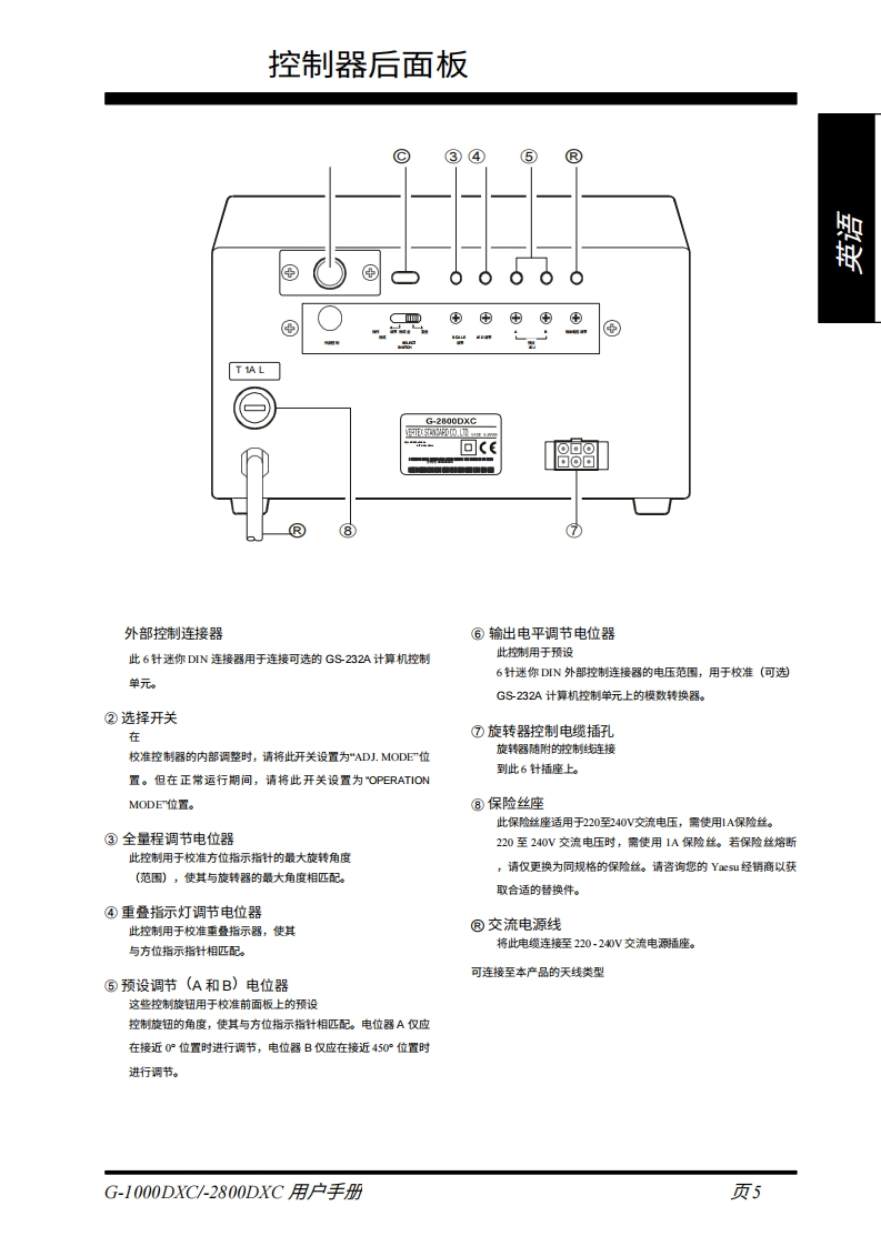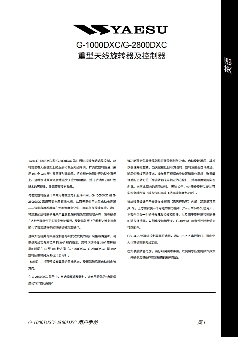 嚴YAESUG-1000DXC G-2800DXC天线旋转器及控制器用户手册鑼VERTEX STANDARD CO.,LTD.日本东京都目黑区中目黑88,邮编153-84VERTEX STANDARD国总部其国加利福尼亚州塞里托斯市爱德华兹路17210号,邮编90703贺国际事业都统罗里达州迈密市西北52街的50号201室,邮编33168YAESU EUROPE B.VP.O.Box 75525,1118 ZN Schipho,The NethertandsYAESU UK LTD.英国汉苦都温彻斯特温纳尔克洛斯太阳商业园12单元,邮编S0230LBYAESU GERMANY GmbHAm Kronbenger Hang 2,D-65824 Schwabach,GermamyVERTEX STANDARD HK LTD香港九龙现塘海滨道139141号海景中心20楼5空