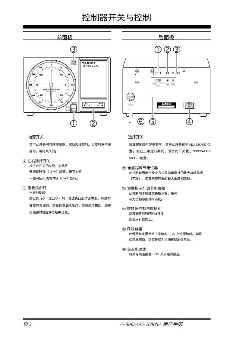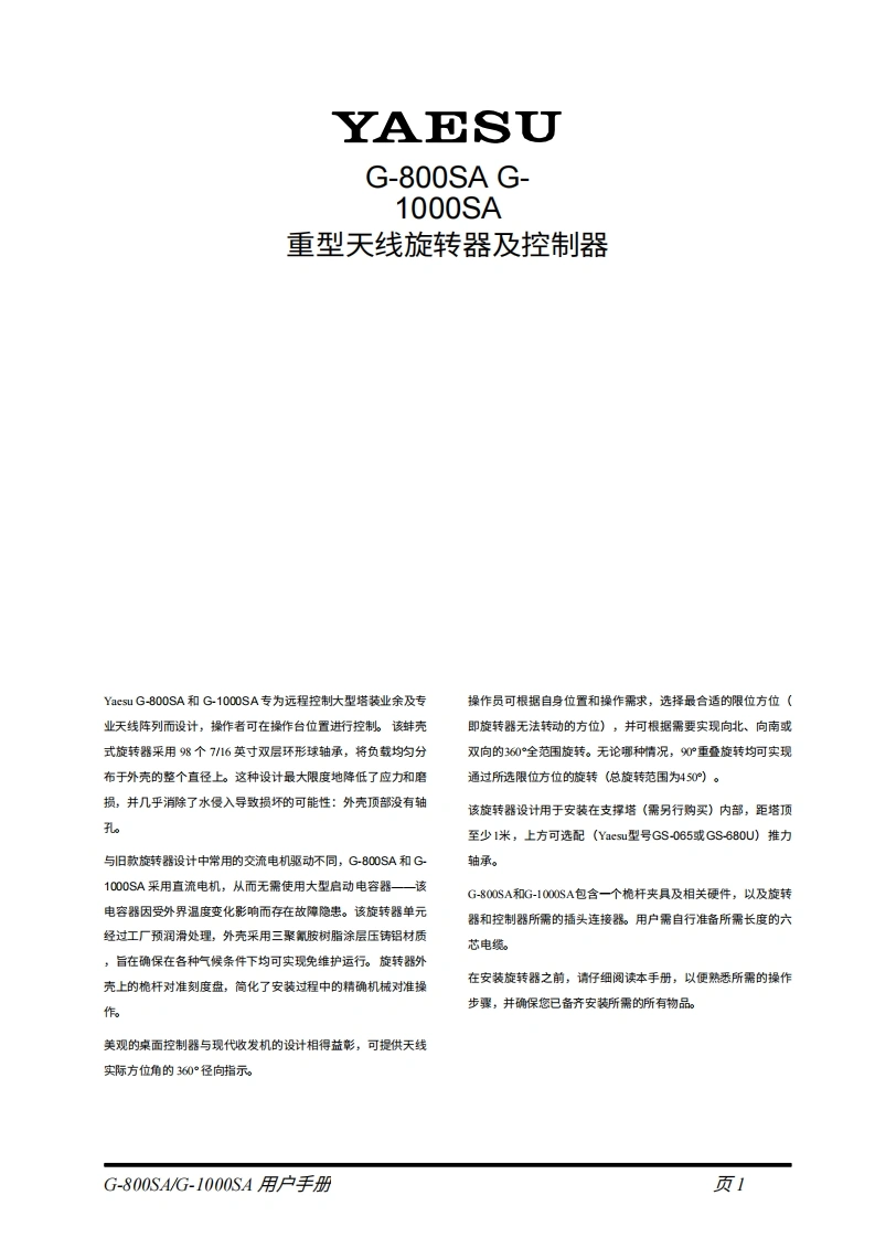 YAESUG-800SA G-1000SA天线旋转器及控制器用户手册NESE120qVERTEX STANDARD CO.,LTD.日本东京都目黑区中目黑4-8-8,邹编153-8644VERTEX STANDARD关国总部美国加利福尼亚州赛普里斯市沃克街10900号,郁编90630YAESU EUROPE B.V.P.O.Box 75525,1118 ZN Schiphol,The NetherlandsYAESU UK LTD.000英国汉普郡温彻斯特温纳你克洛斯太阳谷商业园12单元,部编:S0230LB00⊙VERTEX STANDARD HK LTD香港九龙观塘海滨道139141号海景中心20楼5室