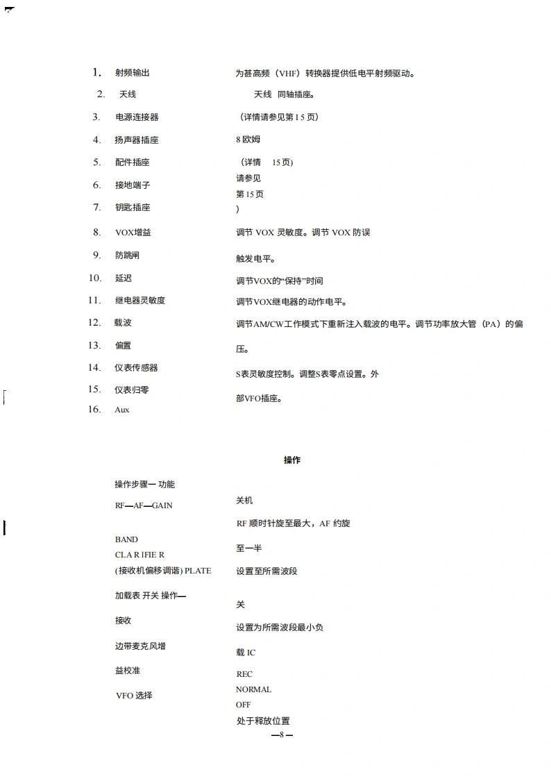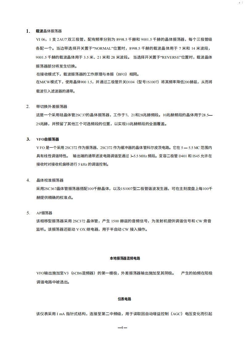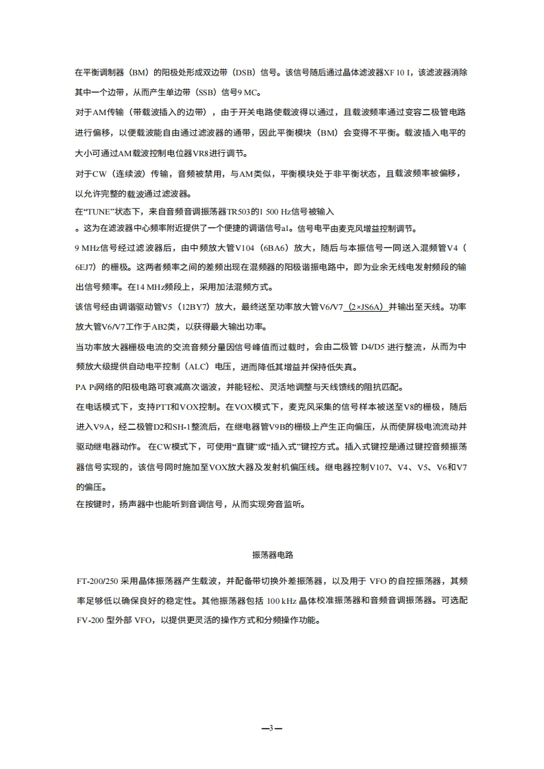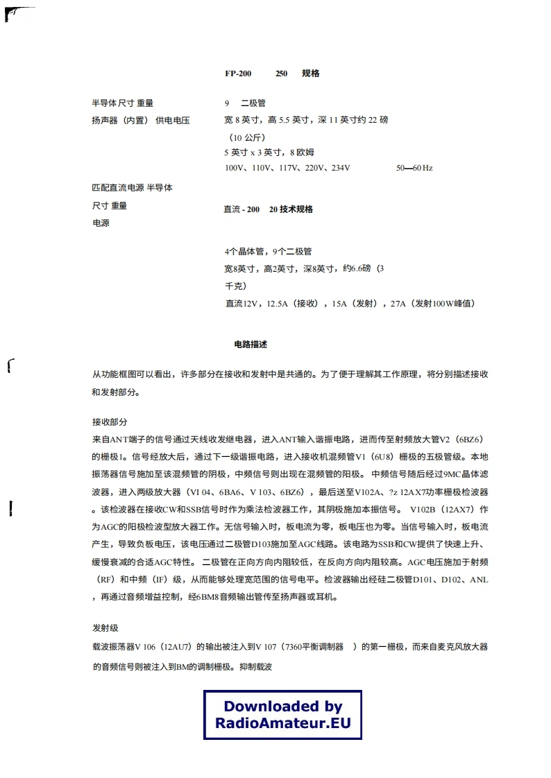 FT-200250单边带(SSB)收发机FT200250收发信机适用于ICF业余波段80米至10米,是一款精密制造的高性能收发信机,提供SSB(可选USB和LSB)、CW和AM工作模式,单音功率为240W(语音峰值输入约300W)。通过采用设计精良的异频振荡器(V下O),实现了极高的稳定性,而特制的9MC晶体滤波器则确保了出色的语音质量。其小巧轻便的机身和附带的提手,使其非常适合且方便在家中、便携和移动环境中使用。其他功能包括VOX、100千赫校准器、·5千赫接收机偏移(澄清器)调谐,以及便于连接线性放大器的接口。FP.200250匹配交流电源(带内置扬声器)专为该收发机设计,提供12V直流电源;D℃-200a250则适用于移动或野外使用。一般规格工作模式SSB(USB/LSB)、CW、AM24OW输入功率频率范围3.5-4;7-7.5;14-14.5;21-21.5;28.5-29(可选晶体适用于28一28.5、29-29.5、29.5一30MC频段)50一100欧姆天线阻抗频率稳定性载预热后,每30分钟内100cps波抑制边带抑制-40dB三阶互调产物-50dB(1000cps)Downloaded by音频带宽接收机灵敏度-30 dB (P.E.P.)RadioAmateur.EU选择性300-2700赫兹中频干扰比0.5μV输入信噪比10dB镜像比2.4kHz(-6dB)、4k比(-60dB)音频输出50 dB50 dB音频输出阻抗电源1090负载下失真率为1%电子管与半导体尺寸交流或直流,配备独立电源,16支电子管、15重量个二极管、7个晶体管宽13英寸,高5英尺,深11英寸17.5磅(8.6公斤)