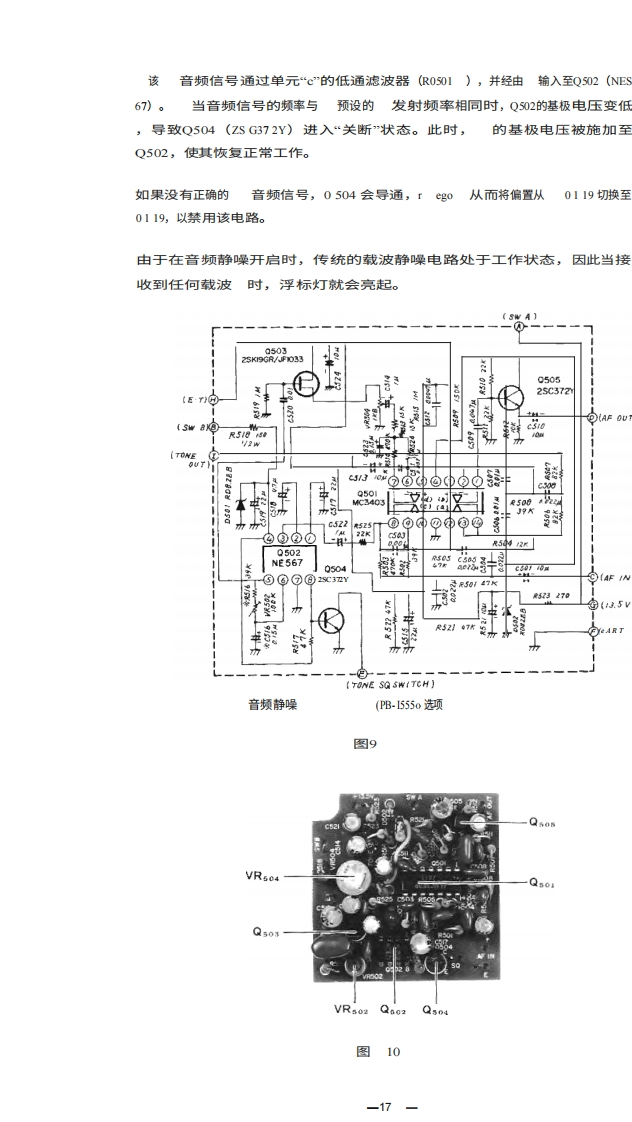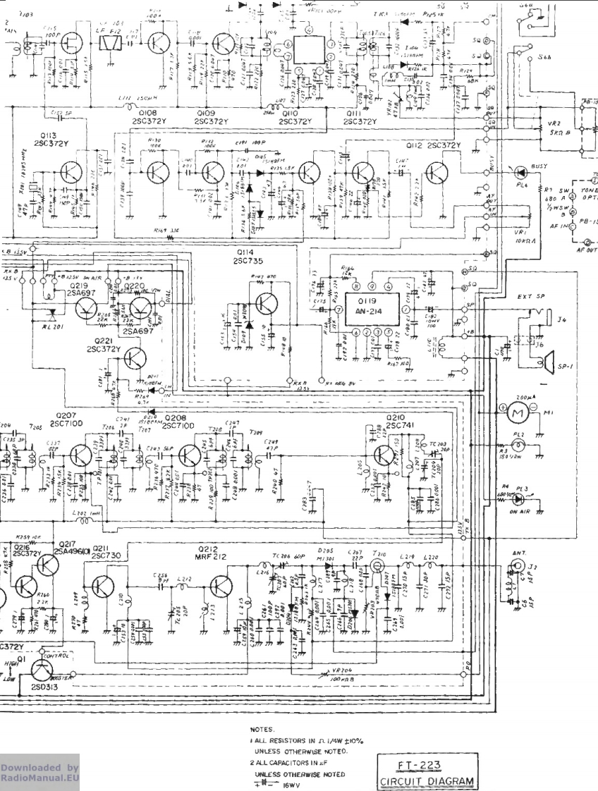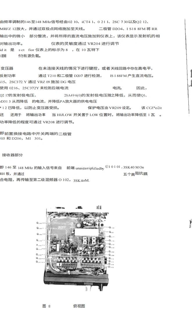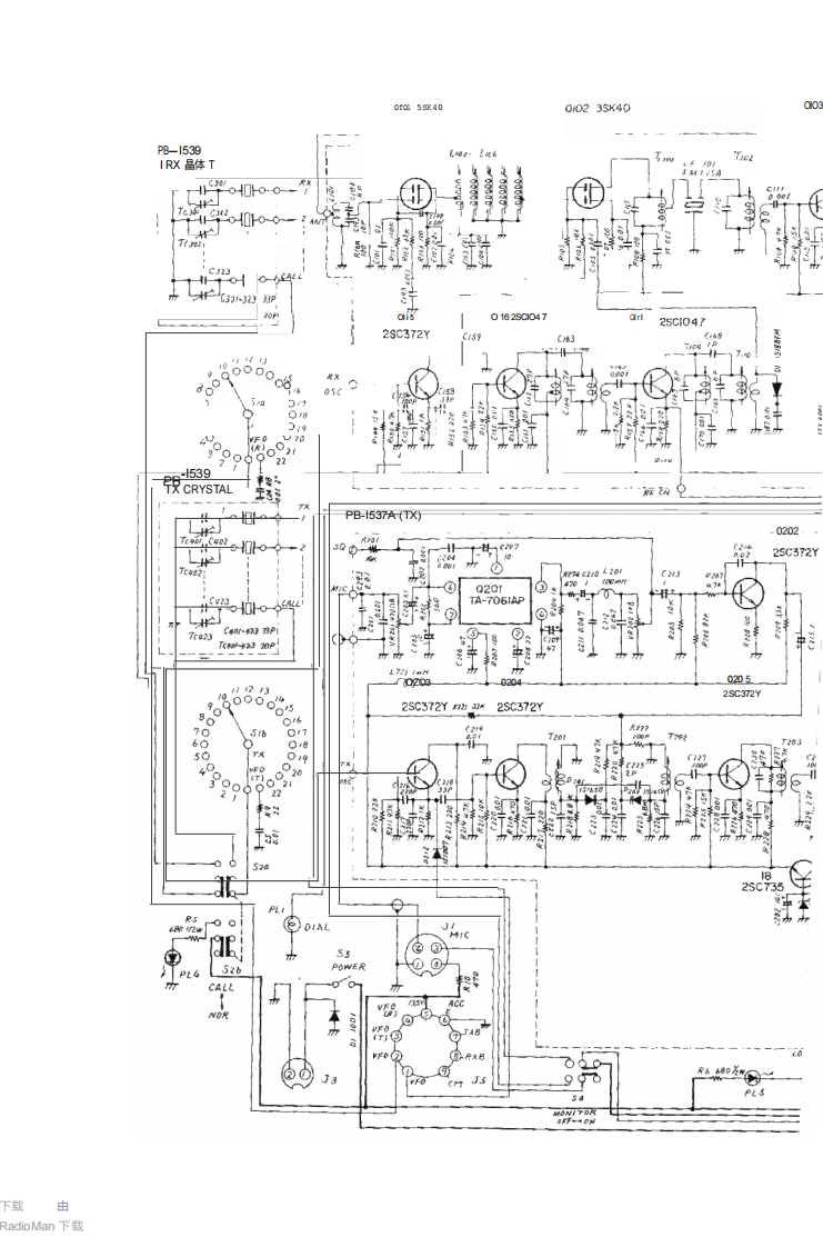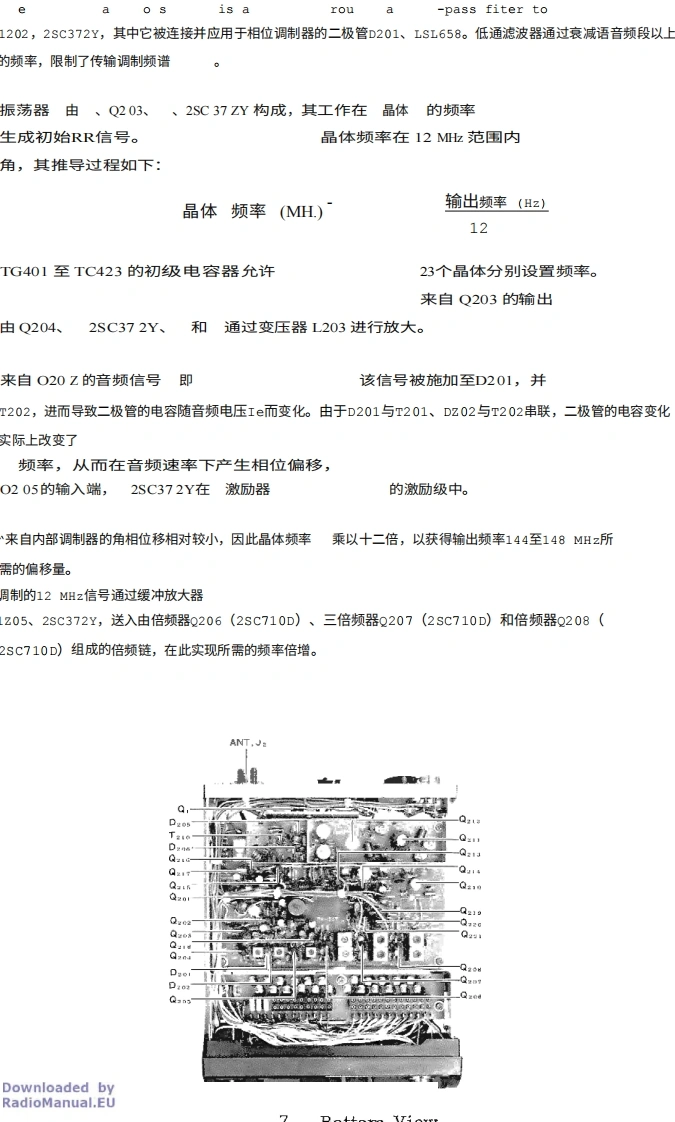 Downloaded byRadioManual.EU工作原理ENERAL型号FT-2Z3 VHF/FM收发机的功能原理如方框图所示,图·6teler tothe a电路图电路描述。该收发器由晶体控制的发射器和接收器,可在任何23个频道上运行,并支持频率频率范围为144至148MHz。除22个由GHANNE Lsi选通开关选定的频道外(通过GHANNE Lsi选择开关选定)的22个频道之外,还可预设一个最常用频道操作范围。整个设备均采用固态元件,该收发器设计为由13.5伏+10%的负极接地电源供电。"发射机部分该发射器部分产生FM(相位调制)输出信号。来自麦克风的音频信号由集成集成电路O201(TA7061AP)作为放大器和DEris Tantaneou的偏差控制电路。DC电路会在正负峰值超过预设阈值时进行截断,以限制发射机的最大偏移量。IDC控制器VR202允许对偏差进行调节,其标称出厂设置为+5kHz的偏差。当进行宽带传输时g de ui red,VR202mi过t be调整以提供最大偏移I +10 kHzT223BLOC K OIAG RAM胸私PB-1538 RXP6-555P8-537TxTER