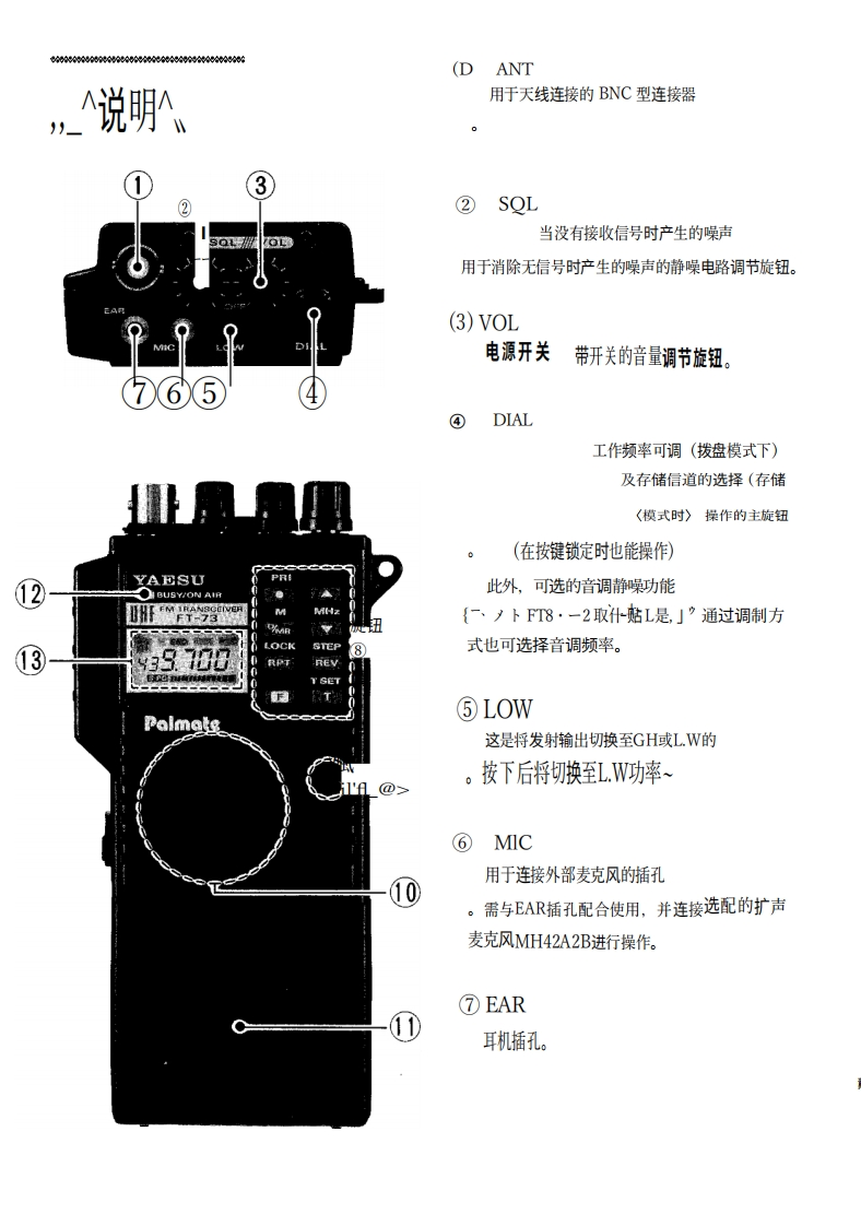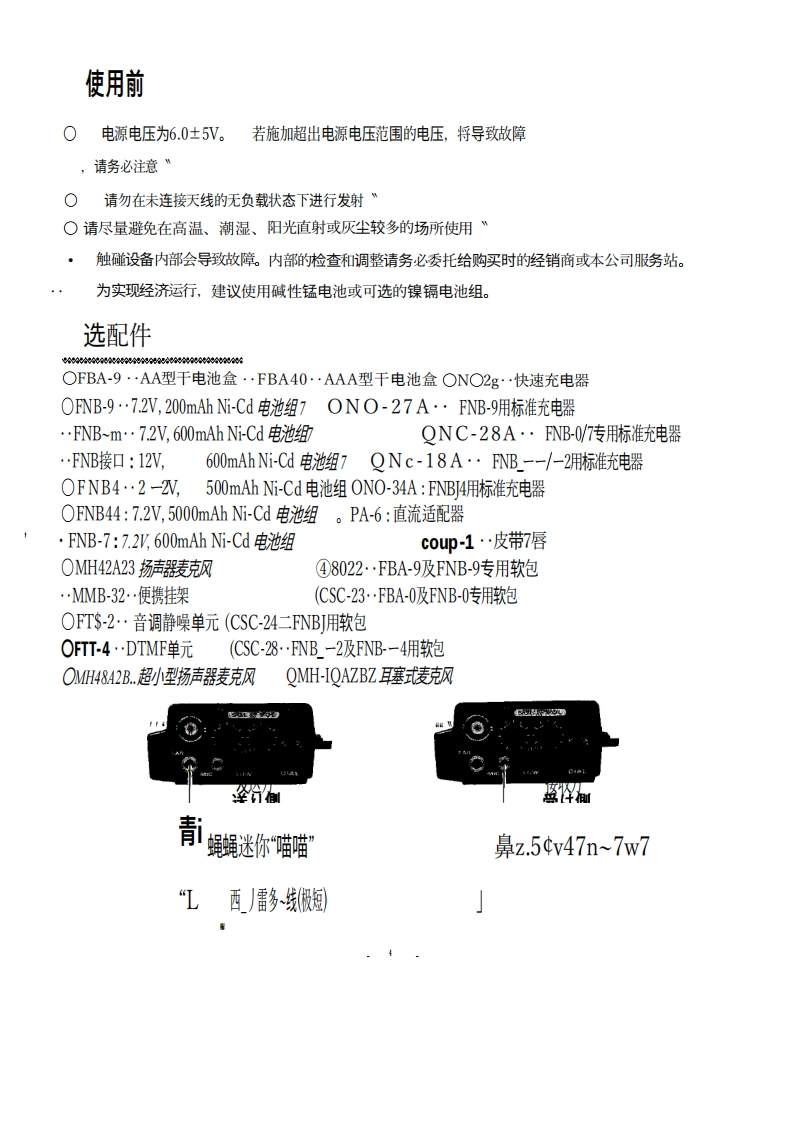 FM便携式对讲机FT-7REE-91··HITOP取圾說明書(02)704-9104(0502)145-4380YAESUPalmateUHF目次A-名部盼说册使用前4[此次承蒙您购买YAE$UFT-73收发机才ブ之ョ4,衷心感谢您使(方5C寸」春奏+5本产品是在严格的质量管理下生产的,但万一因7运输途中发生事故等导致损坏或发现可疑之处,1.周波数七ッ卜或就近的星悦垂製一了之卜口一儿7行早目已方買)上(于)大龙意孝L大販壳店丰3.又丰ャ口卜口一儿9请您充分理解递裤蹦所法一上本机南問小合9能<龙吉小,3送停志)乜ッ卜機能106.卜一又ヶ儿于運用11被誉为“爱好之王”的业余无线电12前二,二)取极脱明書在上〈粉就大尤老,热魔在魚醒2前军进12为改进产品,说明书中的照片等可能与实际产品定格分差显敬请谅解13已方案L五〈龙这.14