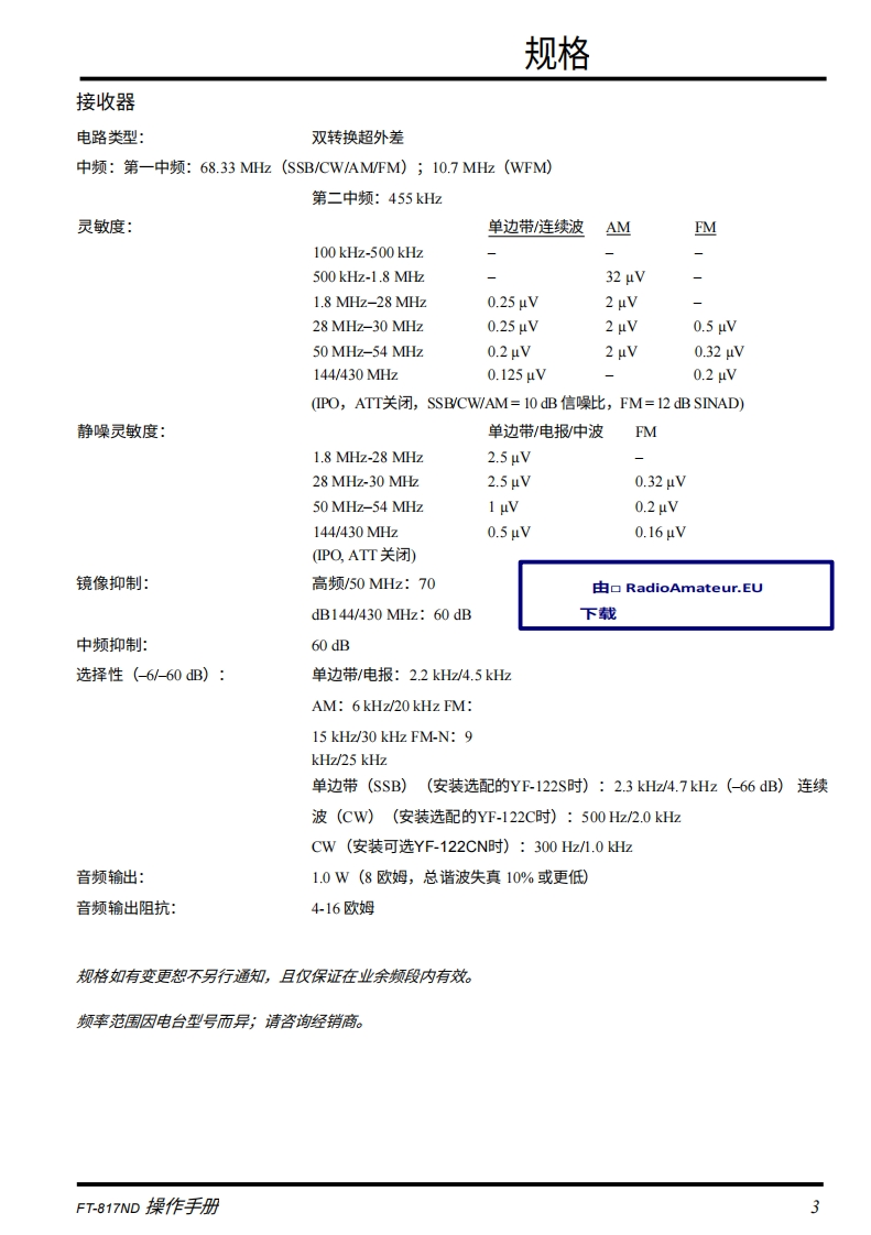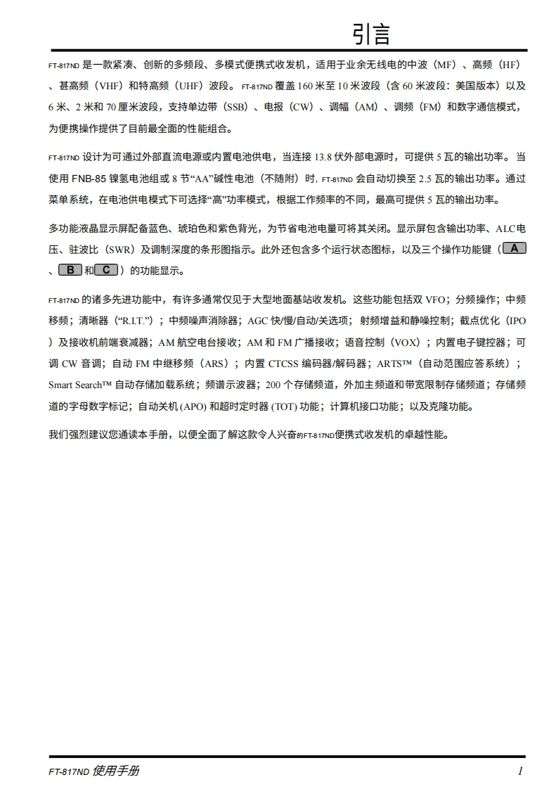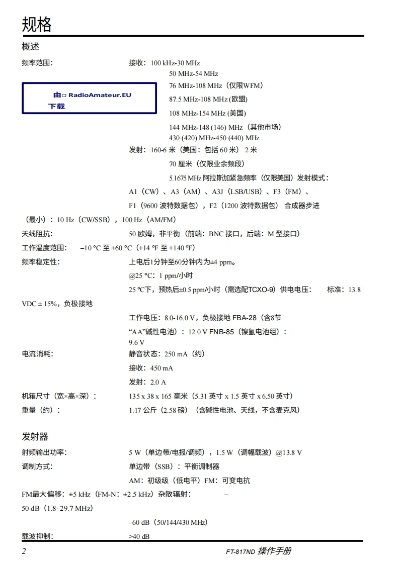 SYAESUHFNHF/UHF全模式收发机FT-817ND操作手册由口RadioAmateur..EU下载VERTEX STANDARD CO.,LTD.日本东京都目黑区中目黑4-8-8,邮编153-8644VERTEX STANDARD美国总部美国加利福尼亚州赛普里斯市沃克街10900号,邮编90630YAESU EUROPE B.V.P.O.Box 75525,1118ZN Schiphol,The NetherlandsYAESU UK LTD英国汉普郡温彻斯特温纳尔克洛斯太阳谷商业园12单元,邮编S0230LBVERTEX STANDARD HK LTD香港九龙观塘海滨道139-141号海景中心20楼5室