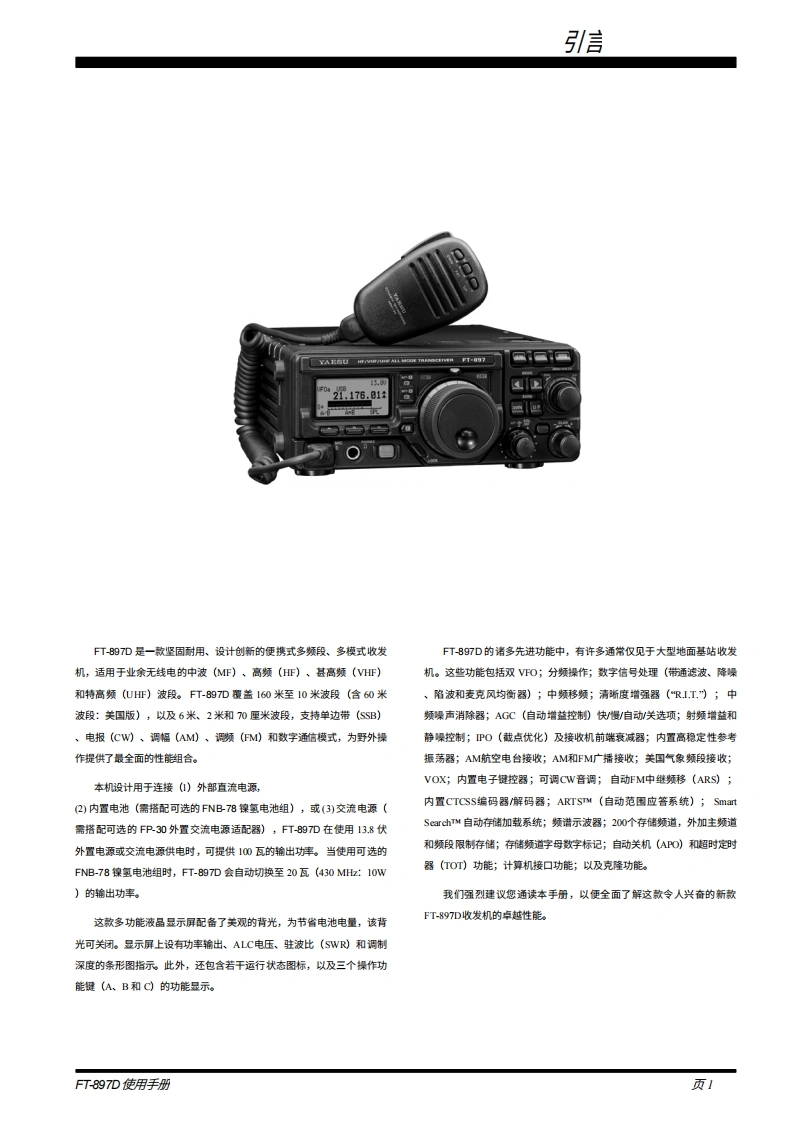 YAESUHFNHF/UHF全模式收发机FT-897D操作手册02.176.81VERTEX STANDARD CO.,LTD.日本东京都目黑区中目黑4-8-8,邹编153-8644VERTEX STANDARD芙国总部美国加利福尼亚州赛普里所市沃克街10900号,编90630YAESU EUROPE B.V.P.O.Box 75525,1118 ZN Schiphol,The NetherlandsYAESU UKLTD.英国汉普郡温彻所特温纳尔克洛所太阳谷商业园12单元,部编S023OLBVERTEX STANDARD HK LTD.香港九龙观塘海滨道139141号海景中心20楼5室