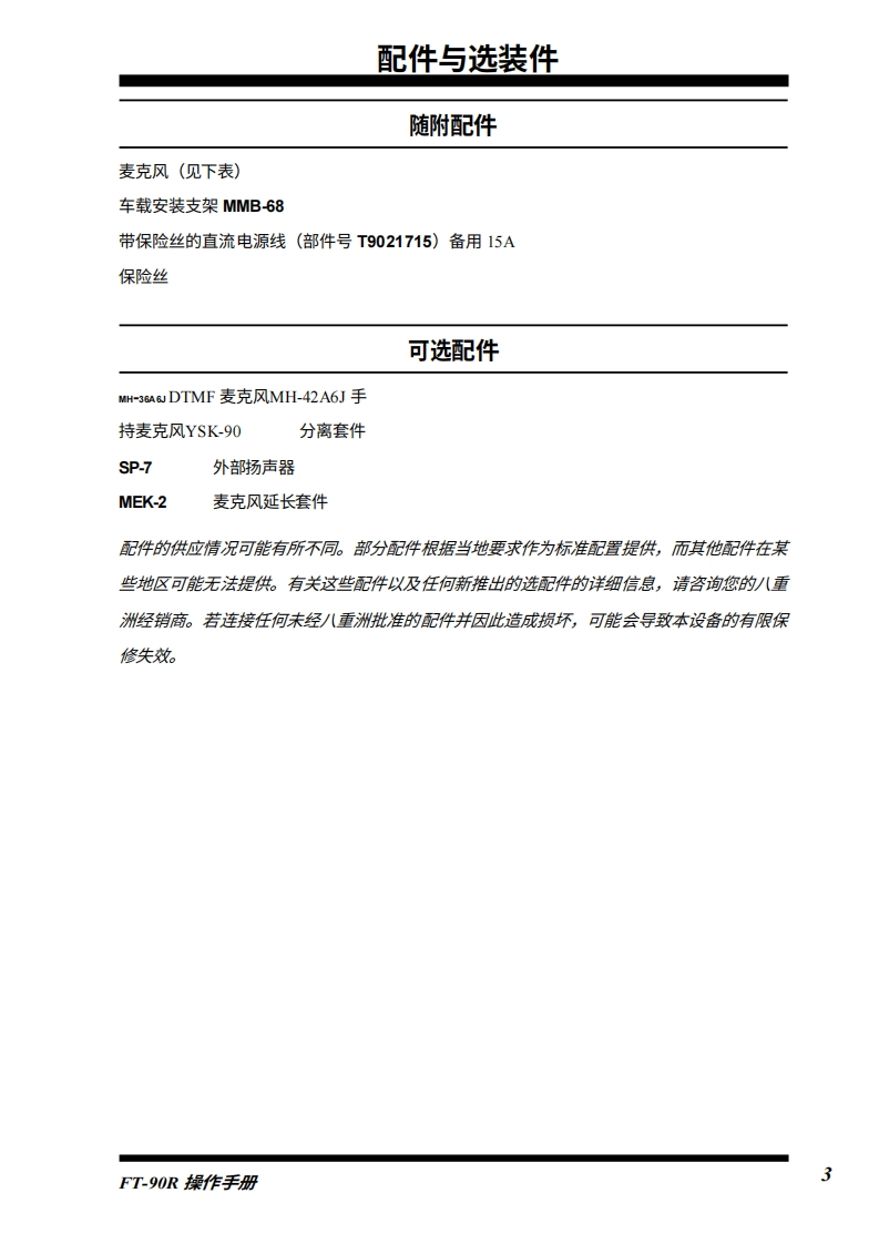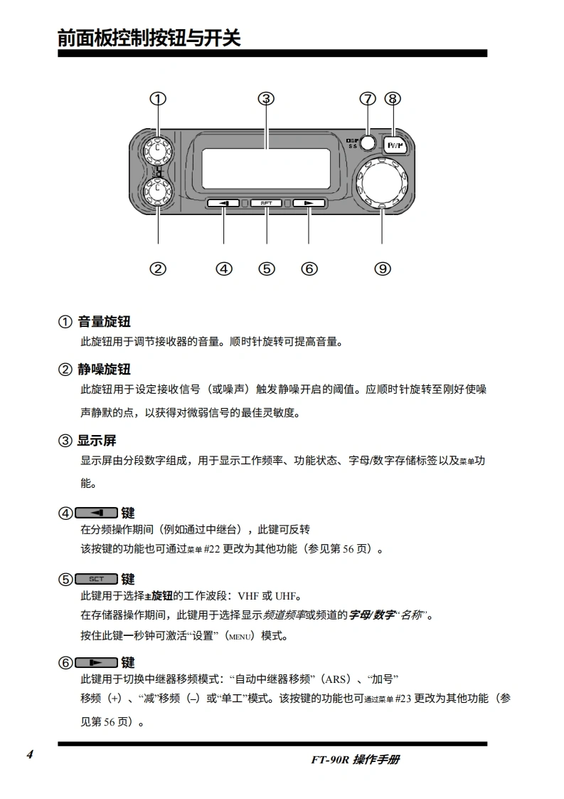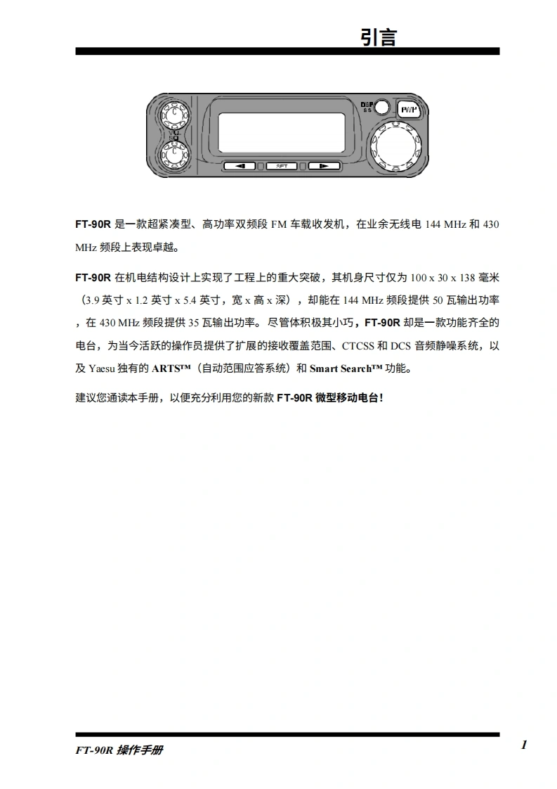 YAESUMICRO COMMANDERFT-9ORVHF/UHF DUAL BAND FM TRANSCEIVER操作手册DetachableFront Panel八重洲无线电株式会社日本东京都大田区下丸子1-20-2,邮编146-8649YAESU U.S.A.美国加利福尼亚州塞里托斯市爱德华兹路17210号,邮编90703YAESU EUROPE B.V.P.O.Box 75525 1118 ZN,Schiphol,The NetherlandsYAESU UK LTD.英国汉普郡温彻斯特温纳尔克洛斯太阳谷商业园12单元,邮编S0230LBYAESU GERMANY GmbHAm Kronberger Hang 2,D-65824 Schwalbach,GermanyYAESU HK LTD.香港九龙尖沙咀东莫迪道66号尖沙咀中心11楼