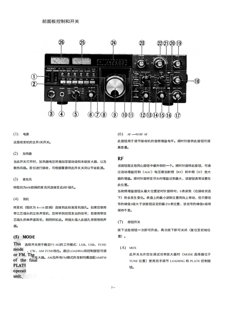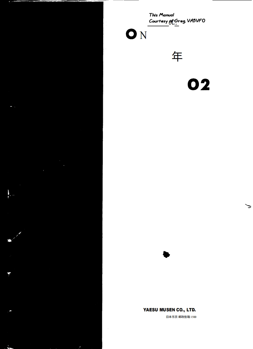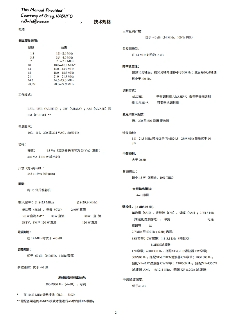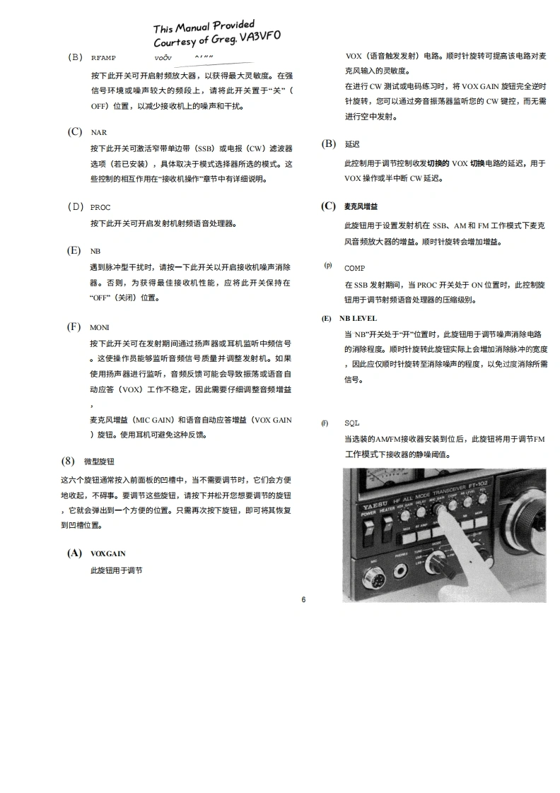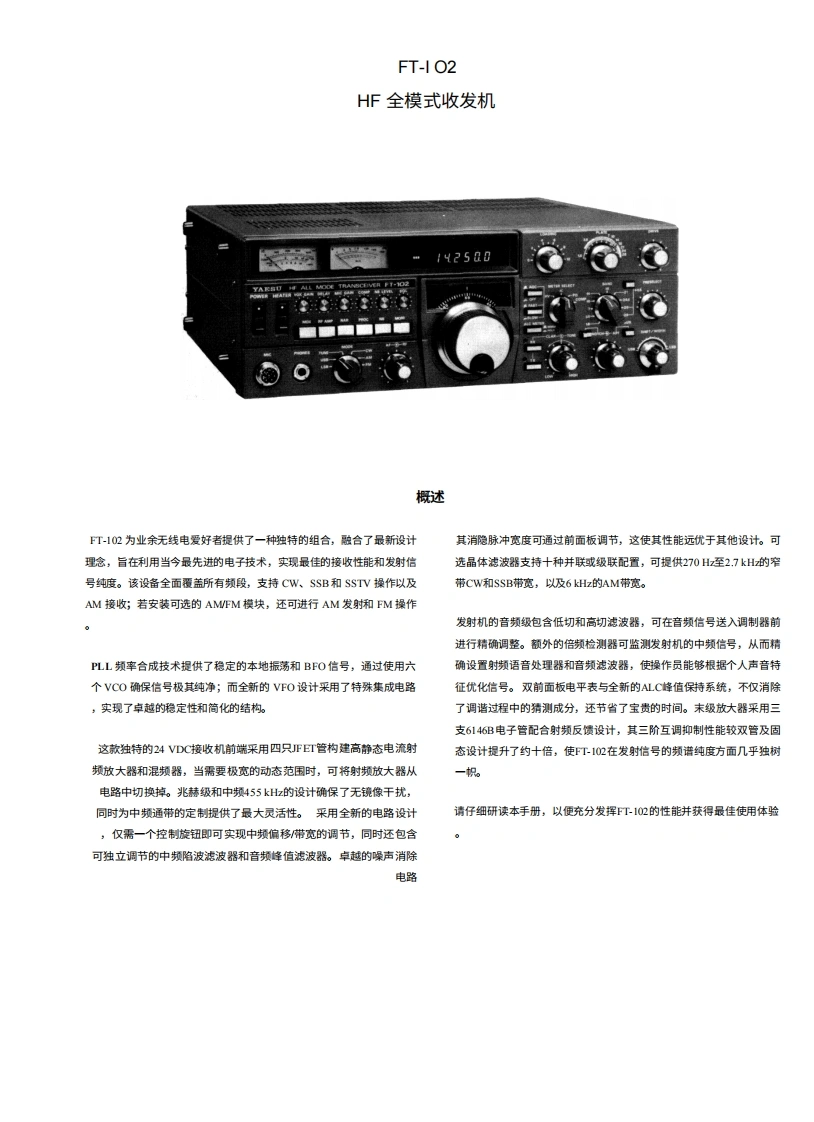 发件人:业余无线电台VA3VO格雷格怀特,所有者/操作员关于八重洲(¥a0a)102系列业余无线电设备来白加章大塞伦塞的问候!希望您能从庙附的八重洲手册中获益。多年来,我多次得到业余无线电爱好者的帮助,他们慷慨地通过邮寄和互联网免费分享手册。我希望借世此机会尽白己的一份力。我注意到著名的¥09u102系列无线电设备手册在互关网上一直缺失。作为一套完整的¥0u102电台的拥南者,我手头正好有这些手册。蜜于收到许塞关于手册的请求,我已将我的收藏扫描并在此免费提供给各位。我这样做,是希望这些资科能帮助格位让白己的八重洲102设备永久保特运行,并确保其性能完全符合出厂设计。我也深知,当手册损毁或遗失时,试图回忆那造早已淡忘的操作说明是多么令人泪丧!我要求这些文件仅限持有执照的业余无线电爱好者之间免费私下传插及个人使用,具应视同借阅性质。严禁因使用这些文件而收取任何费用,亦不得将其公开发布。这些文件仅供私人参考之用;若与其他业余无线电爱好者分享,请务必注明扫描及免费借阅的来源为本人。期待您续支持这卓越的T102收发机及其配件,共同助力其作分收藏品”的特续需求,并确保其在业余无线电历史中得应有的重。73此致格雷格怀特Va3VEO加拿大多伦多va3vtograc.ca