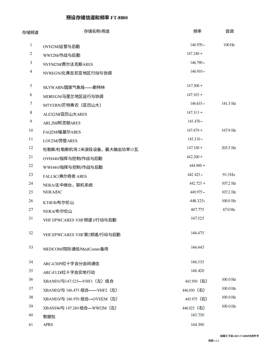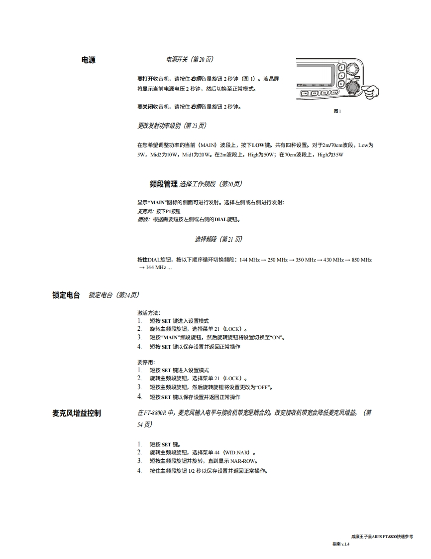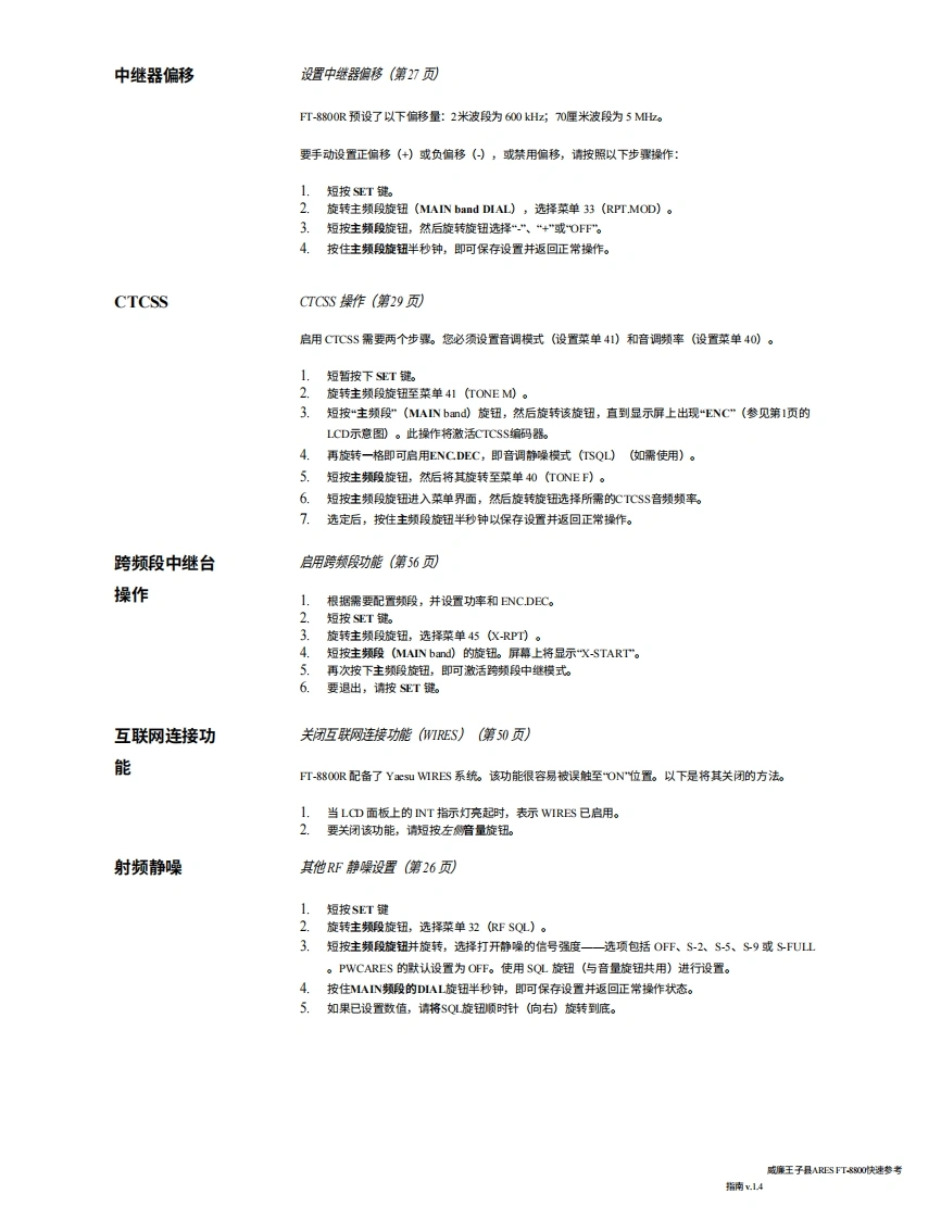 Yaesu FT-8800R基本操作本说明不能替代阅读用户手册⑥①①D①国①②④①①。④⑤⑥①①①e④⊙①①●FT-800R前面板:1)左旋钮,2)左音量静噪旋钮,3)超记忆按钮,4)左侧按键,5)设置键,6句右侧按键,7)右音量/静噪旋钮,8)右旋钮-Left"Band Memory Channel"Right"Band Memory Channel"Left"Band Frequency“Right"Band Frequency8-88E8屁+m-ENC EC+以8麦克风.1)PTT开关,2)键盘,3)P键,业☑☑4.升列4)指示灯开关,5)锁定开关,6)上下1.业I业1业00业0.业1业1业键BUsY■■■■■■■■7BuSY■■■■■■■■7MT MUTE DCS9600LMSET KEY2 MT MUTE/DCS 9600 LM“Let"Band S-&PO Meter"Right"Band S-&PO MeterFT80 OR LCD而板.注意事项:ENC=音调编码(TXT),DEC=音调码(RXT),Main=主频段(当前发射频段)仅会显示在左侧或右侧,具体取决于哪一侧处于“活动状态,MT=内存调谐模式201200bps Packet Setup注意:FT-880是一款双接收电台,拥有左右两侧以及相应的按键和旋钮。当前活动的一侧可通过活动显示屏右上角的“MAN图标识别。当说明中提及“MAN按键或旋钮时,指的是当前活动的收发机一侧,且不会影响非活动一侧,除非将非活动一侧设为活动状态。要选择主频段,请按下麦克风上的P1键,或按下您希望设为活动状态的那一侧的DLAL旋钮。威廉王子县ARES FT8900快速参考指南.14