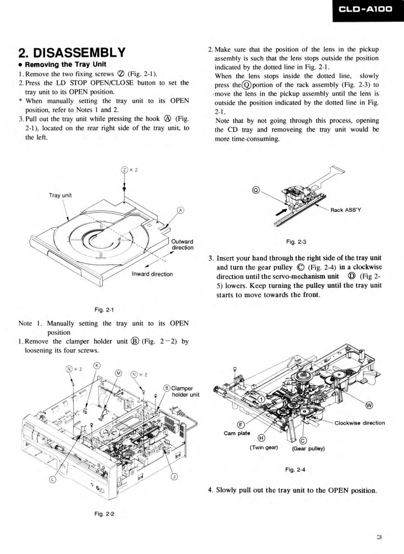 PIONEERThe Art of EntertainmentServicecManualORDER NO.ARP2757CD CDV LD PLAYERCLD-AT0OCLD-A100 HAS THE FOLLOWING:TypePower RequirementRemarksKUAC 120 V onlyThis manual is applicable to CLD-A100/KU.CONTENTS1.SAFETY INFORMATION…22.DISASSEMBLY…33.EXPLODED VIEWS AND PARTS LIST84.PACKING AND PARTS LIST...195.SCHEMATIC AND PCB CONNECTION DIAGRAMS ..206.PCB PARTS LIST44…677.ADJUSTMENTS…748.SYSTEM CONTROL DESCRIPTION........879.IC INFORMATION…10510.BLOCK D1 AGRAM…11111.PANEL FACILITIES......11312.SPECIFICATIONS.........115PIONEER ELECTRONIC CORPORATION 4-1,Meguro 1-Chome.Meguro-ku.Tokyo 153.JapanPIONEER ELECTRONICS SERVICE INC.P.O.Box 1760,Long Beach,Calitornia 90801 U.S.A.PIONEER ELECTRONICS OF CANADA,INC.300 Allstate Parkway Markham.Ontaro L3R OP2 CanadaPIONEER ELECTRONIC [EUROPE]N.V.Haven 1087 Keetberglaan 1.9120 Melsele.BelgiumPIONEER ELECTRONICS AUSTRALIA PTY.LTD.178-184 Boundary Road,Braeside,Victoria 3195,Australia TEL:[03]580-9911PIONEER ELECTRONIC CORPORATION 1993FJ JULY 1993 Printed in Japan