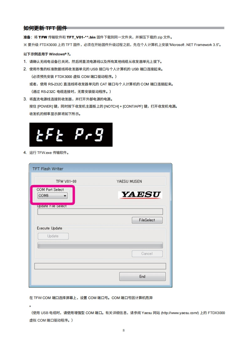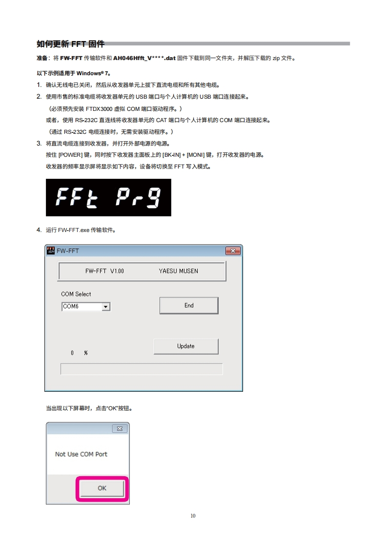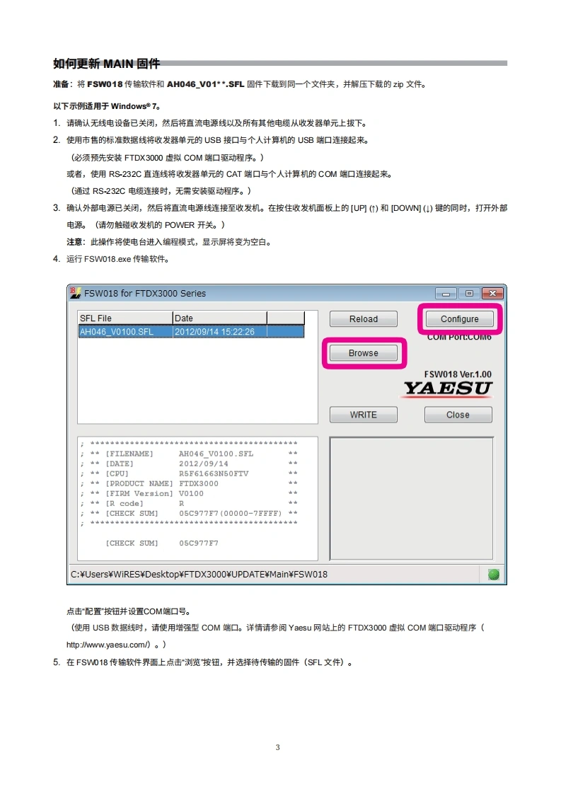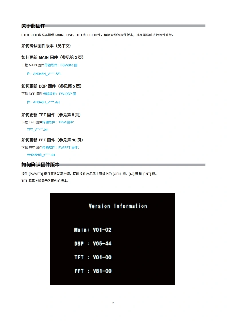 YA西SJFTDX3000The radio固件升级手册本软件是个人计算机软件,用于将FTDX3000收发机连接至个人计算机后对其固件进行更新。重要提示在下载本软件之前,请仔细阅读重要注意事项。下载或安装本软件即视为您同意重要注意事项中的内容。下文中的收发机指FTDX3000收发机。重要注意事项·使用本软件所产生的全部责任由客户自行承担。对于客户因使用本软件而可能遭受的任何损害或损失,我们概不负责软件而可能遭受的任何损害或损失,本公司概不承担任何责任。本软件及软件手册的版权和所有其他知识产权均归YAESU MUSEN CO,LTD.所有。禁止对本软件进行修订、修改、逆向工程和反编译。禁止再分发、转让和转售下载的文件。下载的文件仅限个人使用。如果您无法自行进行固件升级,请咨询我们的销售网点或服务中心。系统要求(运行环境)支持的操作系统·Microsofte Windows7·Microsofte Windows Vista TM(Service Pack1或更高版本)·Microsofte Windows XP(Service Pack3或更高版本)X要升级FTDX3000上的TFT固件,必须先在个人计算机上安装Microsoft.NET Framework3.5,然后才能开始固件升级过程CPU满足操作系统(OS要求的CPURAM(系统内存)符合或超过操作系统(OS)要求的RM(系统内存)容量HDD(硬盘)硬盘(HDD)的容量需满足或超过操作系统(OS)的要求除了为操作系统运行预留足够的可用空间外,该程序还需20MB或更多的可用空间。端口USB端口(USB1.1USB2.0)或RS-232C接口(C0M端口)在虚拟COM端口驱动程序安装完成之前,请勿将USB电缆连接到您的个人计算机和FTDX3000,否则可能会安装错误的驱动程序。USB驱动程序(用于通过USB端口进行版本升级)在开始固件升级过程之前,请先在个人计算机上安装FTDX3000虚拟C0M端口驱动程序。详情请参阅Yaesul网站上的FTDX3000USB驱动程序(虚拟COM端口驱动程序)(http://www.yaesu.com)。线缆USB电缆(AB型)或RS-232C直连电缆请准备市售的电缆。1