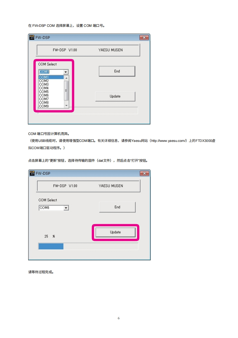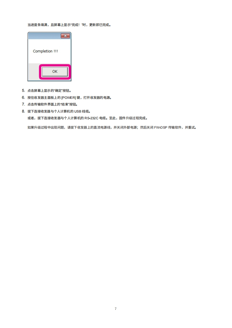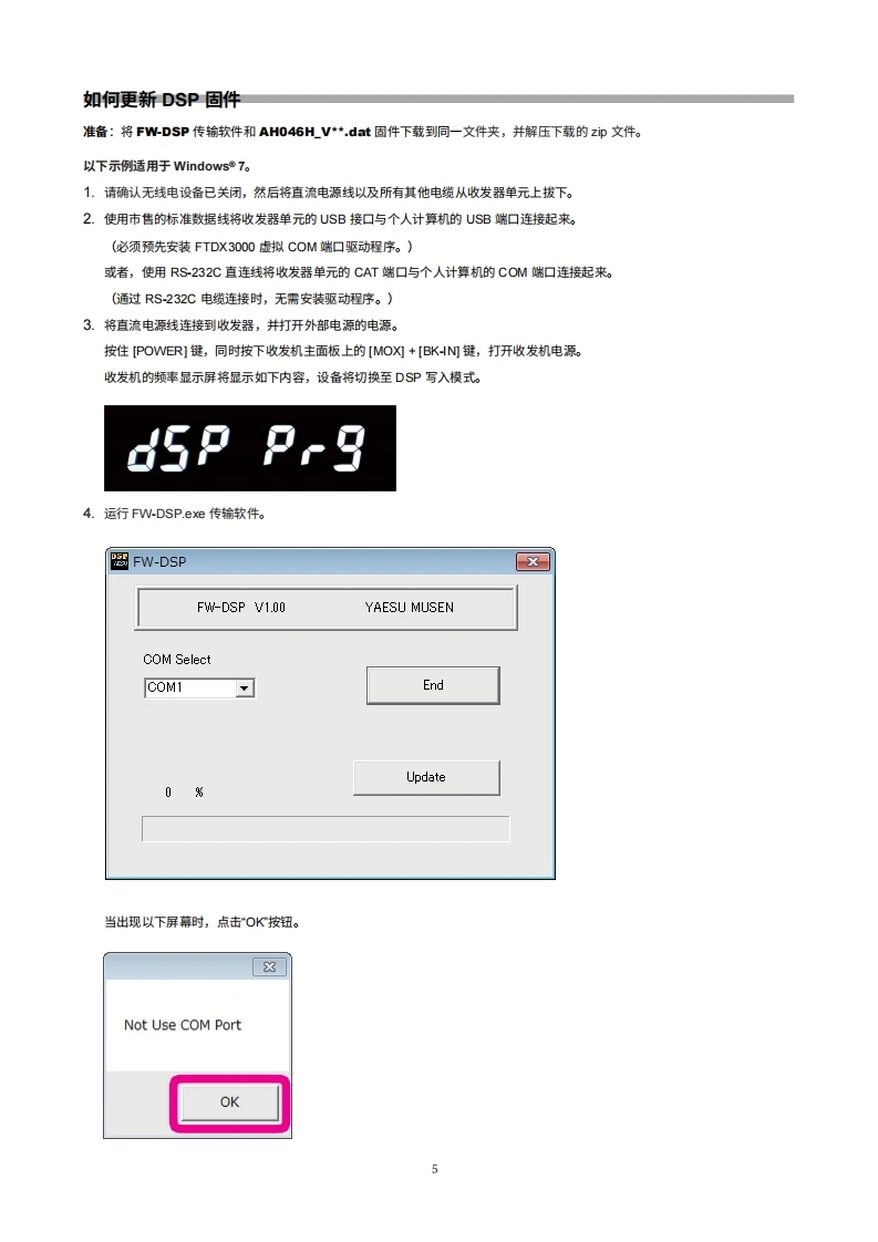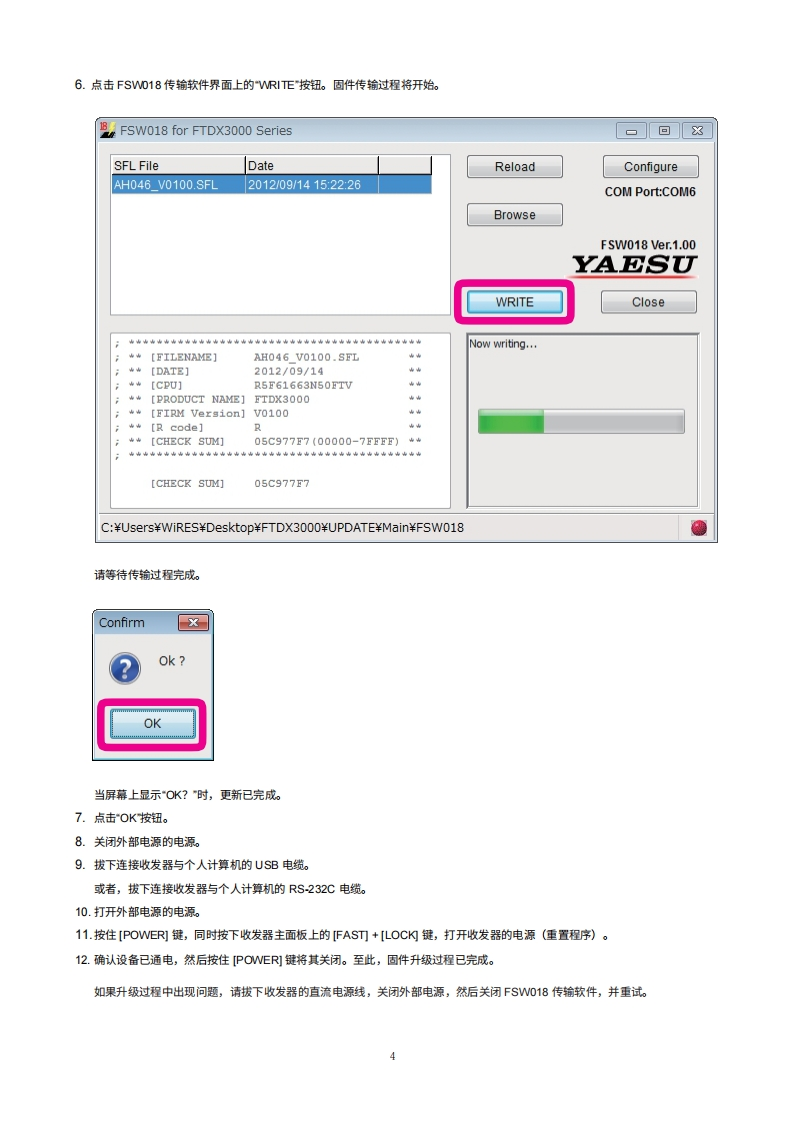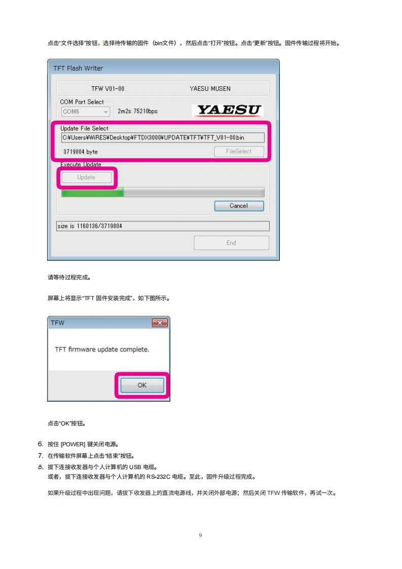 YA西SJFTDX3000The radio固件升级手册本软件是个人计算机软件,用于将FTDX3000收发机连接至个人计算机后对其固件进行更新。重要提示在下载本软件之前,请仔细阅读重要注意事项。下载或安装本软件即视为您同意重要注意事项中的内容。下文中的收发机指FTDX3000收发机。重要注意事项·使用本软件所产生的全部责任由客户自行承担。对于客户因使用本软件而可能遭受的任何损害或损失,我们概不负责软件而可能遭受的任何损害或损失,本公司概不承担任何责任。本软件及软件手册的版权和所有其他知识产权均归YAESU MUSEN CO,LTD.所有。禁止对本软件进行修订、修改、逆向工程和反编译。禁止再分发、转让和转售下载的文件。下载的文件仅限个人使用。如果您无法自行进行固件升级,请咨询我们的销售网点或服务中心。系统要求(运行环境)支持的操作系统·Microsofte Windows7·Microsofte Windows Vista TM(Service Pack1或更高版本)·Microsofte Windows XP(Service Pack3或更高版本)X要升级FTDX3000上的TFT固件,必须先在个人计算机上安装Microsoft.NET Framework3.5,然后才能开始固件升级过程CPU满足操作系统(OS要求的CPURAM(系统内存)符合或超过操作系统(OS)要求的RM(系统内存)容量HDD(硬盘)硬盘(HDD)的容量需满足或超过操作系统(OS)的要求除了为操作系统运行预留足够的可用空间外,该程序还需20MB或更多的可用空间。端口USB端口(USB1.1USB2.0)或RS-232C接口(C0M端口)在虚拟COM端口驱动程序安装完成之前,请勿将USB电缆连接到您的个人计算机和FTDX3000,否则可能会安装错误的驱动程序。USB驱动程序(用于通过USB端口进行版本升级)在开始固件升级过程之前,请先在个人计算机上安装FTDX3000虚拟C0M端口驱动程序。详情请参阅Yaesul网站上的FTDX3000USB驱动程序(虚拟COM端口驱动程序)(http://www.yaesu.com)。线缆USB电缆(AB型)或RS-232C直连电缆请准备市售的电缆。1