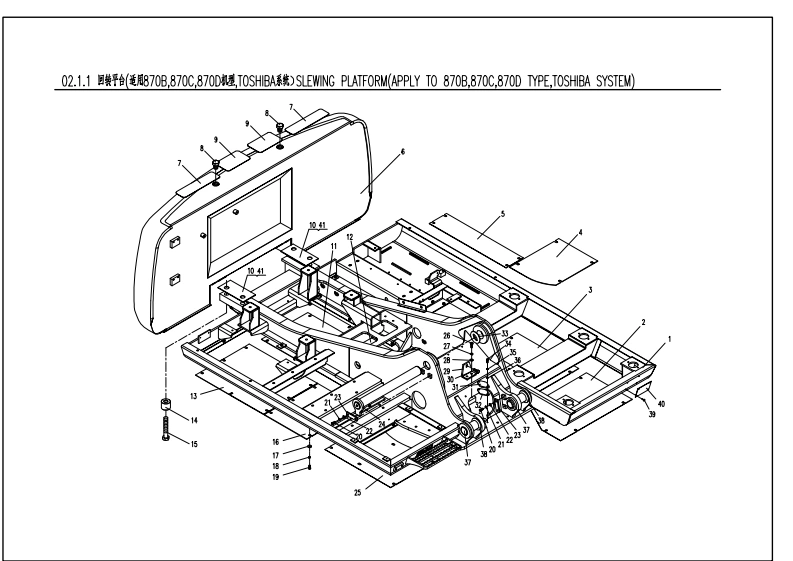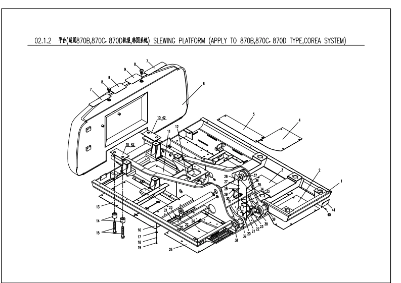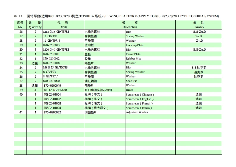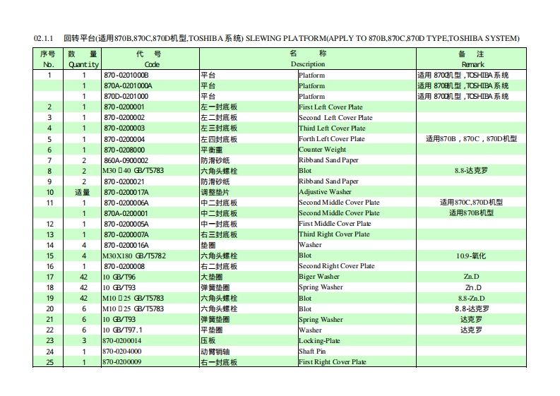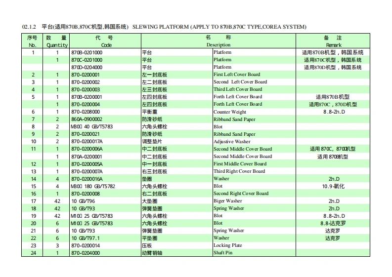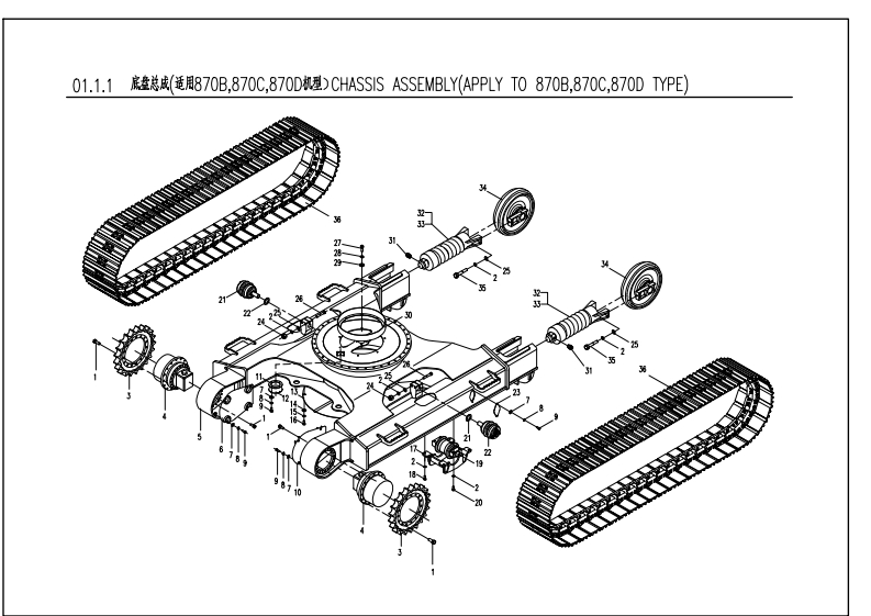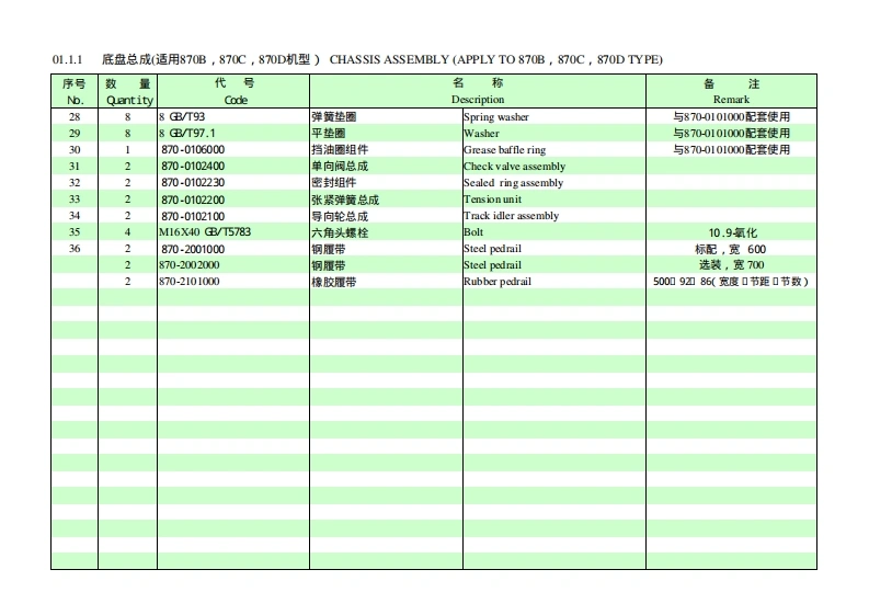 01.1.1底盘总成(适用870B,870C,870D机型)CHASSIS ASSEMBLY(APPLY TO870B,870C,870 D TYPE)序号数量代号名称备注No.QantityCodeDescriptionRemark170M16X45GB/T5783六角头螺栓Bolt12.9达克罗26416GB/T93弹簧垫圈Spring washer达克罗32870-0100001驱动轮Driving wheel42870-7505000行走马达Traveling motor1870-0101000车架总成Chassis assembly标配870-0121000车架总成Chassis assembly选装,配推土铲61870-0109000左马达盖板Left motor shield11610B/T97.1垫圈Washer1610B/T93弹簧垫圈Spring washer916M1020G⊕/T5783六角头螺栓Bolt8.8-Zn.D101870-0111000右马达盖板Right motor shield111870-0100002密封垫Sealed ring121870-0100003油口盖板Cover plate13870-0108000封底板Chassis cover plate14410GB/T97.1平垫圈Washer15410E/T93弹簧垫圈Spring washer164M225G⊕/T5783六角头螺栓Bolt8.8-Zn.D172870-0107000防脱架Guard Track188M16X45GB/T5783六角头螺栓Bolt10.9氧化1914870-0104000支重轮总成Idler assembly2056M6X90B/T5782六角头螺栓Bolt10.9达克罗212870-0100004调节垫片Shim222870-0105000托链轮总成Camrier roller assembly232860-0100002侧盖板Side cover plate244M16GB/T6170六角头螺栓Nut2516GB/T97.1平垫圈Washer264M16X120GB/T5782六角头螺栓Bolt10.9-达克罗278w8X16GE/T5783六角头螺栓Bolt与8700101000配套使用