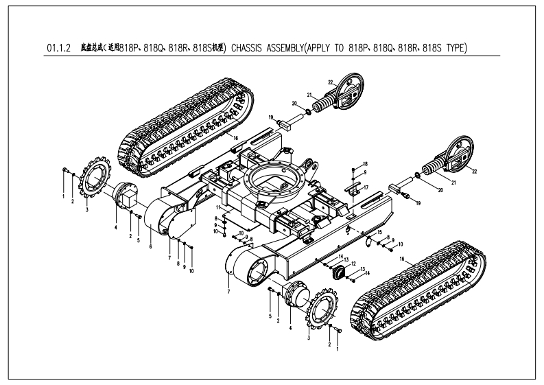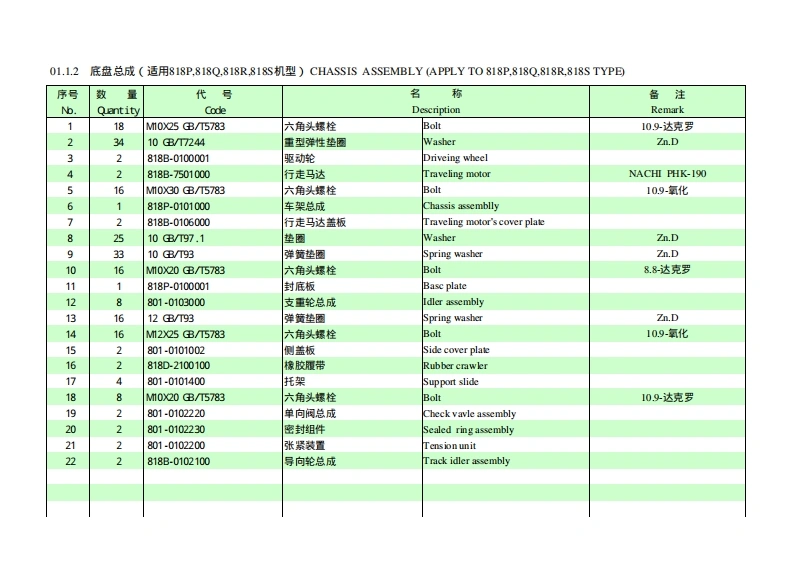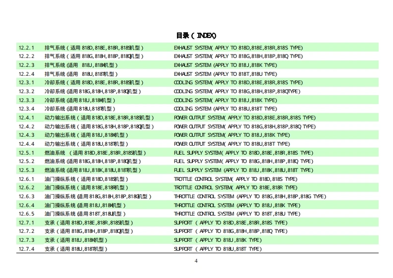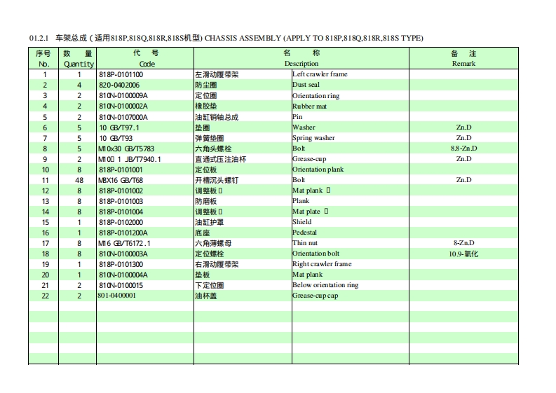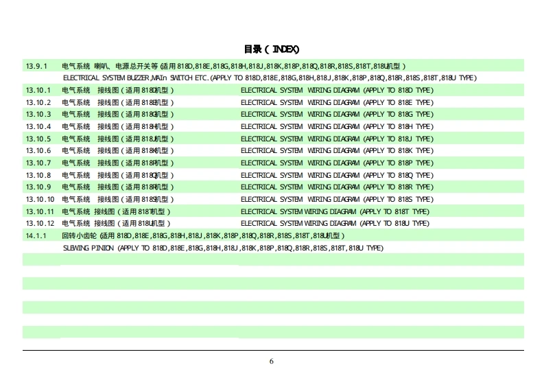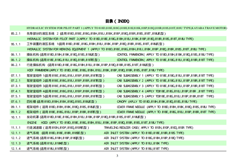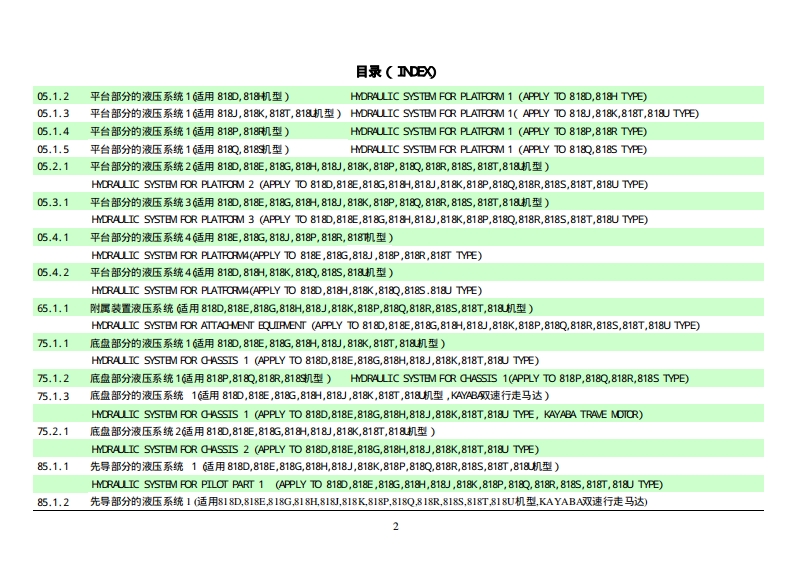 目录(DE)01.1.1底盘总成G适用818D,818E,818G,818H,818J,818K,818T,818机型)CHASSIS ASSEMBLY(APPLY TO 818D,818E,818G,818-,818J,818K,818T,818U TYPE)01.1.2底盘总成G适用818P,8180,818R,8189机型)CHASSIS ASSEMBLY (APPLY TO 818P,818Q,818R,818S TYPE)01.2.1车架总成(适用818P,8180,818R,8189机型)CHASSIS ASSEMBLY (APPLY TO 818P,818Q,818R,818S TYPE)01.3.1回转支承(适用818D,818E,818G,818H,818J,818K,818P,8180,818R,8185,818T,818机型)BW0 G SUPPORT(PPLY TO0818D,818E,818G,818H,818,818K,818P,8180,818R,818S,818T,818 J TYPE)02.1.1回转平台G适用8180,818E,818R,8189机型)SLEWING PLATFORM CHASSIS (APPLY TO 818D,818E,818R,818S TYPE)02.1.2回转平台G适用818G,818H,818P,818C机型)SLEWING PLATFORM CHASSIS (APPLY TO 818G,818H,818P,818Q TYPE02.1.3回转平台G适用818J,818机型)EWING PLATFORM CH4SsIS(APPLY TO818」,818 K TYPE)02.1.4回转平台G适用818T,818机型)SLEWING PLATFORM CHASSIS (APPLY TO 818T,818U TYPE03.1.1推土装置(适用8180,818E,818G,818H,818),818K,818T,818机型)ER0UENT(PPLY TO08180,818E,818G,818H,818J,818K,818T,818UTYE)03.1.2推土装置(适用818P,818Q,818R,818机型)DOZER EOUIRMENT(APPLY TO 818P,818Q,818R,818S TYPE)04.1.1工作装置1(适用8180,818E,818G,818H,818),818K,818P,8180,818R,818S,818T,818机型)V0 RKING EQUIPMVENT1(APPLY T08180,818E,818G,818H,818,818K,818P,818Q,818R,818s,818T,818UTYE04.2.1工作装置2(适用8180,818E,818G,818H,818),818K,818即P,8180,818R,818S,818T,818机型)V0 RKING EQUIPMVENT2(APPLY T08180,818E,818G,818H,818,818K,818P,818Q,818R,818s,818T,818UTYE04.3.1工作装置3(适用8180,818E,818G,818H,818,818K,818P,8180,818R,818S,818T,818机型)V0 RKING EQUIPMVENT3(PPLY T08180,818E,818G,818H,818.,818K,818P,818Q,818R,818s,818T,818 J TYPE04.4.1工作装置4(适用8180,818E,818G,818H,818),818K,818P,8180,818R,818S,818T,818机型)V0 RKING EQUIPMVENT4(APPLY7T0818D,818E,818G,818H,818J,818K,818P,818Q,818R,818S,818T,818 J TYPE04.5.1工作装置5(适用8180,818E,818G,818H,818」,818K,818P,818Q,818R,818s,818T,818机型)V0 RKING EQUIPMVENT5(APPLY T08180,818E,818G,818H,818J,818K,818P,818Q,818R,818S,818T,818 J TYPE05.1.1平台部分的液压系统1适用818E,818机型)HMYDRAULIC SYSTEM FOR PLATFORM 1(APPLY TO 818E,818G TYPE)