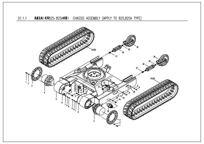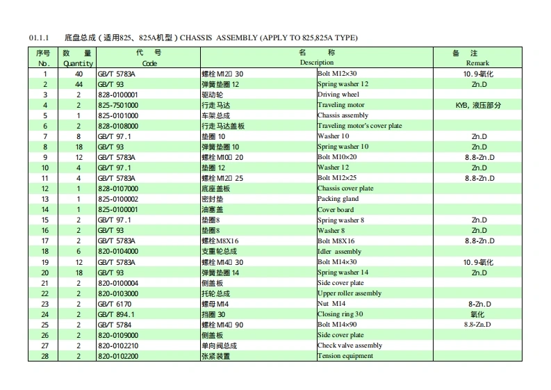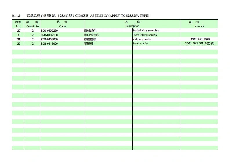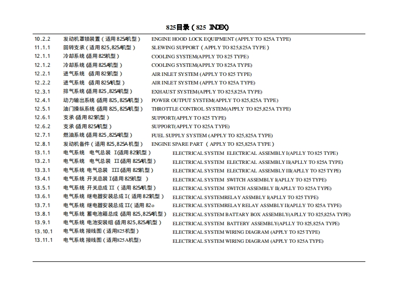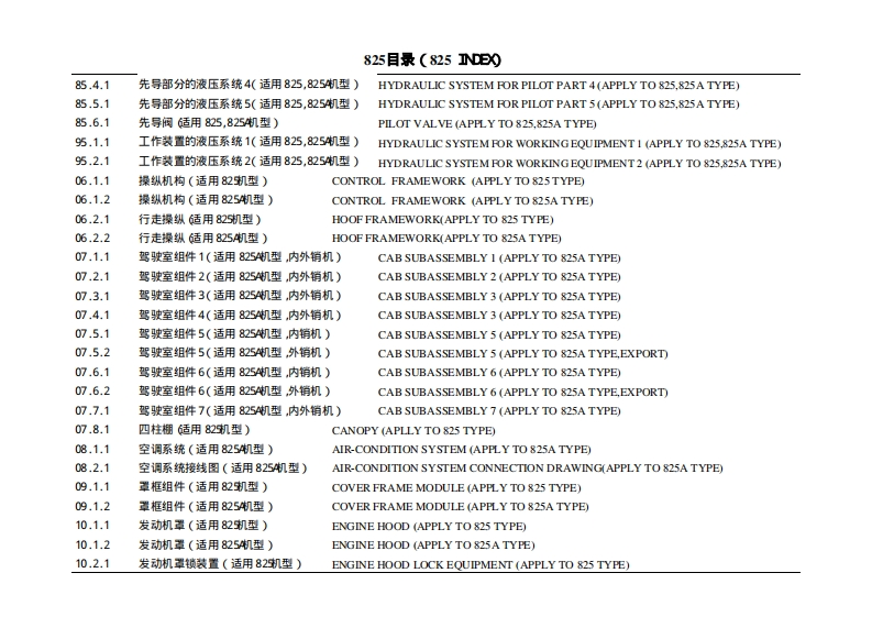 825目录(825DE001.1.1底盘总成6适用825,825机型)CHASSIS ASSEMBLY APPLY TO 825,825A TYPE02.1.1回转平台(适用82机型)SLEWING PLATFORM (APPLY TO 825 TYPE02.1.2回转平台(适用825机型)SLEWING PLATFORM (APPLY TO 825A TYPE03.1.1推土装置(适用825,825凯型)DOZER EOUIPMENT (APPLY TO 825.825A TYPE)04.1.1工作装置1(适用825,825机型)WORKING EQUIPMENT 1 (APPLY TO 825,825A TYPE)04.2.1工作装置2(适用825,825机型)WORKING EQUIPMENT 2 (APPLY TO 825,825A TYPE)04.3.1工作装置3(适用825,825机型)WORKING EQUIPMENT 3 (APPLY TO 825,825A TYPE)04.4.1工作装置4(适用825,825机型)WORKING EQUIPMENT 4 (APPLY TO 825,825A TYPE)04.5.1工作装置5(适用825,825机型)WORKING EQUIPMENT 5 (APPLY TO 825,825A TYPE)05.1.1平台部分的液压系统1(适用825,825机型)HYDRAULIC SYSTEM FOR PLATFORM1(APPLY TO825,825 A TYPE)05.2.1平台部分的液压系统2(适用825,825机型)HYDRAULIC SYSTEM FOR PLATFORM2(APPLY TO825,825 A TYPE)05.3.1平台部分的液压系统3(适用825,825机型)HYDRAULIC SYSTEM FOR PLATFORM3(APPLY TO825,825 A TYPE)05.4.1平台部分的液压系统4(适用825,825机型)HYDRAULIC SYSTEM FOR PLATFORM4(APPLY TO 825,825A TYPE)05.5.1平台部分的液压系统5(适用825,825机型)HYDRAULIC SYSTEM FOR PLATFORM5(APPLY TO825,825 A TYPE)05.6.1平台部分的液压系统6(适用825,825机型)HYDRAULIC SYSTEM FOR PLATFORM6(APPLY TO 825,825A TYPE)05.7.1平台部分的液压系统7(适用825,825机型)HYDRAULIC SYSTEM FOR PLATFORM7(APPLY TO 825,825A TYPE)05.8.1平台部分的液压系统8(适用825,825机型)HYDRAULIC SYSTEM FOR PLATFORM8(APPLY TO825,825 A TYPE)05.9.1平台部分的液压系统9(适用825,825机型)HYDRAULIC SYSTEM FOR PLATFORM9(APPLY TO825,825 A TYPE)05.10.1平台部分的液压系统10(适用825,825机型)HYDRAULIC SYSTEM FOR PLATFORM10(APPLY TO825,825 A TYPE05.11.1平台部分的液压系统11(适用825,825机型)HYDRAULIC SYSTEM FOR PLATFORM1I(APPLY TO825.825 A TYPE)05.12.1平台部分的液压系统12(适用825,825机型)HYDRAULIC SYSTEM FOR PLATFORM12(APPLY TO825,825 A TYPE)75.1.1底盘部分的液压系统1(适用825,825机型)HYDRAULIC SYSTEM FOR CHASSIS1(APPLY TO825,825 A TYPE)75.2.1底盘部分的液压系统2(适用825,825机型)HYDRAULIC SYSTEM FOR CHASSIS1(APPLY TO825,825 A TYPE)85.1.1先导部分的液压系统1(适用825,825机型)HYDRAULIC SYSTEM FOR PILOT PART1(APPLY TO825,825 A TYPE)85.2.1先导部分的液压系统2(适用825,825机型)HYDRAULIC SYSTEM FOR PILOT PART2(APPLY TO825,825 A TYPE)85.3.1先导部分的液压系统3(适用825,825机型)HYDRAULIC SYSTEM FOR PILOT PART3(APPLY TO825,825 A TYPE)