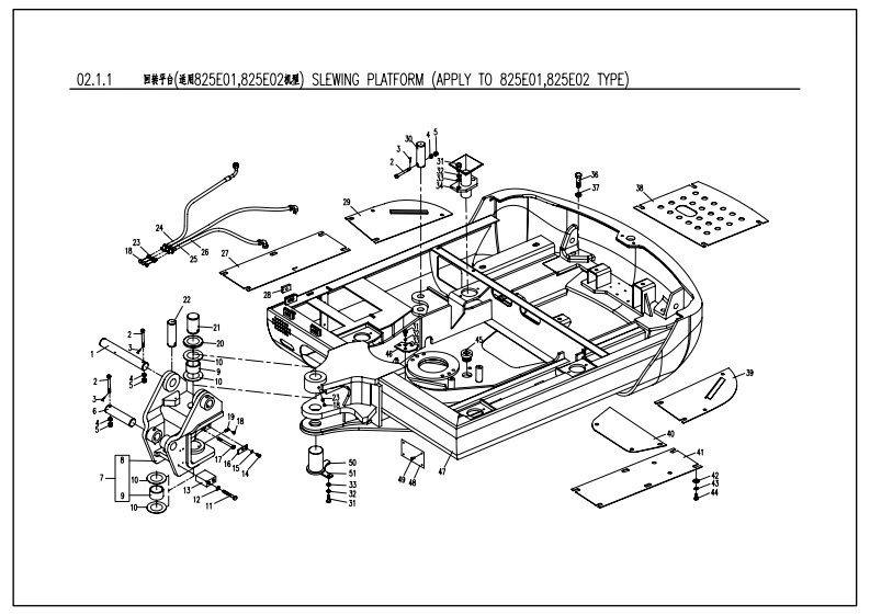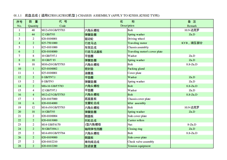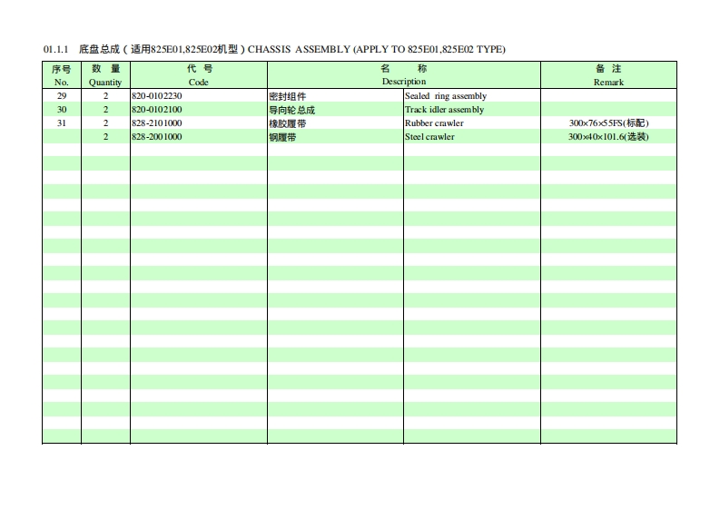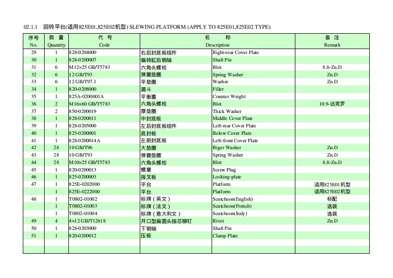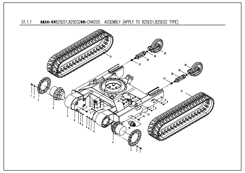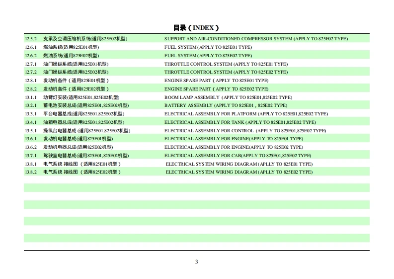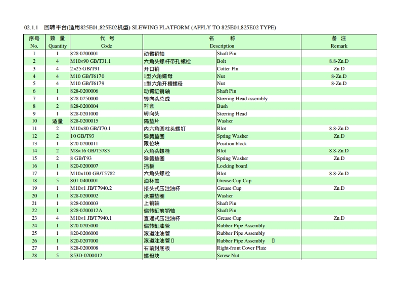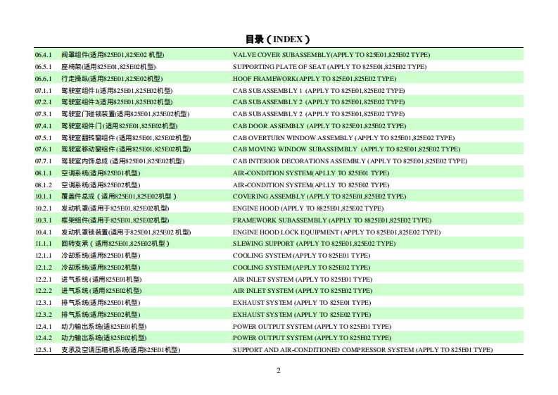 目录(NDEX)01.1.1底盘总成(适用25E0182502机型)CHASSIS ASSEMBLY (APPLY TO 825E01825E02 TYPE)2.1.1回转平台(适用825E01825E02机型)SLEWING PLATFORM (APPLY TO 825E01.,825E02 TYPE)0B.1.1推土装置(适用825E01,825B02机型DOZER EOUIPMENT (APPLY TO 825E01,825E02 TYPE)04.1.1动臂安装(适用25E01825B02机型)BOOM ASSEMBLY (APPLY TO 825E01825E02 TYPE)04.2.1斗杆连杆安装(适用25E01,825E02机型)ARM-CONNECTING ASSEMBLY (APPLY TO 825E01825E02 TYPE043.1铲斗安装(适用25E01825B02机型)BUCKET ASSEMBLY (APPLY TO 825E01.825E02 TYPE)04.4.1连杆组件(适用825E01,825B02机型CONNECTING ROD ASSEMBLY APPLY TO 825E01825E02 TYPE045.1斗杆组件(适用825E01,825B02机型ARM ASSEMBLY (APPLY TO 825E01.825E02 TYPE)5.1.1油箱总成(适用825E0182502机型)TANK ASSEMBLY (APPLY TO825E01825E02 TYPE5.2.1主液压系统-供油(适用825E01,825E02机型)MAIN HYDRAULICSYSTEM-HYDRAULIC OIL SUPPLY(APPLY TO 825E01,825E02 TYPE)053.1主液压系统-回油适用825E01,825E02机型)MAIN HYDRAULIC SYSTEM-OIL RETURN (APPLY TO 825E01.825E02 TYPES.4.1主液压系统-中央接头及推土阀适用82SE0L,25E02机型)MAIN HYDRAULIC SYST正M-CENTRE JOINT AND DOZER VALVE(APPLYTO25E01825EO2TYPE)5.5.1主液压系统-回转马达(适用825E01,825E02机型)MAIN HYDRAULIC SYSTEM-SLEWING MOTOR (APPLY TO 825E01,825E02 TYPE5.6.1主液压系统-多路阀适用825B01825E02机型MAIN HYDRAULICSYSTEM-MULTIPLE-WAY VALVE (APPLY TO 825E01.825E02 TYPE)05.7.1中央回转接头适用825E01825E02机型)CENTRE SLEWING JOINT (APPLY TO 825E01,825E02 TYPE)6⑤.1.1射属装置液压系统1适用825E01,825E02机型)AUXILIARY BQUIPMENT HYDRAULIC SYSTEM 1 (APPLY TO 825E01.,825E02 TYPE)6⑤.2.1附属装置液压系统1(适用825E01,825E02机型)AUXILIARY BQUIPMENT HYDRAULIC SYSTEM 2 (APPLY TO 825E01,825E02 TYPE)75.1.1底盘部分的液压系统-行走(适用825E01,825E02机型)HYDRAULIC SYSTEM FOR CHASSIS-TRAVELING (APPLY TO 825E01,825E02 TYPE)752.1底盘部分的液压系统-推土(适用8201825E02机型)HYDRAULIC SYSTEM FOR CHASSIS BULLDOZE (APPLY TO 825E01.825802 TYPE)85.1.1先导控制液压系统供油适用825E01,25E02机型)PILOT BQUIPMENT HYDRAULIC SYSTEM -OIL SUPPLY (APPLY TO 825E01,825E02 TYPE)852.1先导控制液压系统总成(适用825E01,25E02机型PILOT BQUIPMENT HYDRAULIC SYSTEM ASSEMBLY (APPLY TO 825E01,825E02 TYPE)853.1先导部分液压系统先导操纵适用82501825E02机型)HYDRAULIC SYSTEM FOR PILOT CONTROL(APPLY TO 825E01,825E02 TYPE)5.1.1工作装置液压系统适用825E01,825E02机型)HYDRAULIC SYSTEM FOR WORKING BQUIPMENT (APPLY TO 825E01,825E02 TYPE)06.1.1操纵机构适用825E01825E02机型)CONTROL FRAMEWORK(APPLY TO 825E01,825E02 TYPE)062.1右操纵箱组件适用825E01825E02机型)RIGHT MANIPULATE BOX SUBASSEMBLY (APPLY TO 825E01.825E02 TYPE)063.1左操纵箱组件适用825E01825E02机型)LEFT MANIPULATE BOX SUBASSEMBLY (APPLY TO 825E01.825E02 TYPE)1