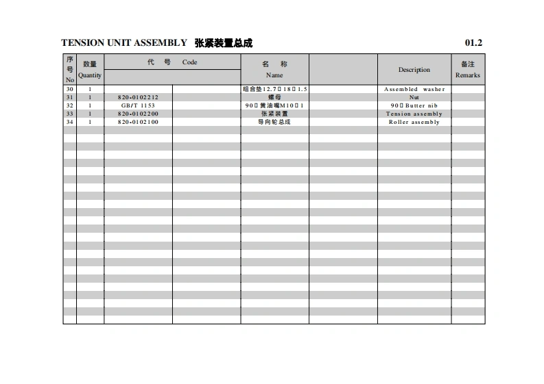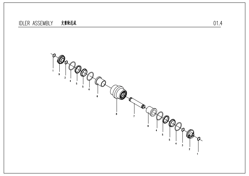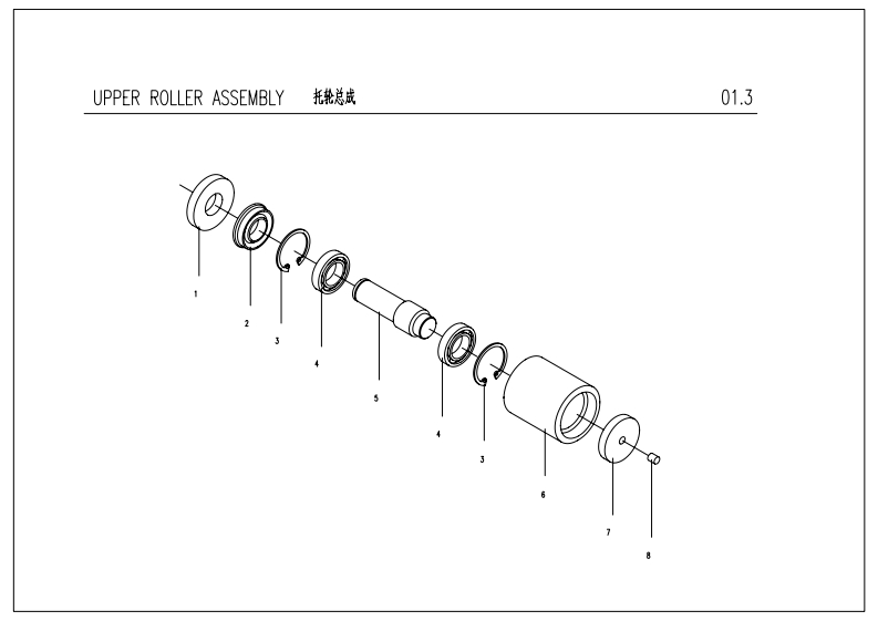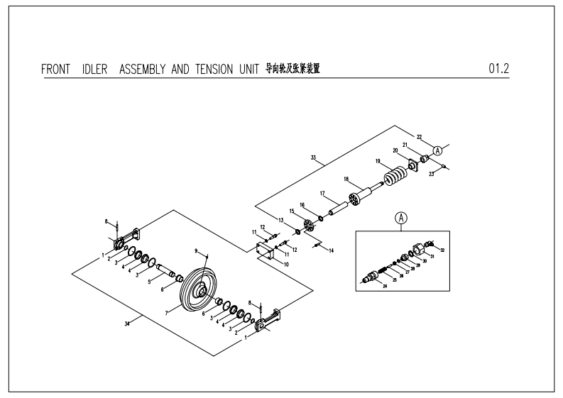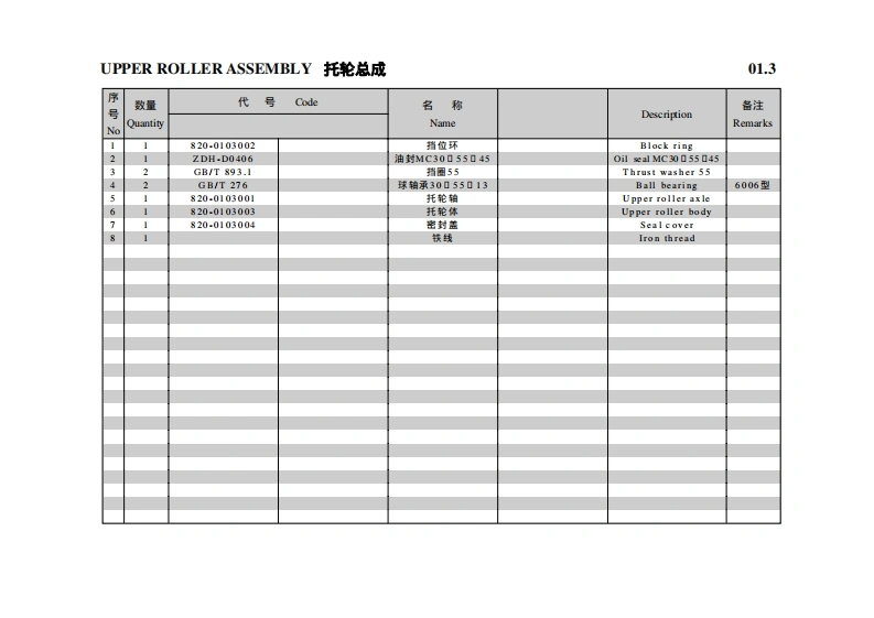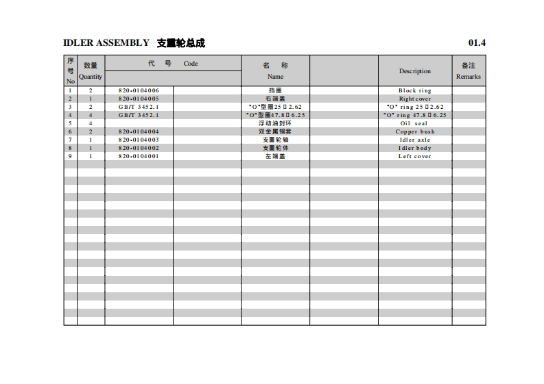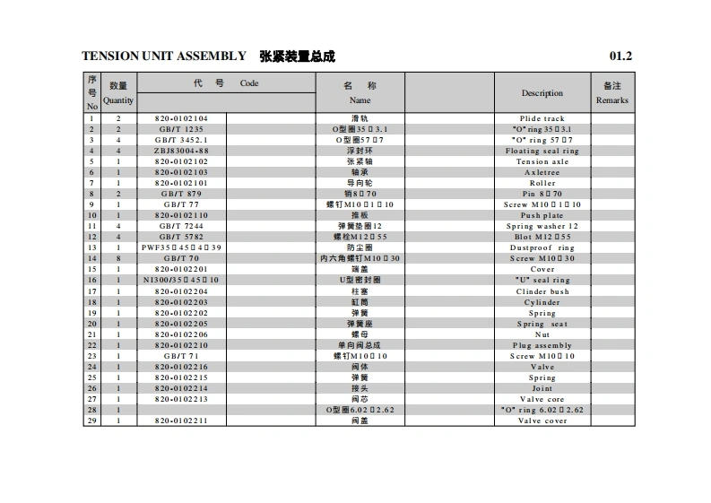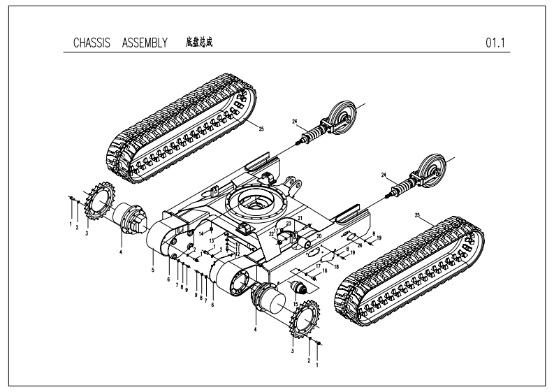 CHASSIS ASSEMBLY底盘总成01.1序代号Code号数量名称备注DescriptionNoQuantityNameRemarks36GB/T 5783A螺栓M12030Bo1tM1203512.9.氧化236GB/T 93弹簧垫国12Sp平ing washer1232828.0100001驱动轮Driving wheel42行走马达Traveling motorKAYABA51828-0101000车架总成Chassis assembly62828-0108000行走马达盖板Traveling motor'x cover plate78GB/T 97.1垫国10washer 10820GB/T 93弹簧垫国10S pring washer 1098GB/T 5783A螺栓M10020Bo1tM100258.8-Zn.D104GB/T 96垫国12washer 12114GB/T 93弹簧垫国12Spring washer 1212GB/T 5783A螺栓M12025Bo1tM120258.8-Zn.D13828.0107000底座盖板Chassis cover plate141820-0100002螺塞plug158820-0104000支重轮总成Idler assembly1616GB5783-86蝶栓M14口30Bo1tM1404010.9.氧化1718GB/T 93弹簧垫回14Spring washer 14184820-0100004侧盖板side cover plate1912GB5783.86螺栓M10020Ba1tM100208.8.Zn.D202820-0103000托轮总成Upper roller assembly212GB/T 5784螺栓M14口80Bo1tM14口8010.9.氧化222GB/T 6170螺母M14Nut M14232GB/T894.1挡国30block ring 35242820.0102000张景装置总成Tension unit assembly252828-0106000橡胶履带Rubber Crawler