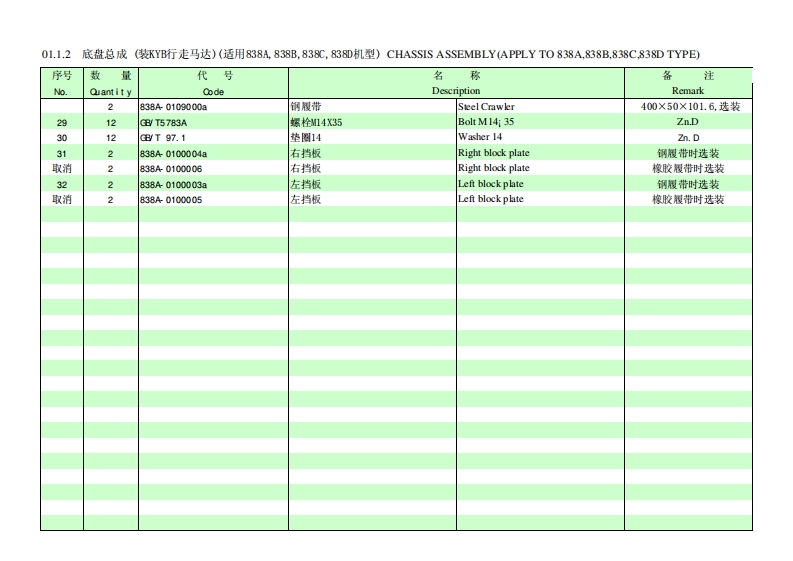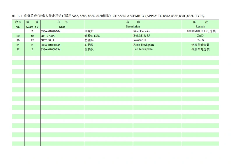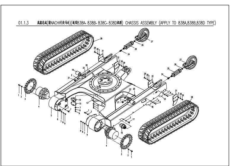 0L.1.1底盘总成(装帝人行走马达)(适用838A,838B,838C,838D机型)CHASSIS ASSEMBLY(APPLY TO838A,838B,838C,838 D TYPE)序号数量代号名称备注No.Qiantit yCodeDescriptionRemark136G田T5783A螺栓M12×35Bolt M12j 3512.9-氧化270CB/T 93弹簧垫图14Spring washer 14Zn.D2815-0100002驱动轮Driving wheel2行走马达Traveling motor帝人马达,液压部分5183840101000车架总成Chassis assembly2820-0108000行走马达盖板Traveling motor's cover plate722GB/T 97.1垫图10Washer 10822G田T93弹簧垫图10Spring washer 1022G田T70螺栓M10×16Bolt M10j 168.8-Zn.D104GB/T 97.1垫图12Washer 1211CB/T 93弹簧垫图12Spring washer 12124CB/T 5783A螺栓M12×25Bolt M12j 258.8-Zn.D131850-0107000封底板Chassis cover plate14183840100002密封垫Packing gland151838A0100001油口盖板Cover board1610820-0104000支重轮总成Idler assembly1720GB/T 5783A螺栓M14×30Bolt M14j 3010.9-氧化倍2820-0100004侧盖板Side cover plate19838A0104000托轮总成Carrier roller assembly20G田T5784螺栓M14×90Bolt M14j 9010.9-氧化212GB/T 6170螺母W14Nut M14222G田T894.1挡图30Block ring 352820-0109000侧盖板IISide cover plate II243820-0102210单向阀总成Check valve assembly283840102000张紧装置总成Tension unit assembly262820-0102230密封组件Sealed ring assembly272820-0102100导向轮总成Track idler assembly28283840103000橡胶履带Rubber Crawler300194155F08s