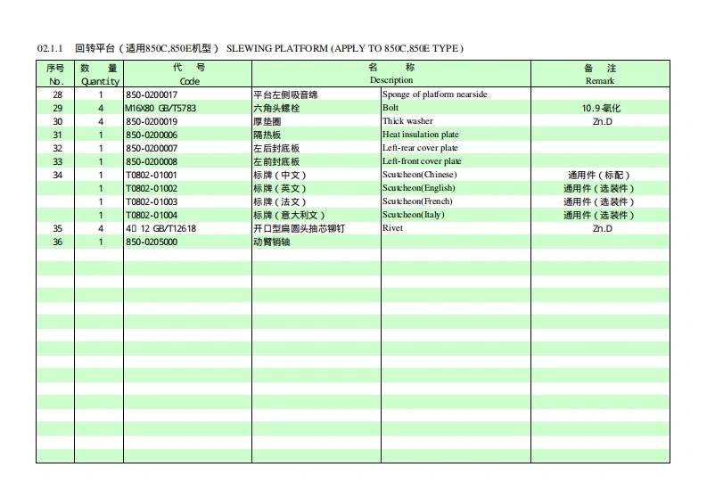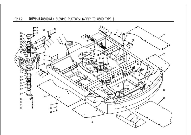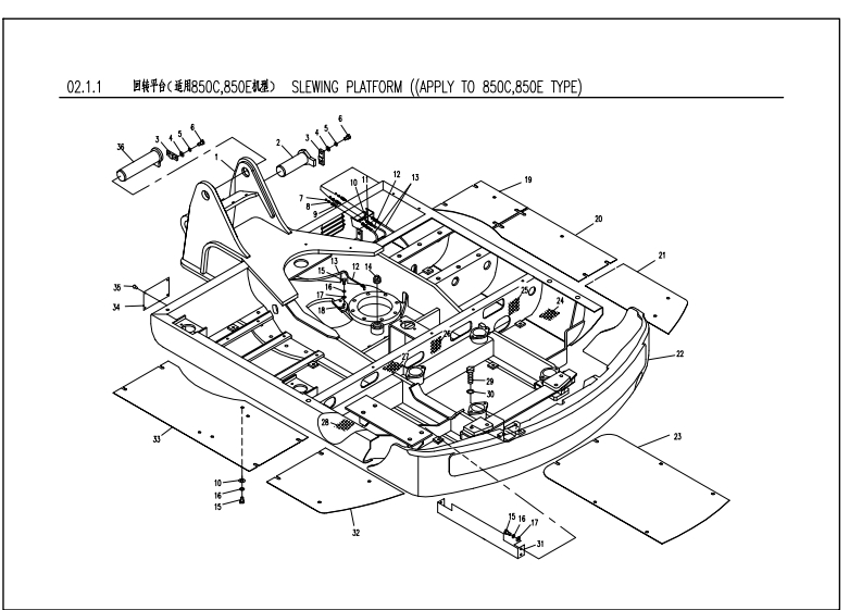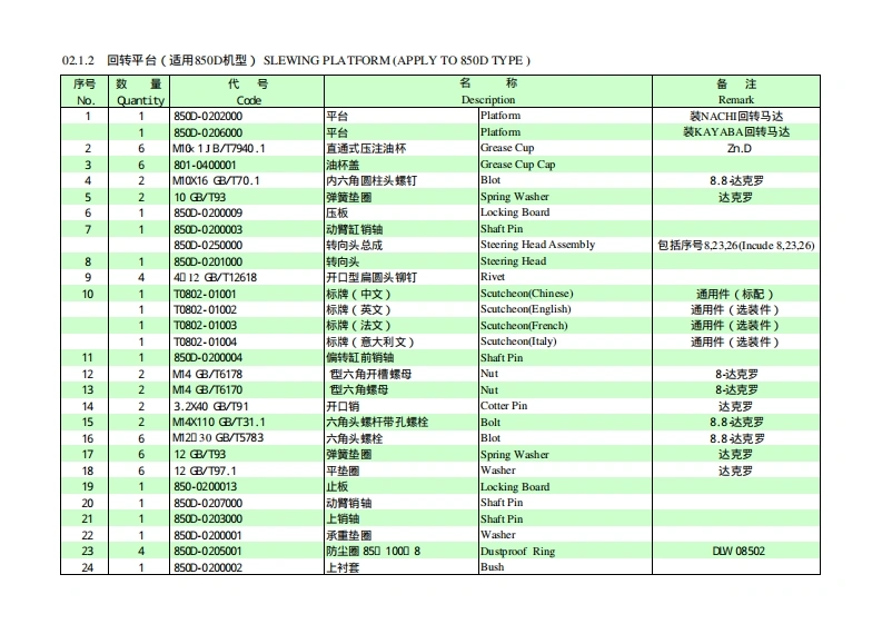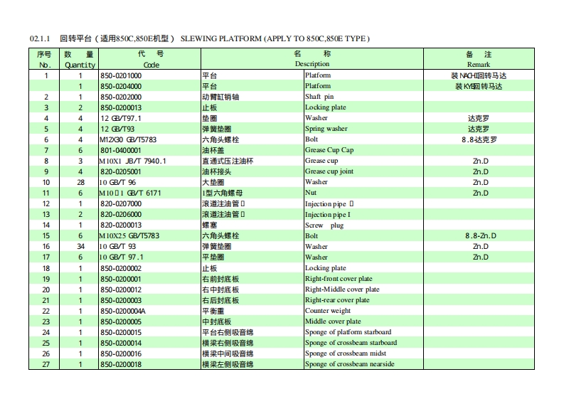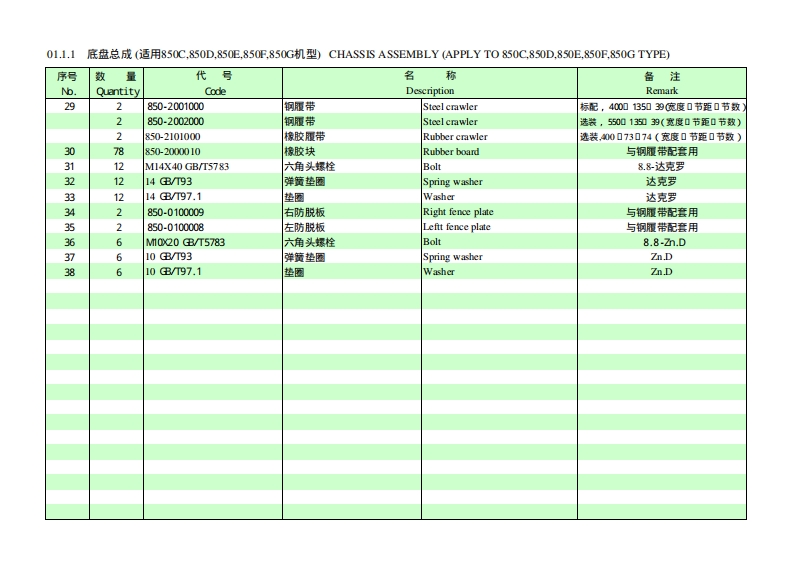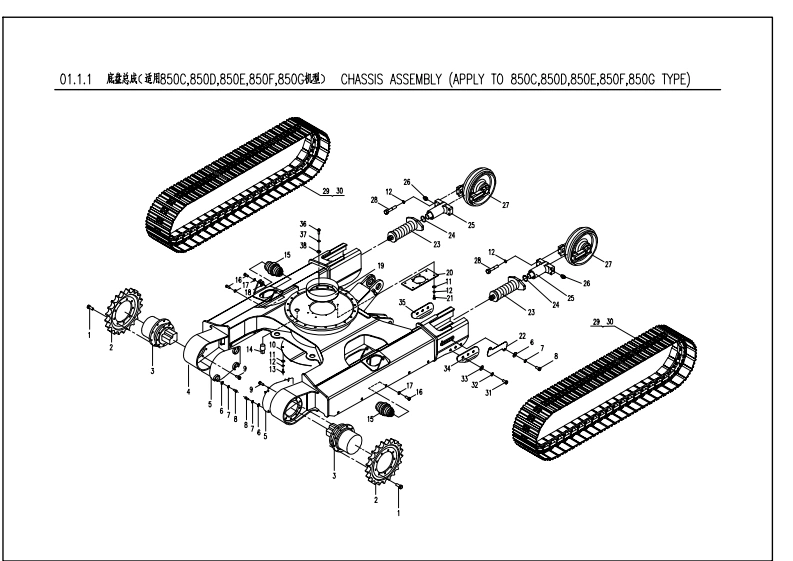 01.1.1底盘总成(适用850C,850D,850E,850F,850G机型CHASSIS ASSEMBLY(APPLY TO850C,850D.850E.850F,850 G TYPE)序号数量代号名称备注No.QuantityCodeDescriptionRemark124M14X35GBT5783六角头螺栓Bolt12.9达克罗22850-0100001驱动轮Driving wheel32850-7502000行走马达总成Traveling motor41850-0101000D车架总成Chassis assembly52850-0106000马达盖板Motor shield61210B/T97.1垫圈Washer达克罗1210GB/T93弹簧垫圈Spring washer达克罗812M10X20GB/T5783六角头螺栓Bolt8.8达克罗924M14X40GB/T5783六角头螺栓Bolt12.9氧化10人850-0107000封底板Cover plate11612GB/T97.1垫圈Washer121212GB/T93弹簧垫圈Spring washer136M12X30GBT5783六角头蟋栓Bolt8.8-h.D14人820-0100002蟋塞Screw plug1512850-0104000支重轮总成Idler assembly24M18X55 GB/T5783六角头螺栓Bolt10.9达克罗172418G⊕/T93弹簧垫圈Spring washer达克罗182-3850-0100004调整垫片Washer19850-0105000挡油圈组件Metal ring20人850-0100007托板Splint219M12D30GB/T5783六角头螺栓Bolt222850-0100006侧盖板Cover plate2850-0102200张紧弹簧总成Tension spring assembly24y850-0102230密封组件Sealed ring assembly252850-0102300张紧缸简总成Tension cylinder assembly262850-0102400单向阀总成Check valve assembly12850-0102100导向轮总成Track idler assembly284M12X65GB/T5783六角头螺栓Bolt10.9氧化
