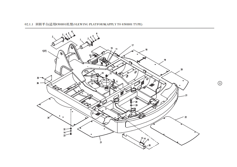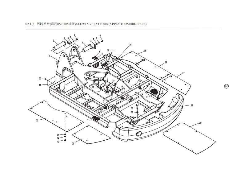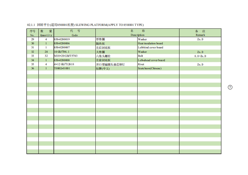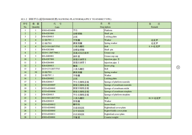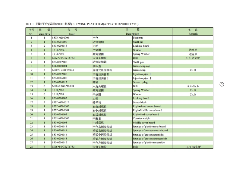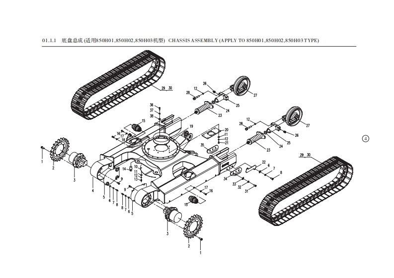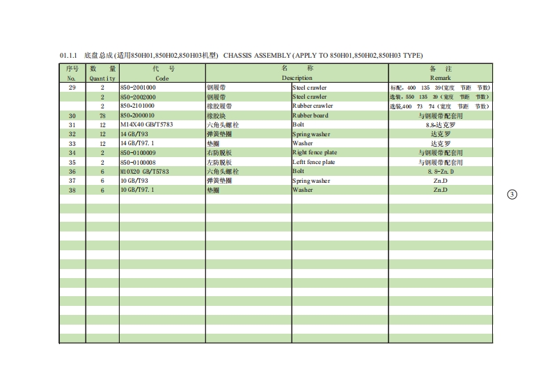 01.1.1底t总成(适用850H01,850H02,850H03机型)CHASSIS ASSEMBLY(APPLY TO850H0L,850H02,850H03TYPE)序号数量代号名称备注Na.Quant ityCodeDesc riptionRemark124M14X35GBT5783六角头螺栓Bolt12.9-达克罗22850-0100001驱动轮Driving wheel32850-752000行走马达总成Traveling motor4850-01010000车架总成Chassis assembly52850-0106000马达盖板Motor shield61210GB/T97.1垫圈Washer达克罗71210GB/T93弹簧垫圈Spring washer达克罗812M10X20 GB/T5783六角头螺栓Bolt8.8-达克罗924M14X40GB/T5783六角头螺栓Bolt12.9-达克罗101850-0107000封底板Cover plate11812GB/T97.1垫圈Washer121212GB/T93弹簧垫圈Spring washer138M12X30GB/T5783六角头螺栓Bolt8.8-2n.D141820-0100002螺塞Screw plug1512850-0101000支重轮总成Idler assembly1624M18X55GBT5783六角头螺栓Bolt10.9-达克罗172418 GB/T93弹簧垫圈Spring washer达克罗182-3850-0100004调整垫片Washer191850-0105000挡油圈组件Me由Iring201850-0100007托板Splint214M1230GB/T5783六角头螺栓Bolt222850-0100006侧盖板Cover plate232850-0102200张紧弹簧总成Tension spring assembly242850-0102230密封组件Sealed ring assembly252850-0102300张紧缸简总成Tension cylinder assembly262850-0102400单向阀总成Check valve assembly272850-012100导向轮总成Trackidler assembly284M12X65GBT5783六角头螺控Bolt10.9-达克罗