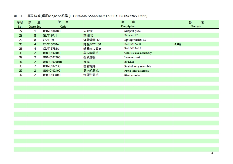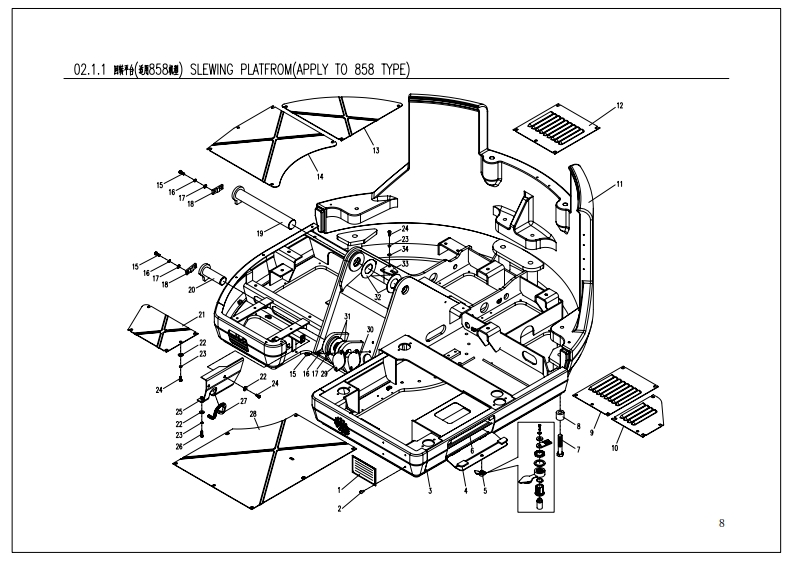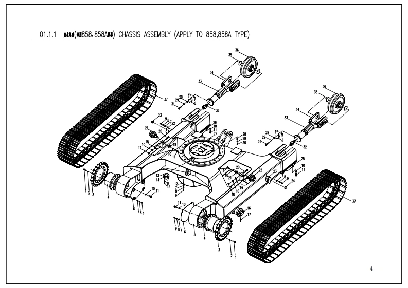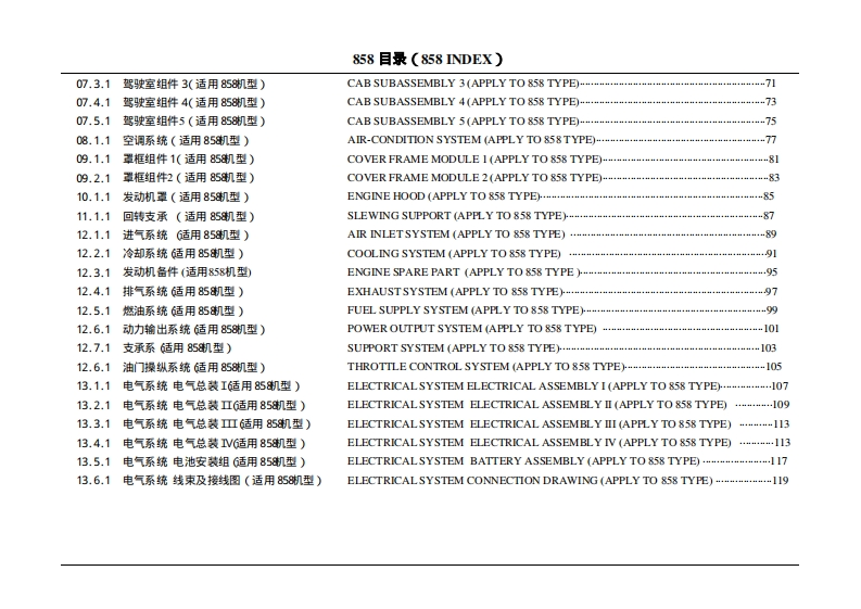 858目录(858NDEX)01.1.1底盘总成适用85机型)CHASSIS ASSEMBLY (APPLY TO 858 TYPE)..........02.1.1回转平台(适用85机型)SLEWING PLATFORM (APPLY TO 858TYPE)..…503.1.1推土装置适用85机型)DOZER EQUIPMENT (APPLY TO 858 TYPE).......04.1.1工作装置1(适用85机型)WORKING EQUIPMENT 1 (APPLY TO 858 TYPE)-04.2.1工作装置2(适用85机型)WORKING EQUIPMENT2(APPLY TO858TYPE)………l304.3.1工作装置3(适用85机型)WORKING EQUIPMENT 3 (APPLY TO 858 TYPE)-.....1504.4.1工作装置4(适用85机型)WORKING EQUIPMENT4(APPLY TO858TYPE)……………………………l704.5.1工作装置5(适用85机型)WORKING EQUIPMENT 5 (APPLY TO 858 TYPE)..........05.1.1平台部分液压系统1(适用85机型)HYDRAULICSYSTEM FOR PLATPORM I(APPLY TO858TYPE)-………2I05.2.1平台部分液压系统2(适用85机型)HYDRAULIC SYSTEM FOR PLATFORM 2(APPLY TO 858 TYPE).....305.3.1平台部分液压系统3(适用85机型)HYDRAULIC SYSTEM FOR PLATFORM3(APPLY TO858TYPE)………-2505.4.1平台部分液压系统4(适用85机型)HYDRAULIC SYSTEM FOR PLATFORM 4 (APPLY TO 858 TYPE).........205.5.1平台部分液压系统5(适用85机型)HYDRAULIC SYSTEM FOR PLATFORM 5(APPLY TO 858 TYPE).2905.6.1平台部分液压系统6(适用85机型)HYDRAULIC SYSTEM FOR PLATFORM6(APPLY TO858TYPE)………….3I05.7.1平台部分液压系统7(适用85机型)HYDRAULIC SYSTEM FOR PLATFORM 7(APPLY TO 858 TYPE)337乃.1.1底盘部分液压系统1(适用85机型)HYDRAULIC SYSTEM FOR CHASSIS1(APPLY TO858TYPE)………357乃.2.1底盘部分液压系统2(适用85机型)HYDRAULIC SYSTEM FOR CHASSIS 2 (APPLY TO 858TYPE)...3785.1.1先导部吩液压系统1(适用85凯型)HYDRAULIC SYSTEM FOR PILOT PART 1 (APPLY TO 858 TYPE).................3985.2.1先导部分液压系统2(适用85凯型)HYDRAULIC SYSTEM FOR PILOT PART 2 (APPLY TO 858 TYPE).......4385.3.1先导部分液压系统3(适用85凯型)HYDRAULIC SYSTEM FOR PILOT PART3(APPLY TO858TYPE)-……….4795.1.1工作装置的液压系统1(适用85机型)HYDRAULIC SYSTEM FOR WORKING EQUIPMENT 1 (APPLY TO 858 TYPE)...........5195.2.1工作装置的液压系统2(适用85机型)HYDRAULIC SYSTEM FOR WORKING EQUIPMENT 2 (APPLY TO 858 TYPE).......-5306.1.1操纵机构1(适用85机型)CONTROL FRAMEWORK1(APPLY TO858TYPE)……………5506.1.2操纵机构2(适用85机型)CONTROL FRAMEWORK2(APPLY TO858TYPE)…………5g07.1.1驾驶室组件1(适用858机型)CAB SUBASSEMBLY I(APPLYTO858 TYPE)...........6307.2.1驾驶室组件2(适用858机型)CAB SUBASSEMBLY 2(APPLY TO 858 TYPEY67