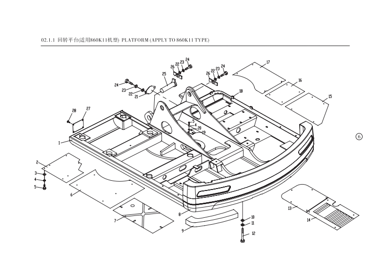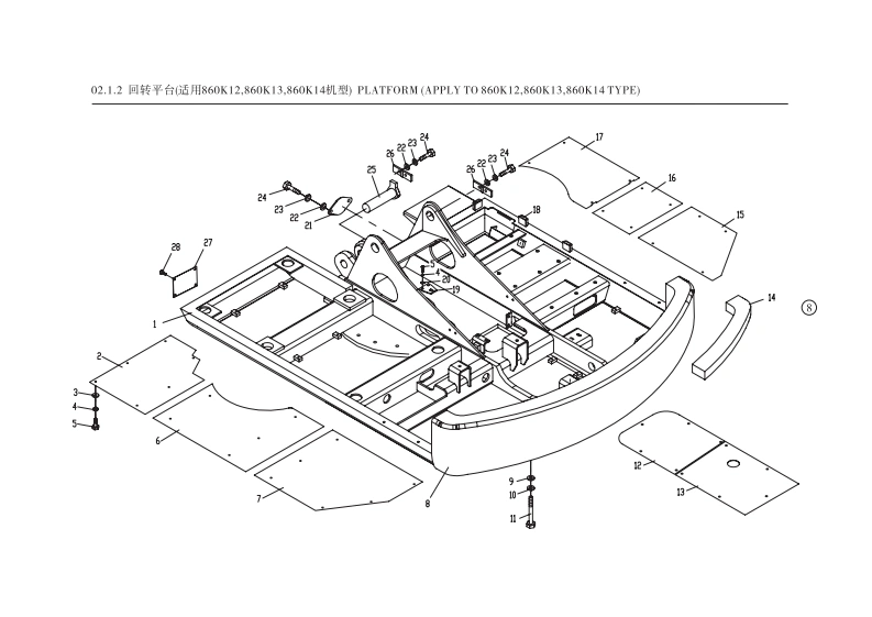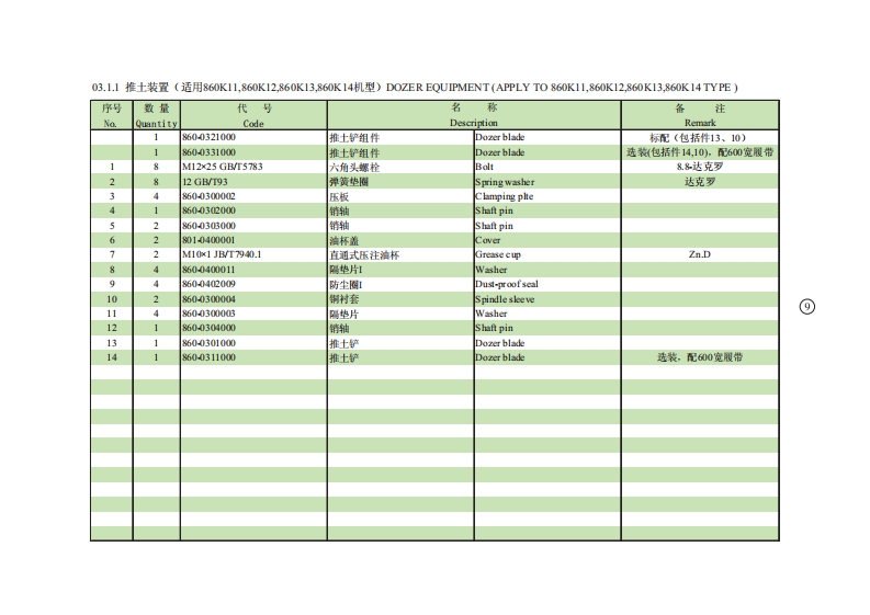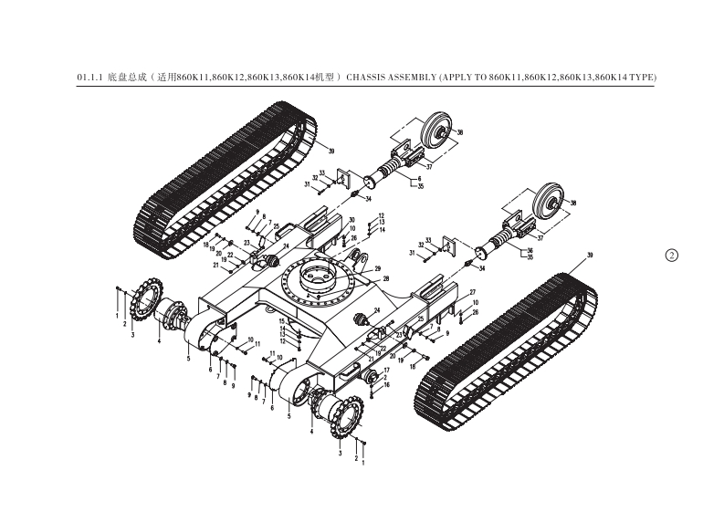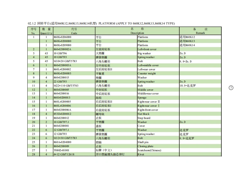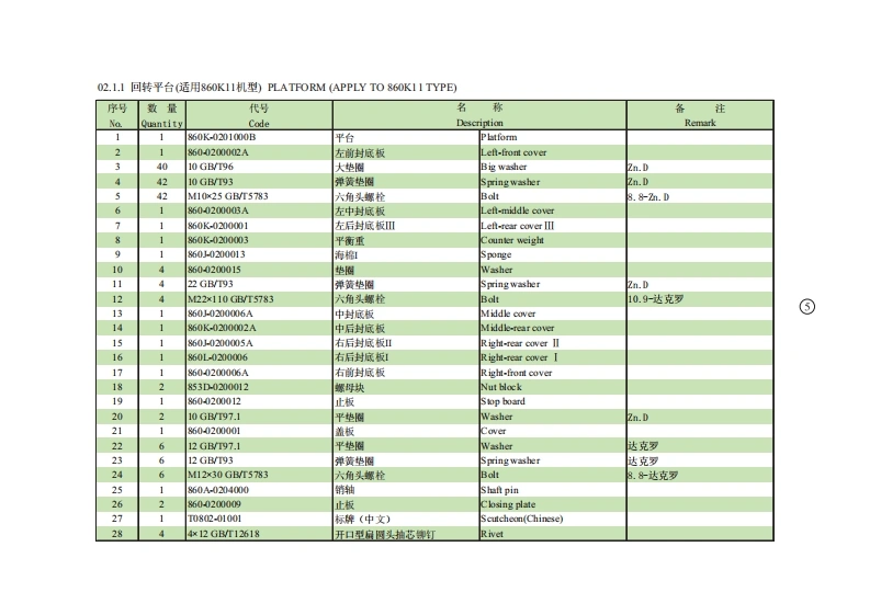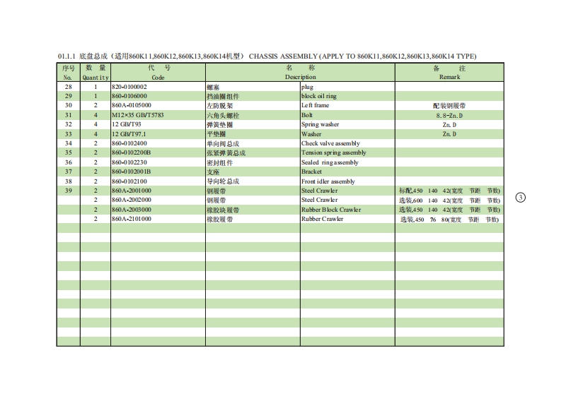 01.L.1底t总成(适用860K11,860K12,860K13,860K14机型)CHASSIS ASSEMBLY(APPLY TO0860K11,860K12,860K13,860K14TYPE序号数量代号名称备注No.Quant ityCodeDescriptionRemark124M14K45GB/T5783六角头螺栓Bolt10.9-达克罗27214 GB/T 93弹簧垫圈Spring washer达克罗32860-0100001B驱动轮Driving wheel860-.7508000行走马达Traveling molorMHI,KAYABA/帝人5860A-0101000B车架总成Chassis assemblyKAYABA/帝人860A-0110000B车架总成Chassis assemblyNACHI62860-0107000行走马达盖板Trave ling molor's cover plate7210GBT97.1平垫圈Washer达克罗81210 GB/T93弹簧垫圈Spring washer达克罗912M1020GB/T5783六角头螺栓Bolt8.8-达克罗103216GBT9第弹簧垫圈Spring washer2n.D1124M16×40GB/T5783六角头螺栓Bolt10.9-达克罗1212M10×20GB/T5783六角头螺栓Bolt8.8-Zn.D10 GB/T93弹簧垫圈Spring washer2n.D14正10GB/T97.1平垫圈Washer2n.D1860-0108000封底板Chassis cover pla能648M14x60GBT5783六角头螺栓Bolt129-达克罗17860-010S000B支重轮总成Idler assembly18M16x40GBT5783六角头螺栓Bolt10.9-达克罗1916GBT9第弹簧垫圈Spri血g washer达克罗202860-0100007挡板block ring212M16GB/T61701型六角螺母Nut8-达克罗22316GBT97.1平垫圈Washer达克罗23M16x90GB/T5782六角头螺栓Bolt10.9-达克罗2860-0104000托轮总成Upper roller assembly2860-0100002侧盖板side cover plte2612M16x40GB/T5783六角头螺栓Bolt8.8-2n.D272860A-0106000右防脱架Right frame配装钢限带