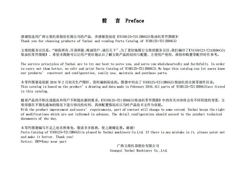 广西玉柴重工Yuchai-YC6B125-T21发动机柴油机零部件图册备件目录手册找手册网12天前发布关注私信1.12MB68页040广西玉柴重工Yuchai-YC6B125-T21发动机柴油机零部件图册备件目录手册此内容为付费资源,请付费后查看¥29¥31黄金会员免费钻石会员免费登录购买付费资源 第1页 / 共68页 第2页 / 共68页 第3页 / 共68页 第4页 / 共68页 第5页 / 共68页 第6页 / 共68页 第7页 / 共68页 第8页 / 共68页 第9页 / 共68页 第10页 / 共68页 试读已结束,还剩58页,您可下载完整版后进行离线阅读 THE END徐工/玉柴/Nifty/TCM 文本预览 YC6B125-T21(BB6G3)柴油机零件图册Parts Catalog of YC6B125-T21(BB6G3)Diesel Engine广西玉柴机器股份有限公司Guangxi Yuchai Machinery Co.,Ltd.2016年2月February,2016 查看更多 收起部分 喜欢就支持一下吧收藏