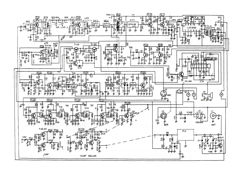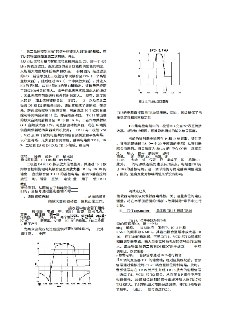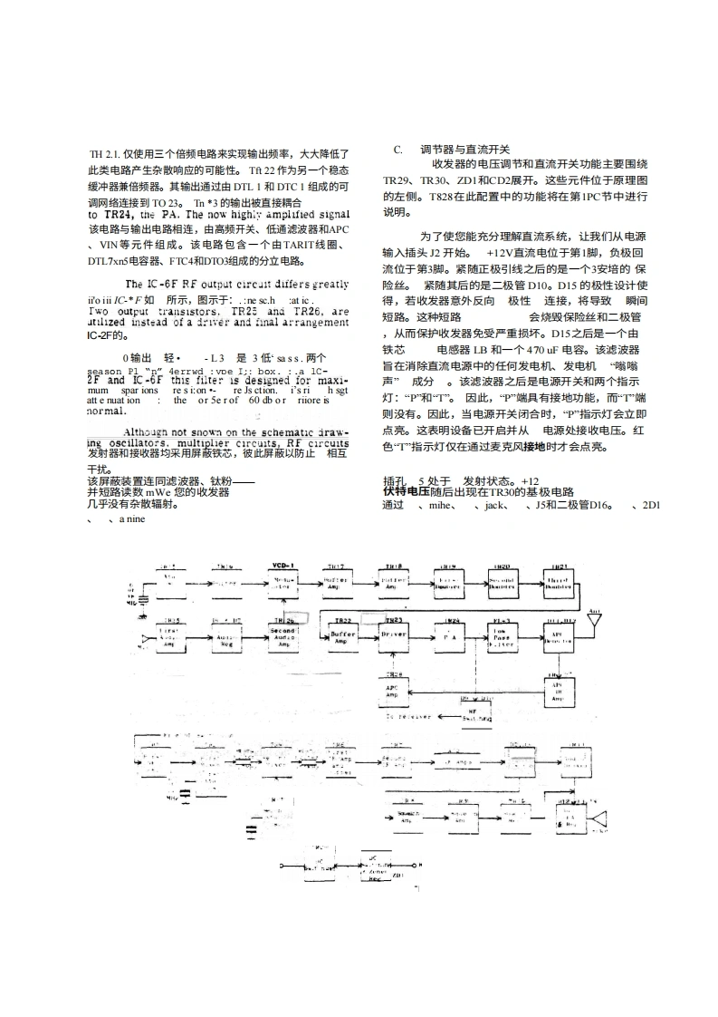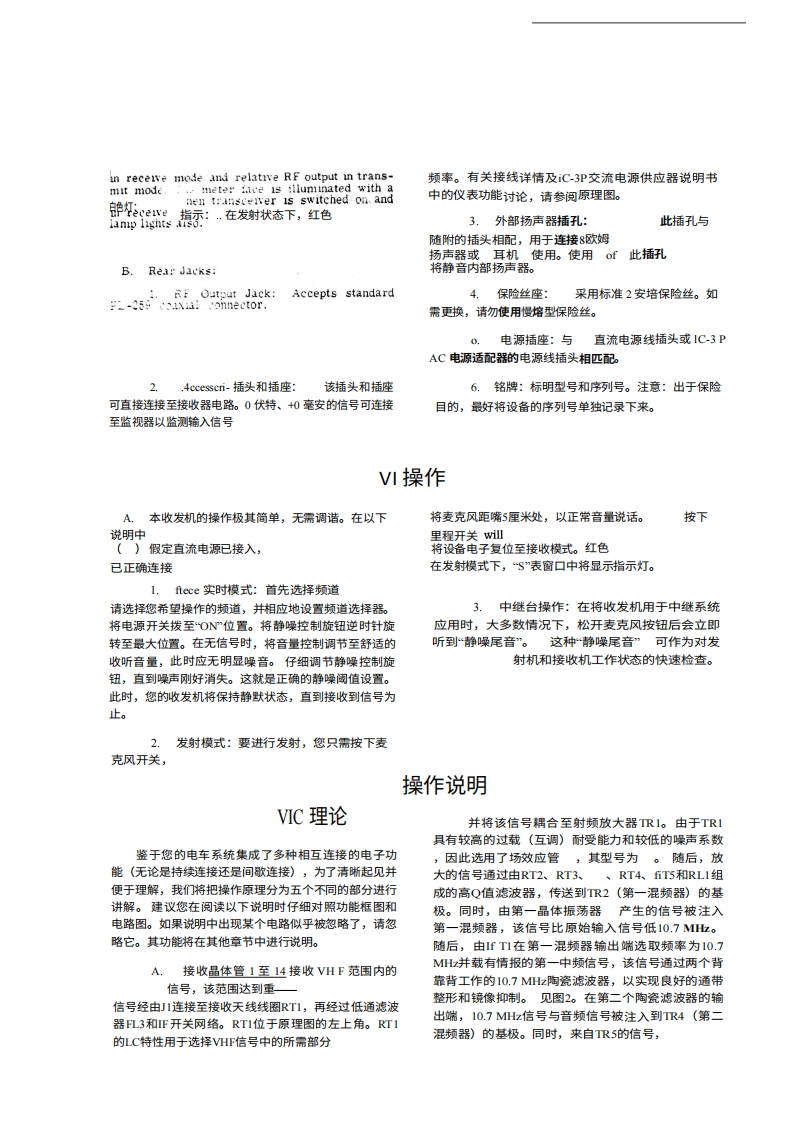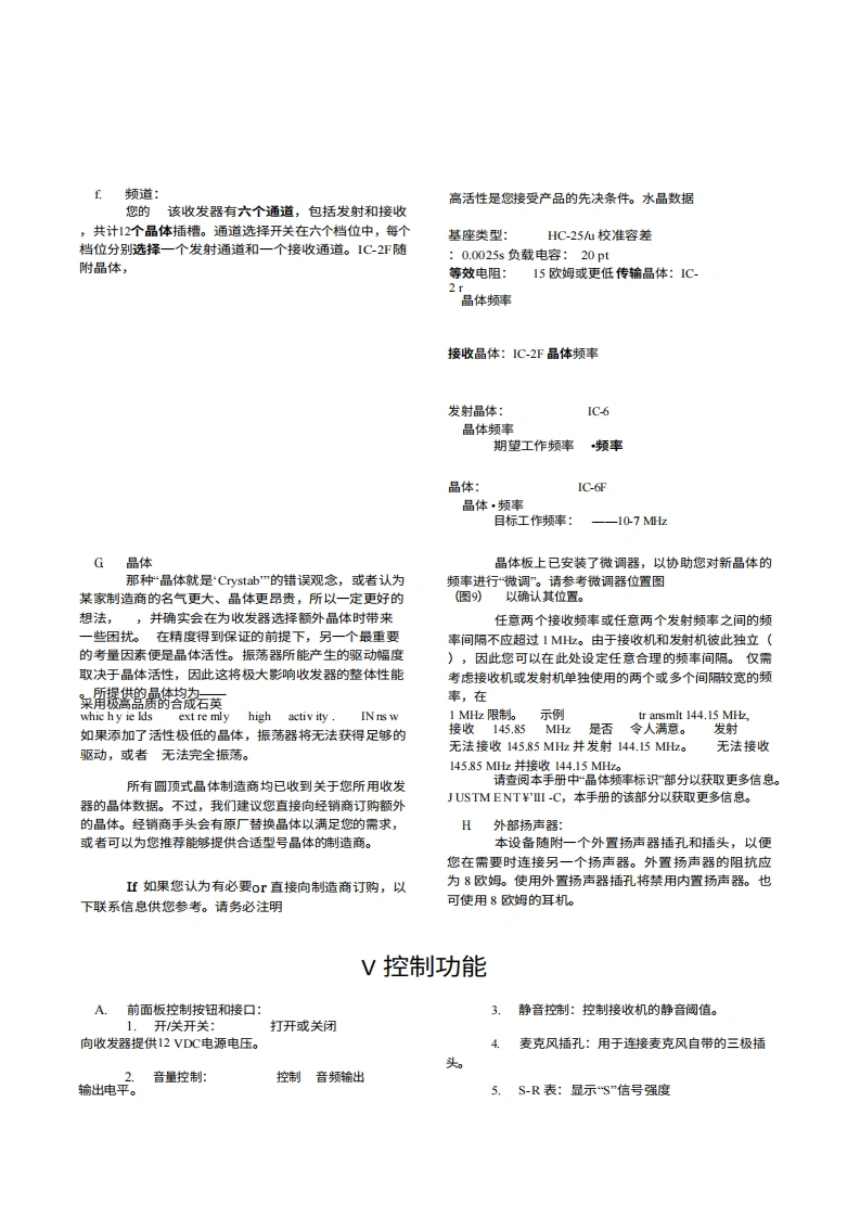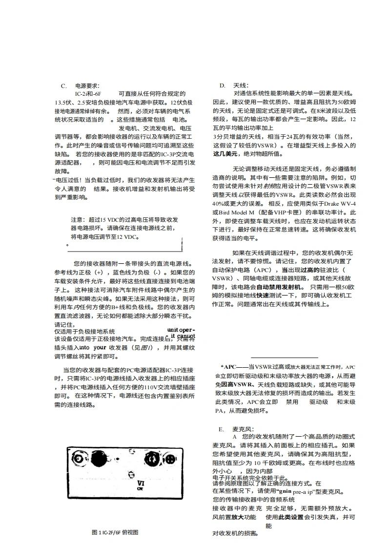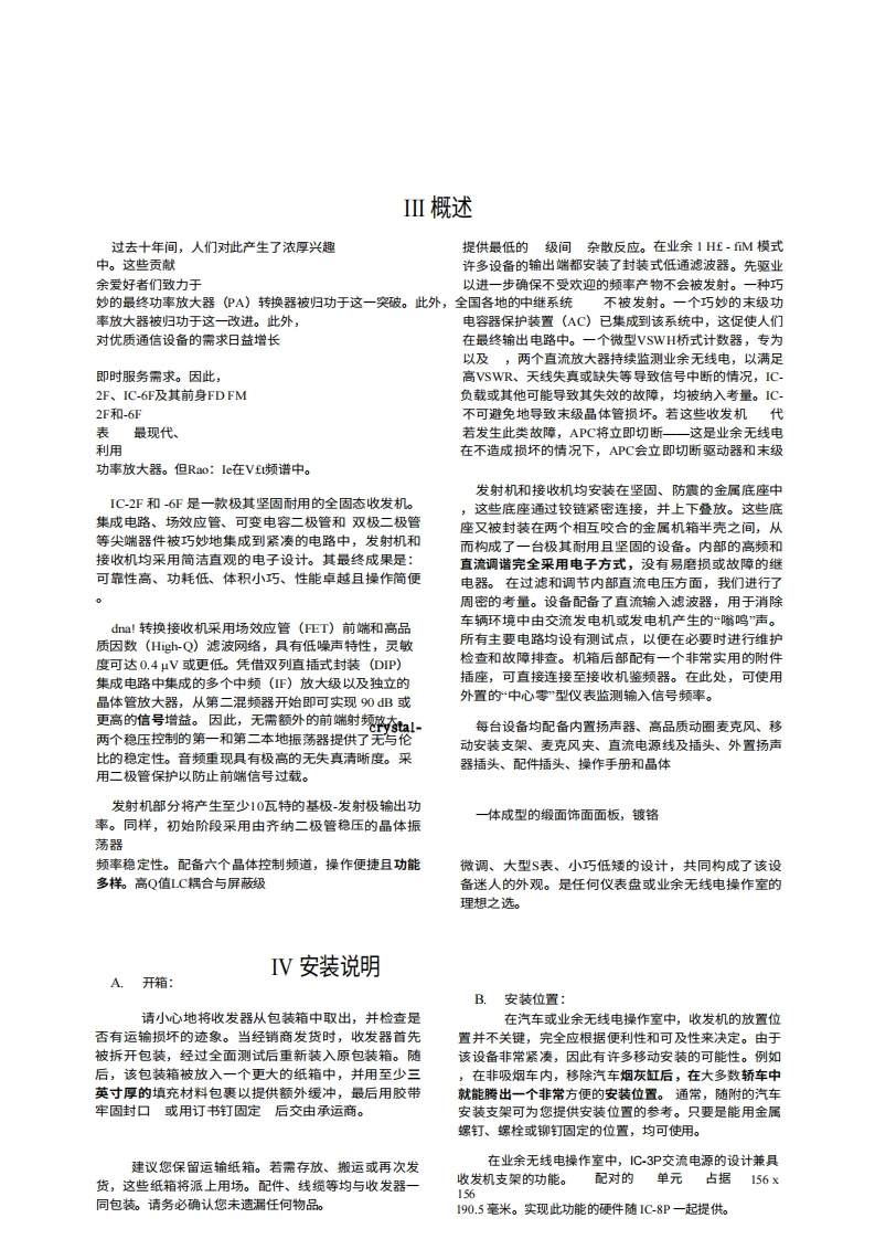 I引言Inoue IC-2F2米波段FM收发机及其6米波段的对应机型IC-6F,是目前市面上面向VHF-HP业余无线电爱好者推出的最成熟的产品。在工程、设计、制造或性能方面,我们未做任何妥协。该系列设备完全采用固态技术,代表了最先进的技术水平。此外,还融入了许多旨在提升便利性和卓越性能的新创新。我们建议ON您花些时间仔细阅读本手册的内容,并熟悉这款非凡的收发机。您可以确信,未来将享受无数小时无故障的操作乐趣,并因拥有最优秀的产品而倍感自豪。Ⅱ技术规格,频率覆盖范围:IC-2f,,144至148M;1C-6,,50至54M2注:建议任意两个接收频率或任意两个发射频率之间的最大频率间隔为1MH。共提供六个频道。尺寸:高58毫米×宽156毫米×深216毫米。2千克重量:前面板控制按钮和接口:频道选择开关、电源开关、音量控制、静噪控制、麦克风接口。后置接口:天线插孔、配件插座、外置扬声器插孔、保险丝盒、电源天线输入:插座。电源要求:电流范围:50 to 52 ohms13.5VDC+1.5VDC,负极接地;接收平均电流-125m4;发射电流-2.5ARAC',Nt技术规格:类型:双转换灵敏度:优于G.l.XIV,静噪度20dB"inst E'10.3dB455 XBz散响应:-60dB静噪值:可调-5至-15dB+15kHz6dB点出功率1瓦输出阻抗:8欧姆频率控制:品体振荡器(45MHz)发射器规格说明:输入功率:20瓦最大输出功率:10瓦最低频率控制品体(18MHz)最大频率偏差:可调至15千赫音频输入:10K注:按照惯例,所列规格仅为可预期的最低性能指标。用户实际获得的性能往往更优,例如,同一台设备可能达到0.1yV的接收灵敏度或14瓦的输出功率。uc-52
