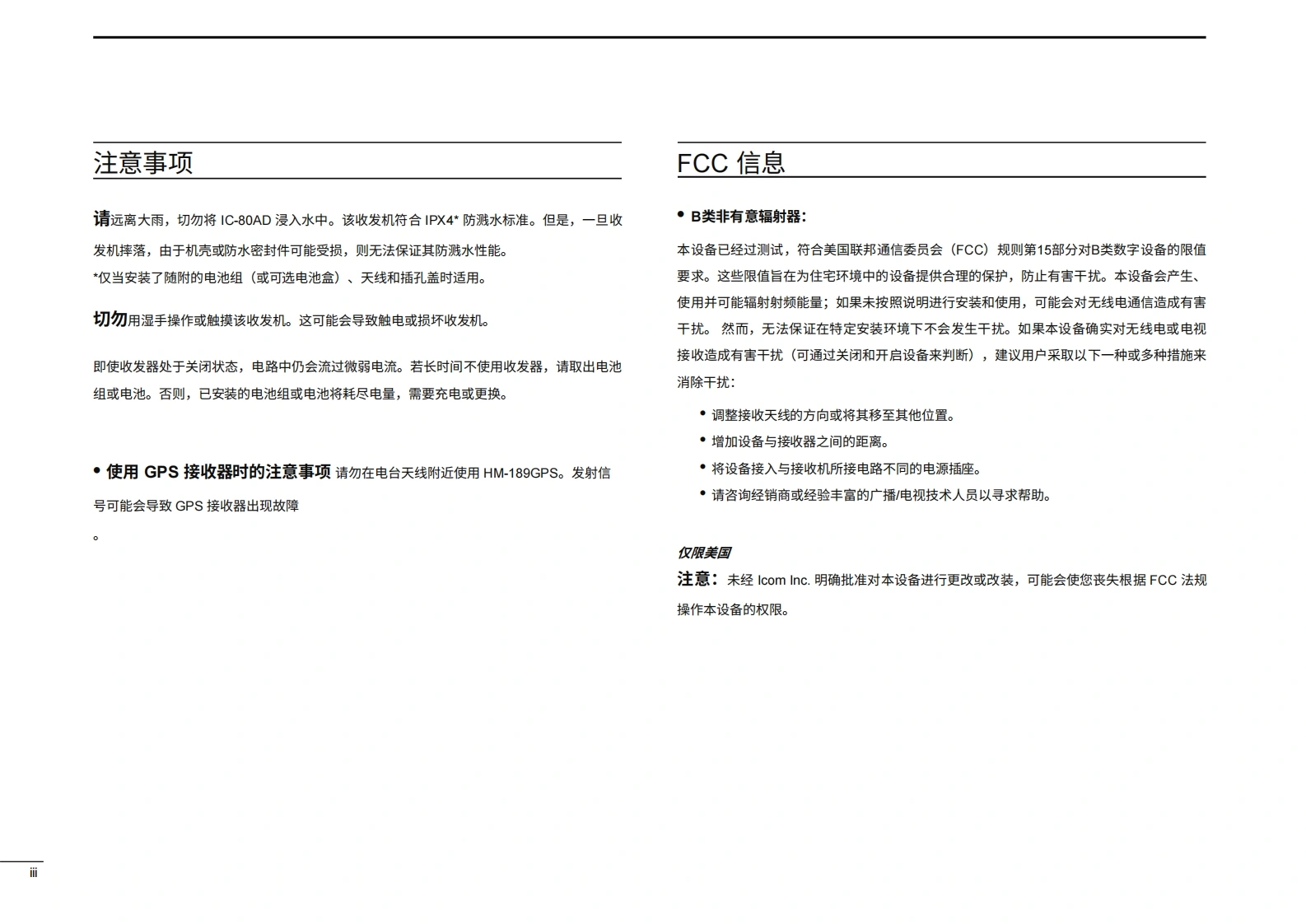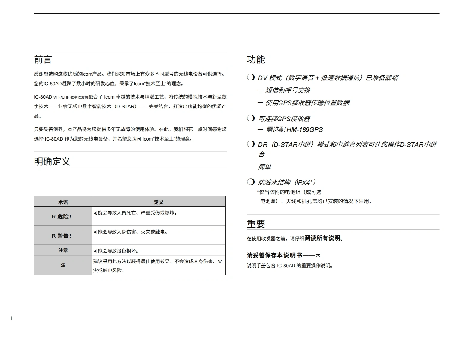 ICOM艾可慕IC-80AD_user操作说明书手册20260331中文版找手册网11天前发布关注私信13.48MB191页041ICOM艾可慕IC-80AD_user操作说明书手册20260331中文版此内容为付费资源,请付费后查看¥19¥21黄金会员免费钻石会员免费登录购买付费资源 第1页 / 共191页 第2页 / 共191页 第3页 / 共191页 第4页 / 共191页 第5页 / 共191页 第6页 / 共191页 第7页 / 共191页 第8页 / 共191页 第9页 / 共191页 第10页 / 共191页 试读已结束,还剩181页,您可下载完整版后进行离线阅读 THE END艾可慕 文本预览 @com使用说明书VHF/UHF数字收发机i8O△DCOMit-89了本设备符合美国联邦通信委员会(FCC)规则第15部分的规定。使用本设备须遵守以下两项条件:(1)本设备不得造成有害干扰;(②)本设备必须接受任何接收到的干扰,包括可能导致意外运行的干扰。警告:根据F℃C规则和联邦法律,禁止对本设备进行改装以接收蜂窝无线电电话服务信号。Icom Inc.⊙④D-STAR回图图四图图因■图圆团四图 查看更多 收起部分 喜欢就支持一下吧收藏