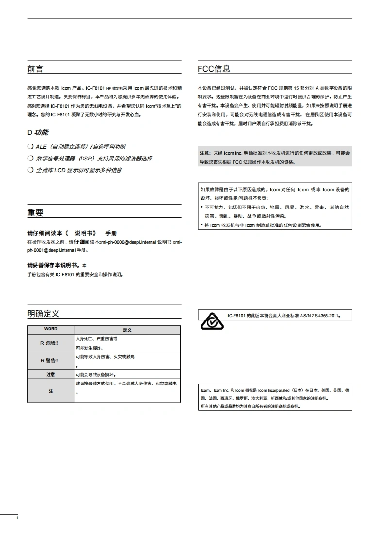 艾可慕Icom_IC-F8101_ALE_enhanced_versions_使用说明书手册_201820260331中文版找手册网11天前发布关注私信10.11MB109页036艾可慕Icom_IC-F8101_ALE_enhanced_versions_使用说明书手册_201820260331中文版此内容为付费资源,请付费后查看¥19¥21黄金会员免费钻石会员免费登录购买付费资源 第1页 / 共109页 第2页 / 共109页 第3页 / 共109页 第4页 / 共109页 第5页 / 共109页 第6页 / 共109页 第7页 / 共109页 第8页 / 共109页 第9页 / 共109页 第10页 / 共109页 试读已结束,还剩99页,您可下载完整版后进行离线阅读 THE END艾可慕 文本预览 icom使用说明书高频收发机iF81011C-F8101本设备符合美国联邦通信委是会:C)规则第15部分的规定。使用本设备鸭保不会造成有害干扰。Icom Inc. 查看更多 收起部分 喜欢就支持一下吧收藏