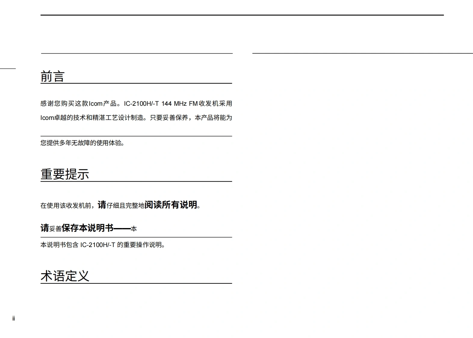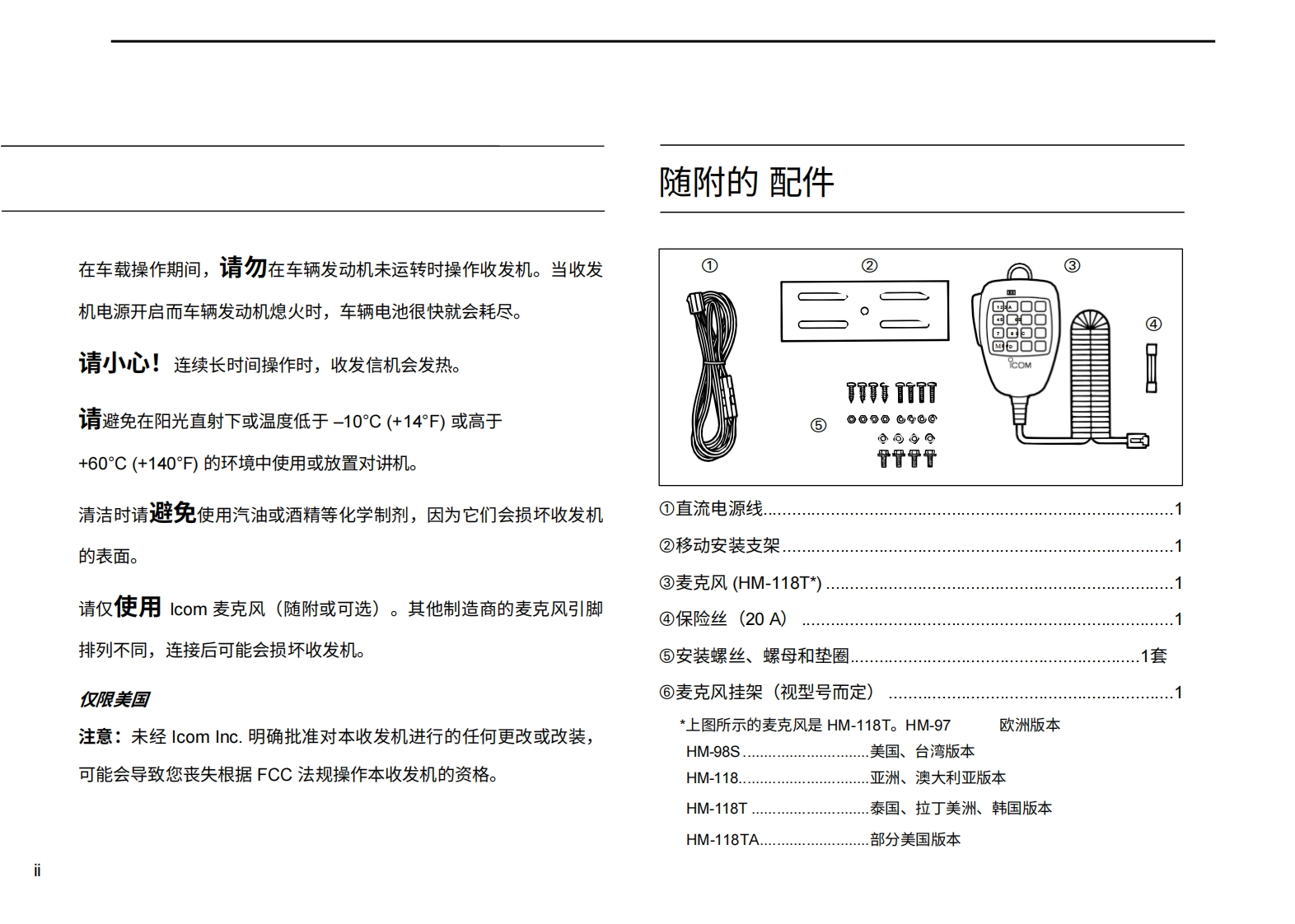 ICOM艾可慕IC-2100H_user操作说明书手册20260331-中文版找手册网11天前发布关注私信3.65MB120页028ICOM艾可慕IC-2100H_user操作说明书手册20260331-中文版此内容为付费资源,请付费后查看¥19¥21黄金会员免费钻石会员免费登录购买付费资源 第1页 / 共120页 第2页 / 共120页 第3页 / 共120页 第4页 / 共120页 第5页 / 共120页 第6页 / 共120页 第7页 / 共120页 第8页 / 共120页 第9页 / 共120页 第10页 / 共120页 试读已结束,还剩110页,您可下载完整版后进行离线阅读 THE END艾可慕 文本预览 ?com使用说明书144 MHz FM收发机联水您了不田稀本设备符合FCC规则第15部分的规定。其运行须满足以下两个条件:(1)本设备不得造成有害干扰;(2)本设备必须接受所接收到的任何干扰,包括可能导致意外运行的干扰。 查看更多 收起部分 喜欢就支持一下吧收藏