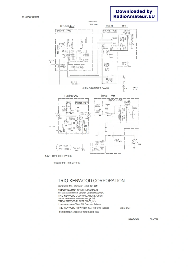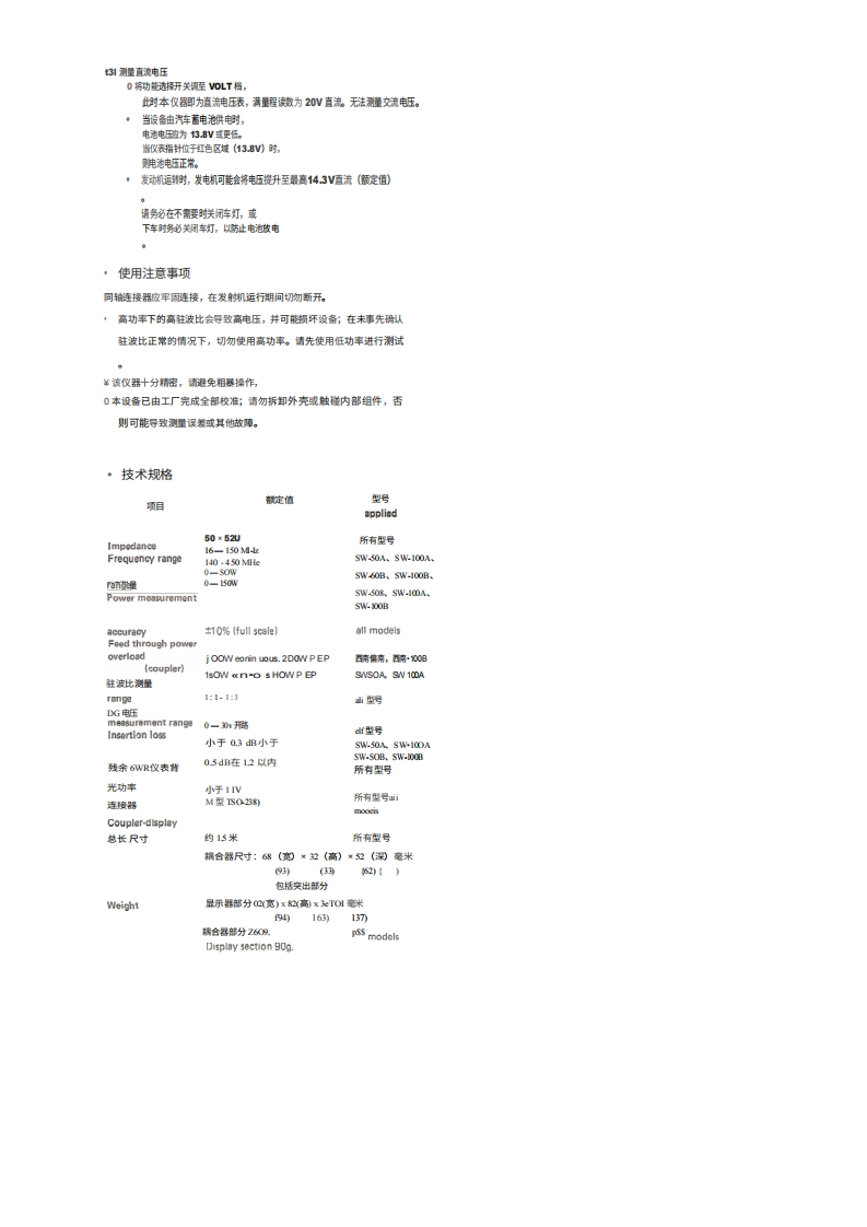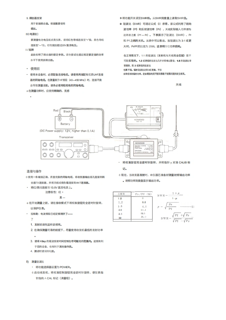 KENWOOD中波-短波/西北-中央频段驻波此功率表Downloaded byRadioAmateur.EU■Features这款直通式驻波比功率表可在宽频范细内进行测量,6虽然体积小巧,但可测量驻波此射频功率和电池电旺,并配有空中指示灯和夜问照明。:祸合器和显示单元可以分离。显示单元可以安装在任何方便的地方液的显示单元将改善因定台的操作,也可安装在移动台中。·部件名称及其功能(图示:以SW-50A作为典型示例1(后面板610110KENWOOD0KENIYOODE6-150sw-100l5W-50十TRO-KENNOOO CORPORATION(显示单位)(coupler)5278婊5可调节斜安装支架全量程cCae偏转指示SOW下的RF功率(gW5OAWB)或这有于联示器,井防便地调整示器韵位置。撕下支架底部粘放条上的保护藻,将兴贴站在所需位置。安装支架上还设有两个孔,因此也可以用螺丝进行西定150W(SW100AWB),以及最高20w的直流电压。该仪表可。拧紧支架侧贡的螺丝,即可调整显示的视角开启背光以供夜问操作功能选择器Lamp switch用于选择功率、驻波此或电压。控制仅表背光电源。如果此开关长时间保特开启状态,电池会放电。正常使8校准控制用时,请将其置于0FF位置。在测量驻波比时,此旋钮用于调节仪表的灵敏度TX连接器此UHF连接器应连接蛭:1收发器输出插孔。。当此旋钮完全逆时针旋转时@天线连接器当w阳和tranSmiTt8r处于开启状态时,该仪表将作为功率计使此UHF连接应诗接至天线用,报负载。4在线指示灯当射频输出功率达到3W或更高时,此指示灯点亮;亮度随输出电平增加,并在SSB模式下“闪烁。